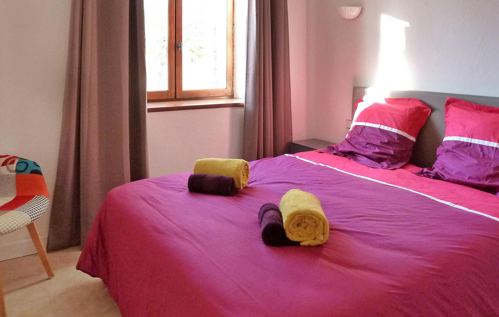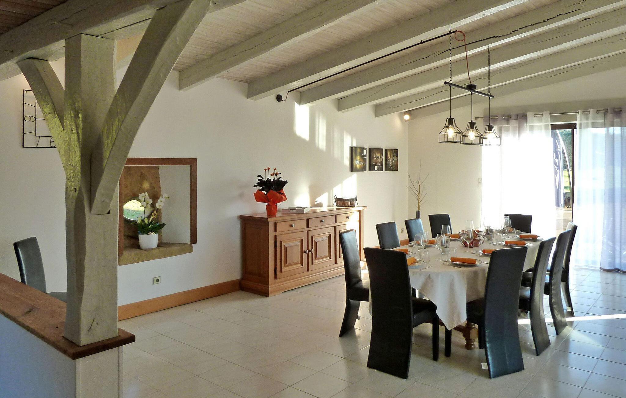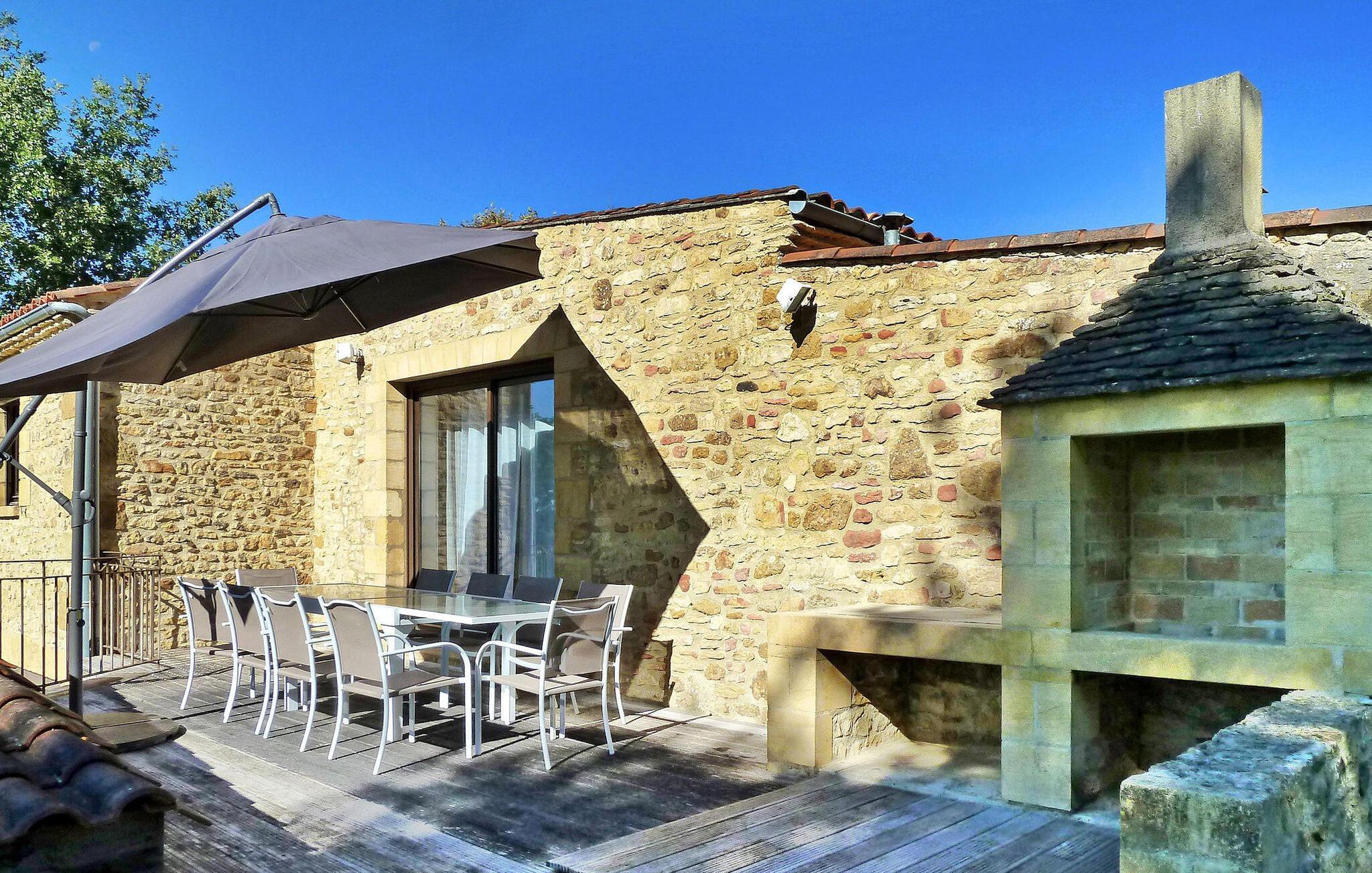 Beliggende i Dordognes fredfyldte landskab nyder dette rummelige stenhus med et moderne interiør ro og smuk udsigt. Huset består af forskellige områder til afslapning og komfort. Når du kommer ind, er der et veludstyret køkken med moderne bekvemmeligheder og et fransk vindue, der fører til en terrasse. Træd op til opholdsstuen, som kan prale af en spiseplads sammen med en karnap, der åbner ud til en anden terrasse og et opholdsområde, perfekt til hyggelige aftener. Udendørs har ejendommen stor grund med frodige græsplæner og en fantastisk udsigt over landskabet. Der er private terrasser udstyret med udendørsmøbler, herunder en pergola, der støder op til køkkenet og en stengrill nær opholdsområdet. Poolhuset har en udendørs lounge og et barområde. Den opvarmede private pool, (9m x 4m og 1,4m - 1,6m dyb), er sikret med en dykkeralarm og omgivet af en træterrasse og syntetisk tæppe. Derudover tilbydes faciliteter såsom liggestole, lænestole og et bordtennisbord til din fritid. Huset ligger på landet, ganske afsondret omkring 11 km fra middelalderbyen Sarlat.