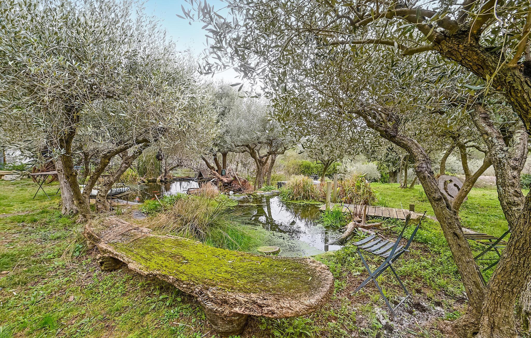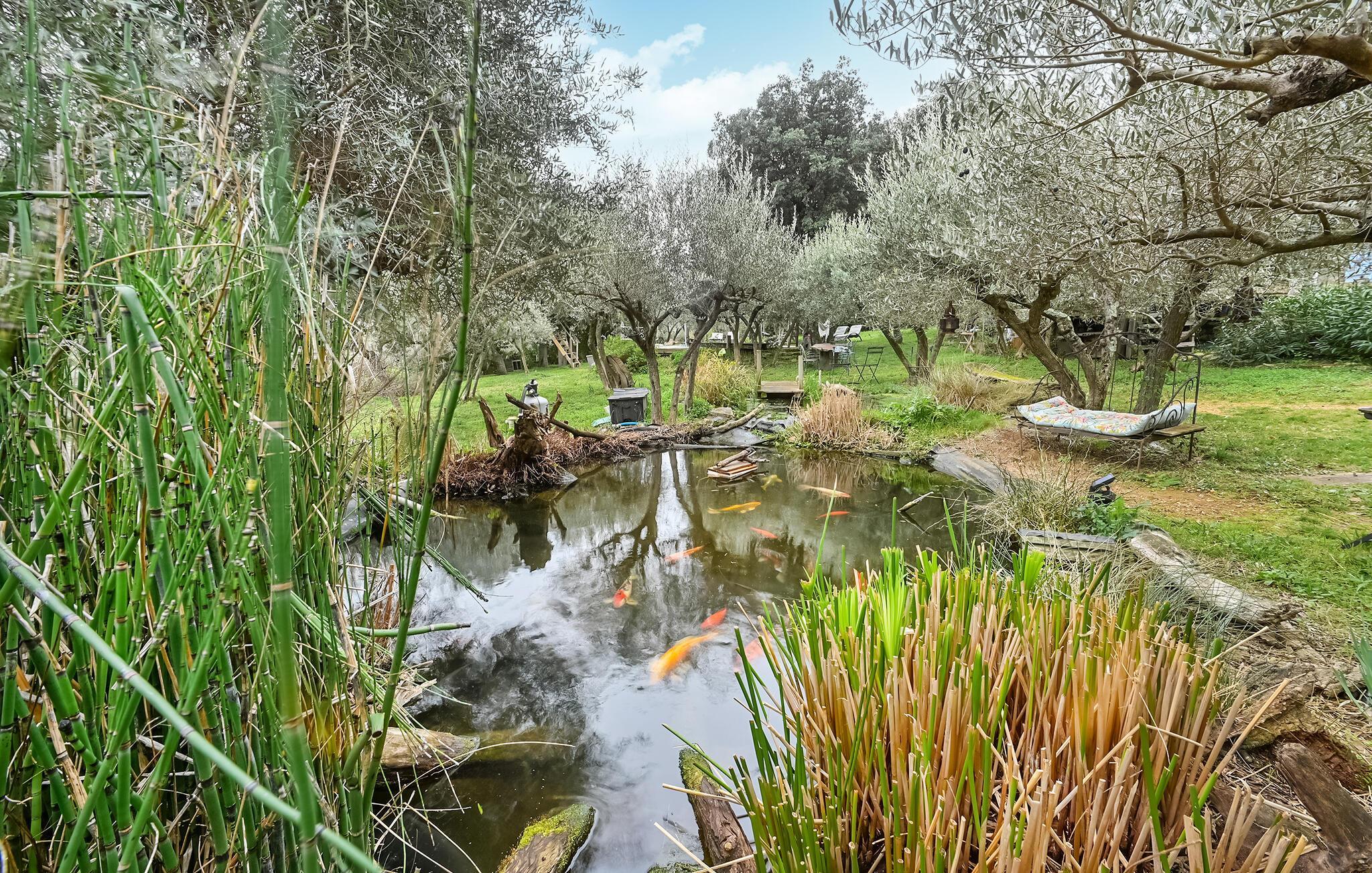 Udearealet består af tre terrasser med åben udgang til marken, så I nærmest føler jer i ét med naturen. Den centrale terrasse er yderst privat og udstyret med borde lavet af eksotisk træ. Poolen har en let skrånende nedgang, en træponton og lækkert vand, som I kan køle jer dejligt af i. Personalet sørger for, at poolen er ren og sikker. Den lille dam ved siden af ??poolen er hjemsted for karper og ænder, og terrasserne byder på dejligt skyggefulde oliventræer og stenege.