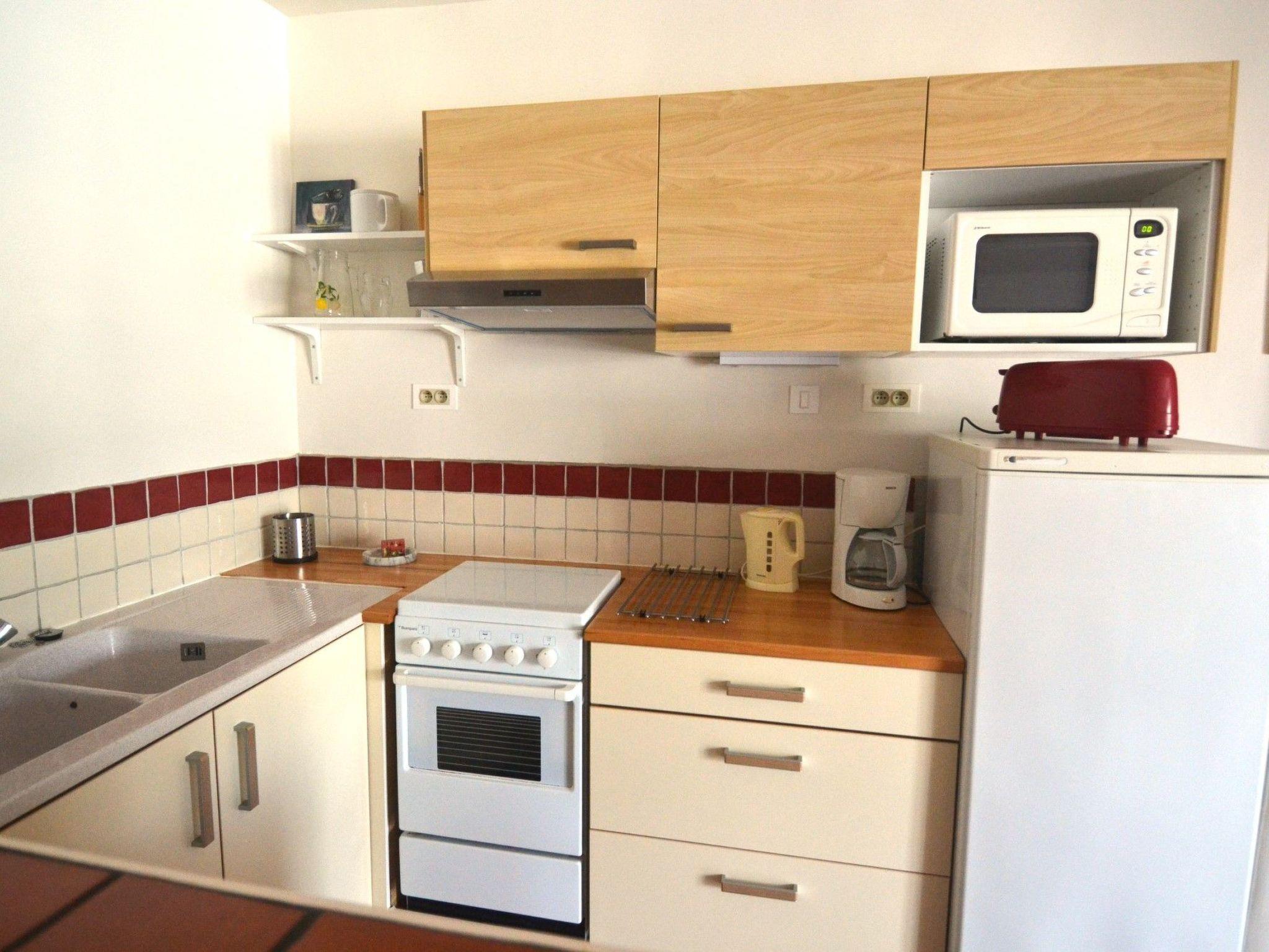 This spacious gite for five people offers 72m² of living space on two floors. The ground floor has a spacious living room, a well-equipped open-plan kitchen with dishwasher, vitroceramic hob, microwave, fridge-freezer, coffee machine, kettle, toaster and plenty of crockery and cutlery, and a separate storage room. The upper floor has a bedroom with a double bed and a bedroom with two single beds, as well as a separate toilet and a bathroom with a shower and a sink.