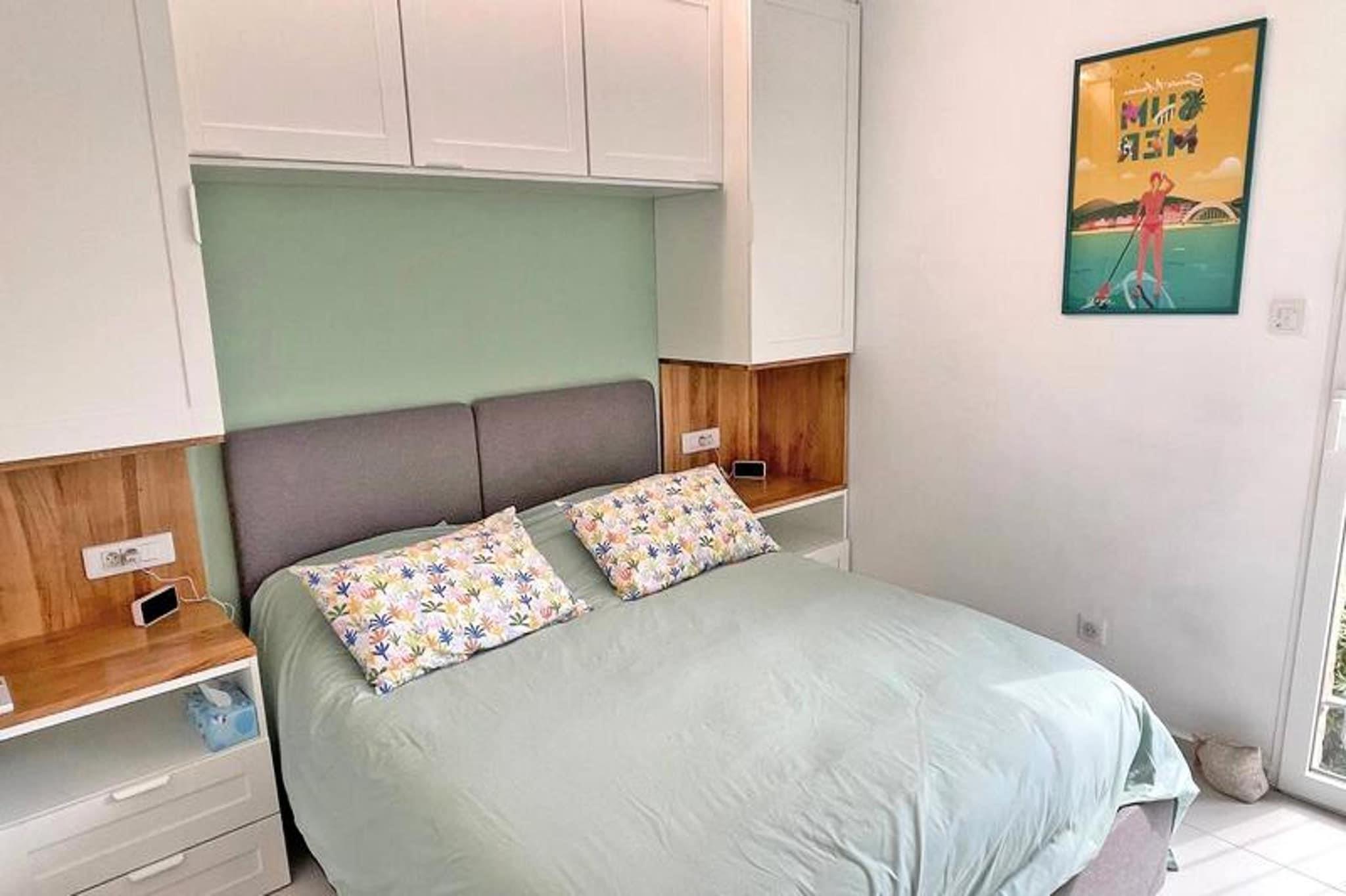 Denne moderne 2-værelses lejlighed tilbyder et komfortabelt tilflugtssted for op til fire gæster. Den rummelige stue med aircondition har et opholdsområde med en 140 cm sovesofa, et fladskærms-tv og en spiseplads til fire personer, der alle fører ud til en privat terrasse. Det åbne køkken er fuldt udstyret med hvidevarer som køleskab, fryser, opvaskemaskine, ovn, mikroovn, kedel, brødrister og både en Nespresso kaffemaskine og filterkaffemaskine. Lejligheden har også et badeværelse med brusekabine, håndklædetørrer, vaskeskab og vaskemaskine, hvilket sikrer et bekvemt og afslappende ophold. Beliggende kun 700 meter fra både stranden og byens centrum, er lejligheden ideelt placeret til at nyde områdets attraktioner. Inden for gåafstand finder du et udvalg af caféer, butikker og markeder med lokale varer. Uanset om du ønsker at slappe af på stranden eller udforske den pulserende by, er alt hvad du behøver i nærheden, hvilket gør denne lejlighed til et fremragende valg for en familie eller venners ferie. Lejligheden byder også på yderligere bekvemmeligheder, herunder aircondition i både stue og soveværelse, Wi-Fi til fjernarbejde og en privat parkeringsplads med sikker adgang via en elektrisk port. Den solrige sydvendte terrasse er perfekt til at nyde udendørs måltider eller slappe af i den friske luft, med persienner på alle sider for ekstra privatliv. Kæledyr er ikke tilladt, hvilket sikrer et fredeligt ophold for alle gæster.