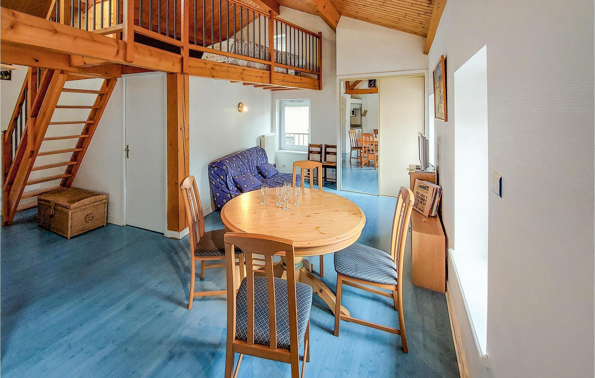 Jeres praktisk indrettede ferielejlighed egner sig godt til par eller små familier, der søger et enkelt udgangspunkt for aktiviteter i naturen. Den ligger i centrum af en rolig landsby i regionen Auvergne-Rhône-Alpes. Lejligheden er fordelt over to niveauer. Nederst finder I opholdsområdet med spisebord, tv og en sovesofa. Hyg jer, slap af efter en aktiv dag, eller tilbered enkle måltider i det lille tekøkken. En trappe i træ fører op til den åbne hems, der er et dejligt hyggested.