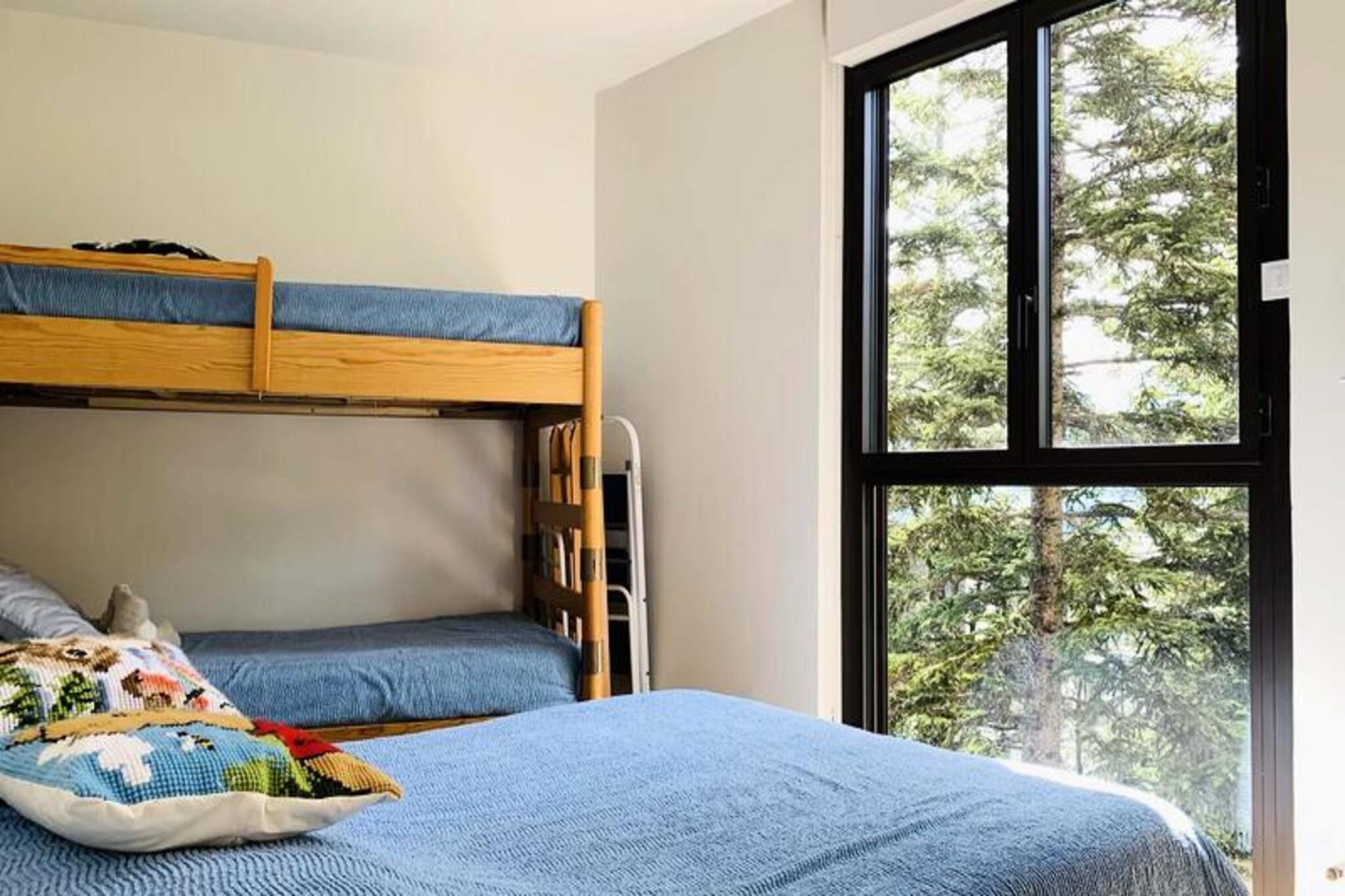 Denne rummelige lejlighed på 65 m² er ideel til familier eller grupper med plads til op til 6 personer. Den har to soveværelser: et med to enkeltsenge og det andet med en dobbeltseng og to enkeltkøjesenge. Lejligheden byder også på en stor stue med to sofaer, et tv og en dvd-afspiller. Bemærk venligst, at lejligheden er strengt røgfri og ikke tillader kæledyr. En privat parkeringsplads og en skiboks er til rådighed for din bekvemmelighed. Lejligheden ligger kun 40 meter fra pisterne og 20 meter fra indkøbscenteret og har en fremragende position for skientusiaster. Området tilbyder nem adgang til pisterne og lokale faciliteter. Gæsterne kan udforske de pulserende omgivelser med caféer, restauranter og butikker i nærheden, som tilbyder alt det nødvendige for en afslappende skiferie. Den smukke udsigt over dalen og skråningerne bidrager til denne ejendoms appel. Lejligheden indeholder et veludstyret køkken med elektriske kogeplader, en ovn, en opvaskemaskine, et køleskab, en mikrobølgeovn og en Nespresso kaffemaskine samt en raclettemaskine, fonduemaskine og crepemaskine til hyggelige aftener. Badeværelset har badekar, håndvask og vaskemaskine, med separat toilet for ekstra bekvemmelighed. Hjørnebalkonen tilbyder et fantastisk sted at nyde den omkringliggende udsigt over bjergene.