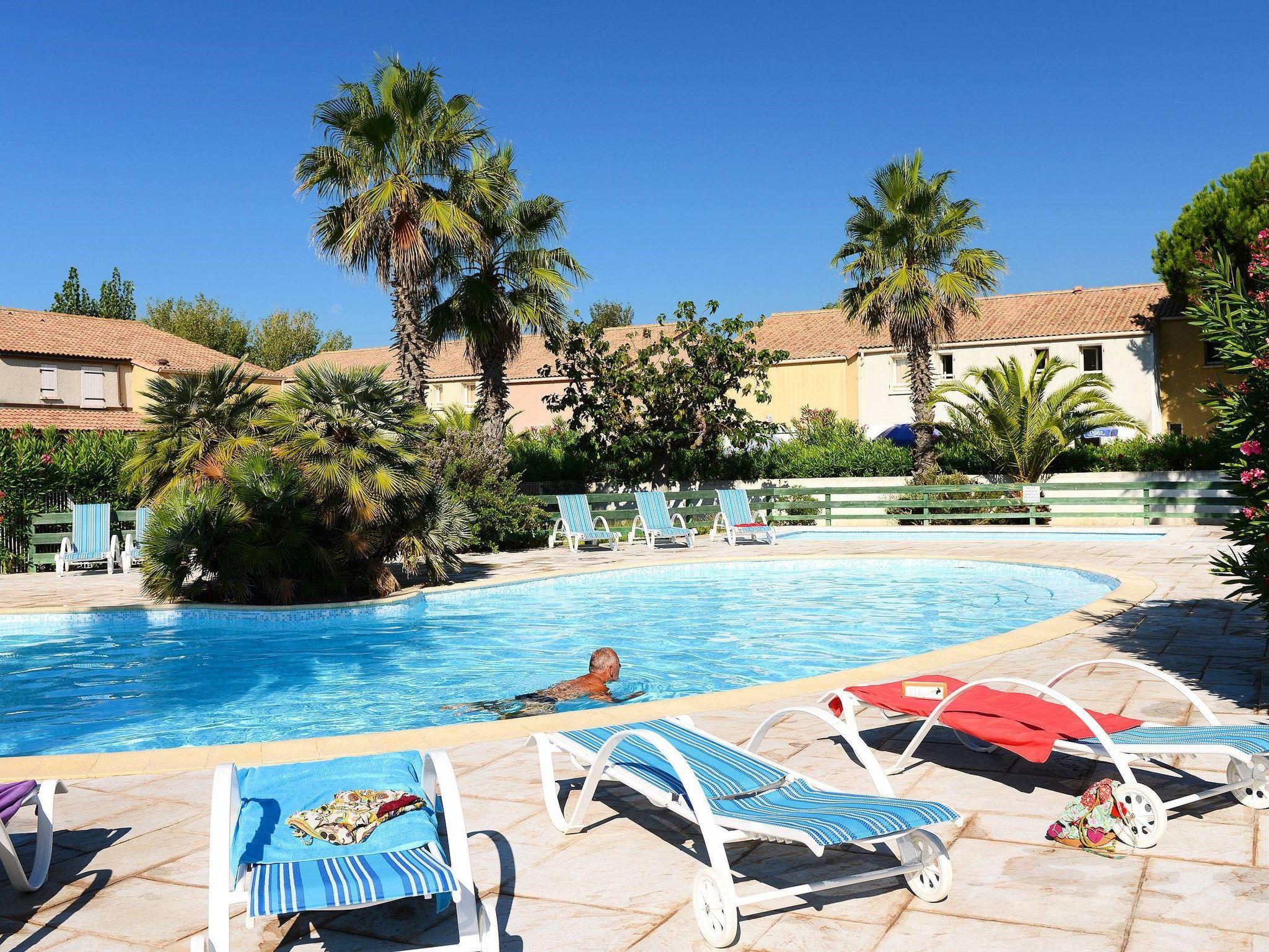 Resort "Le Grand Bleu". 140 houses in the resort. 4 km from the centre of Valras, 800 m from the sea. For shared use: property, beautiful garden with plants and flowers, swimming pool fenced (60 m2, seasonal availability: 15.Jun. - 15.Sep.). Children's pool. In the complex: reception, washing machine, tumble dryer (for shared use, extra). Parking on the premises. Bakery 50 m, sandy beach 800 m. The photo is just an example. The holiday properties may differ in living space, floorplan, equipment and furnishing.