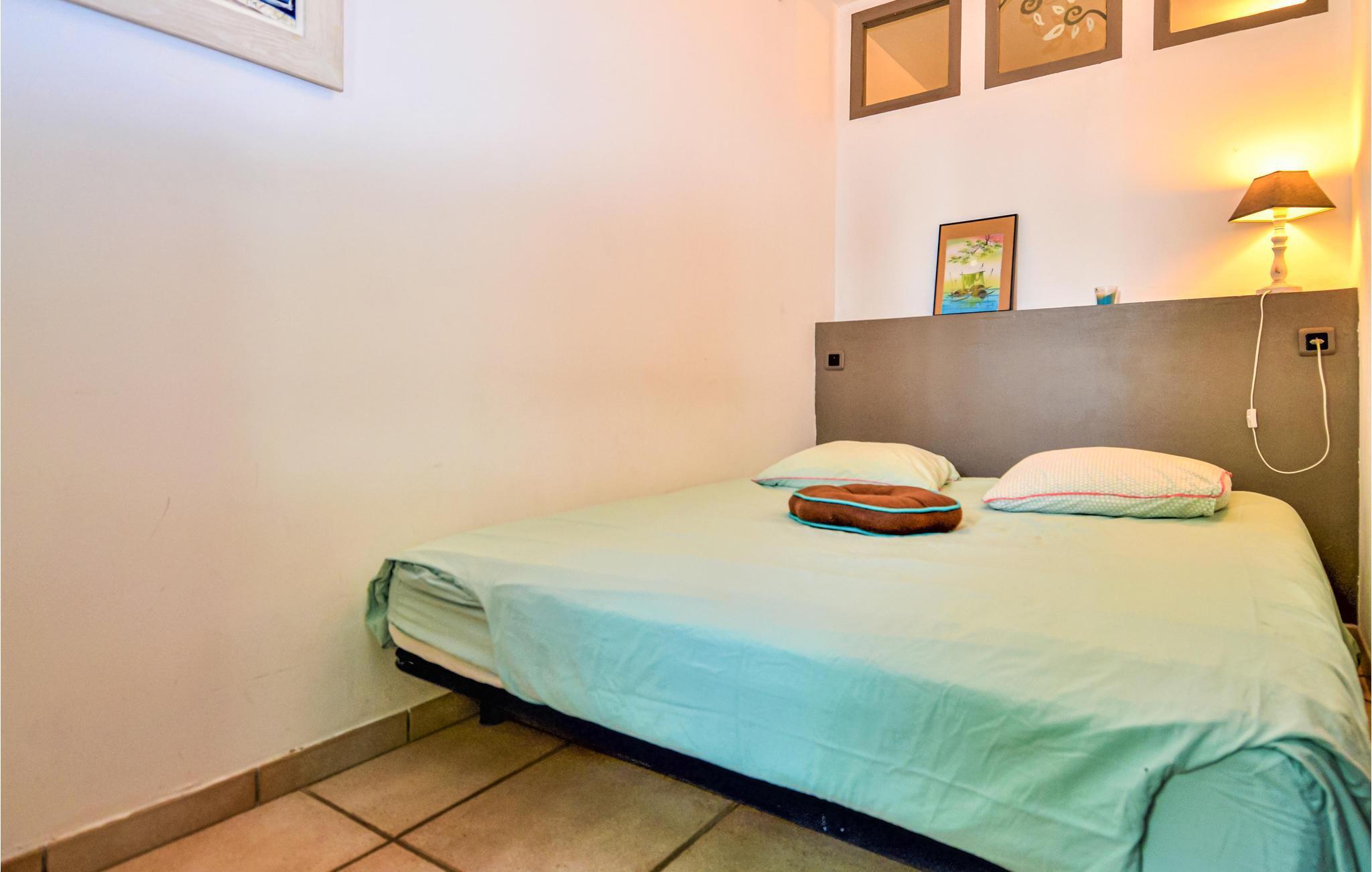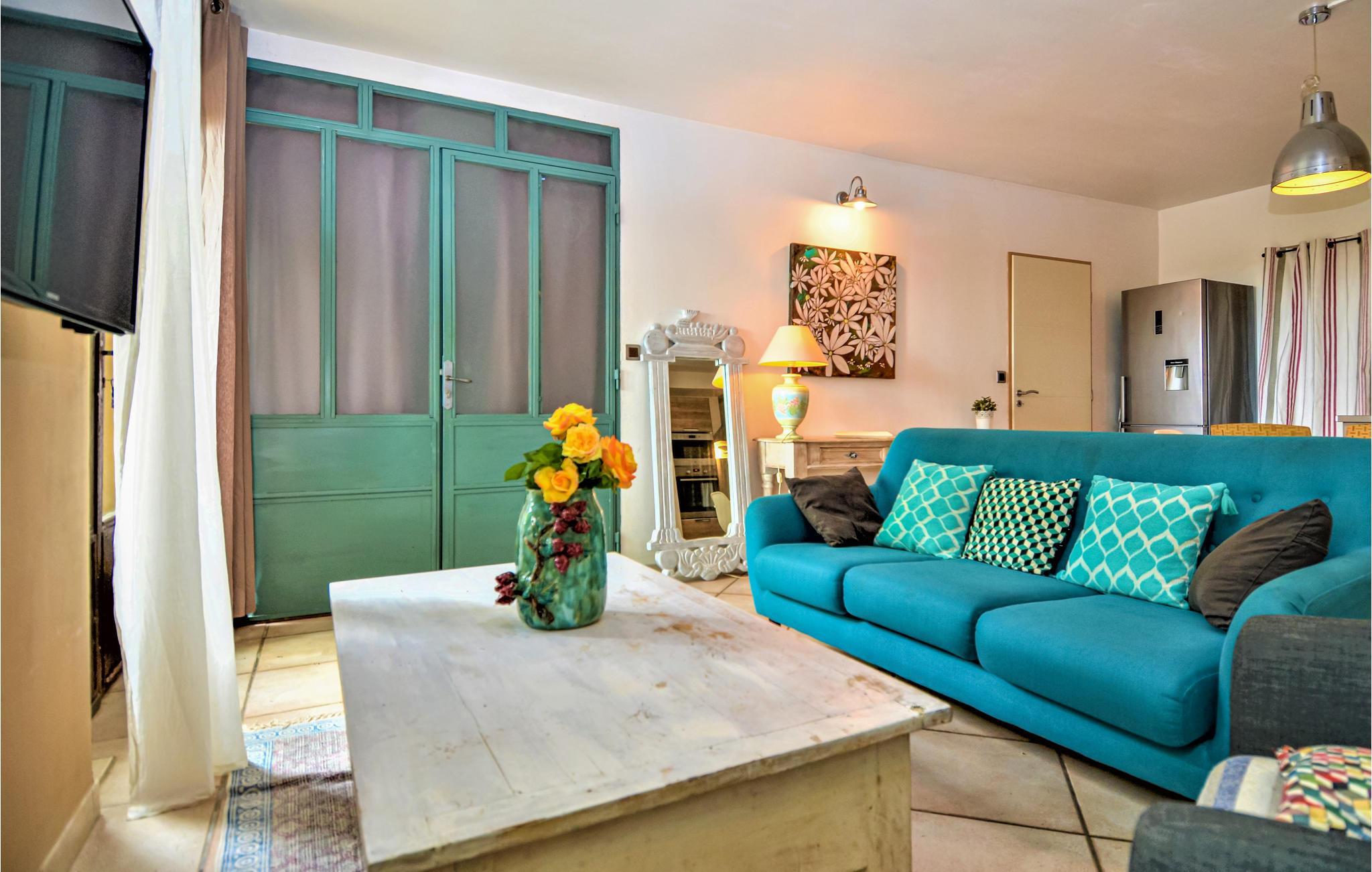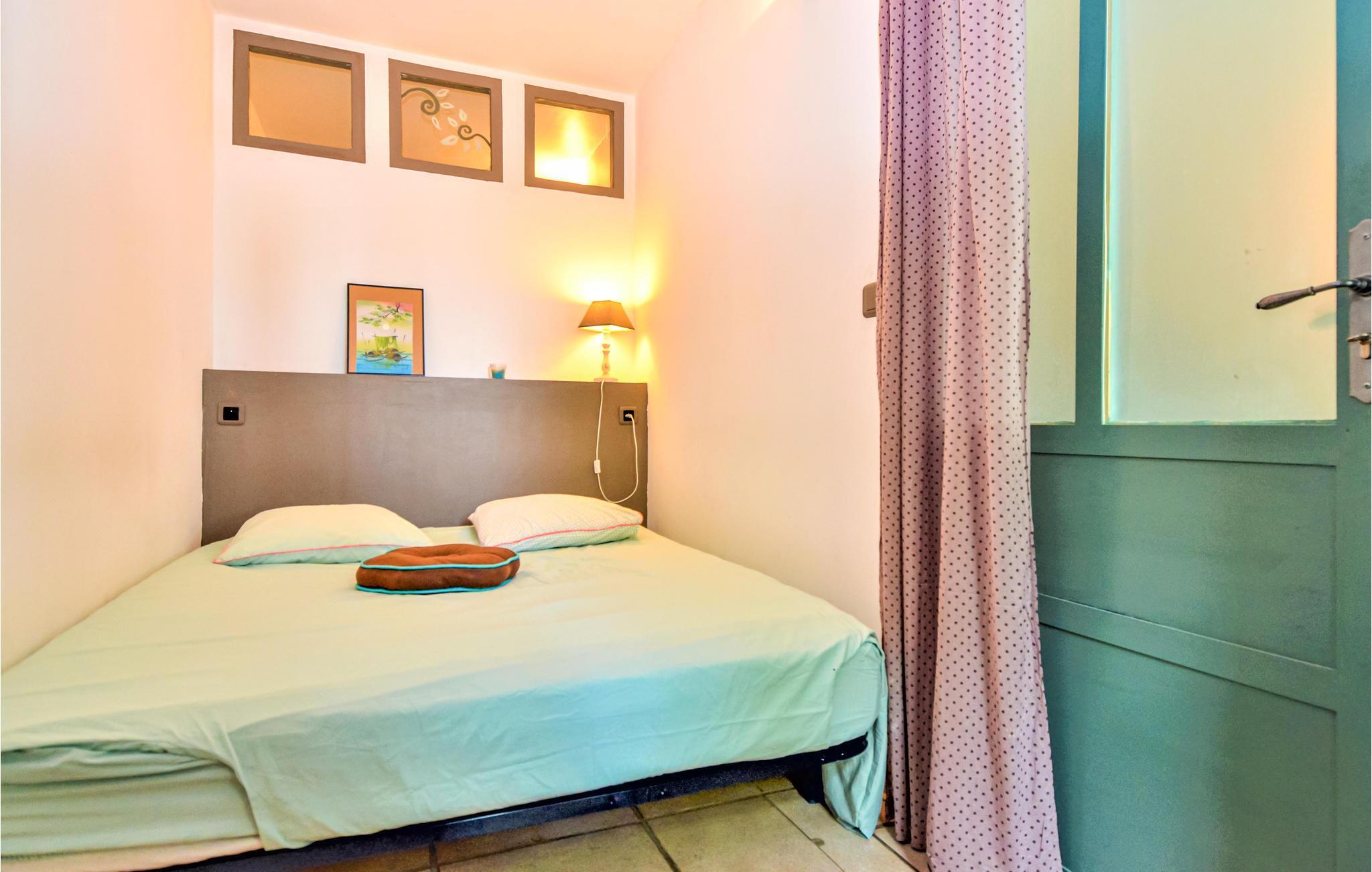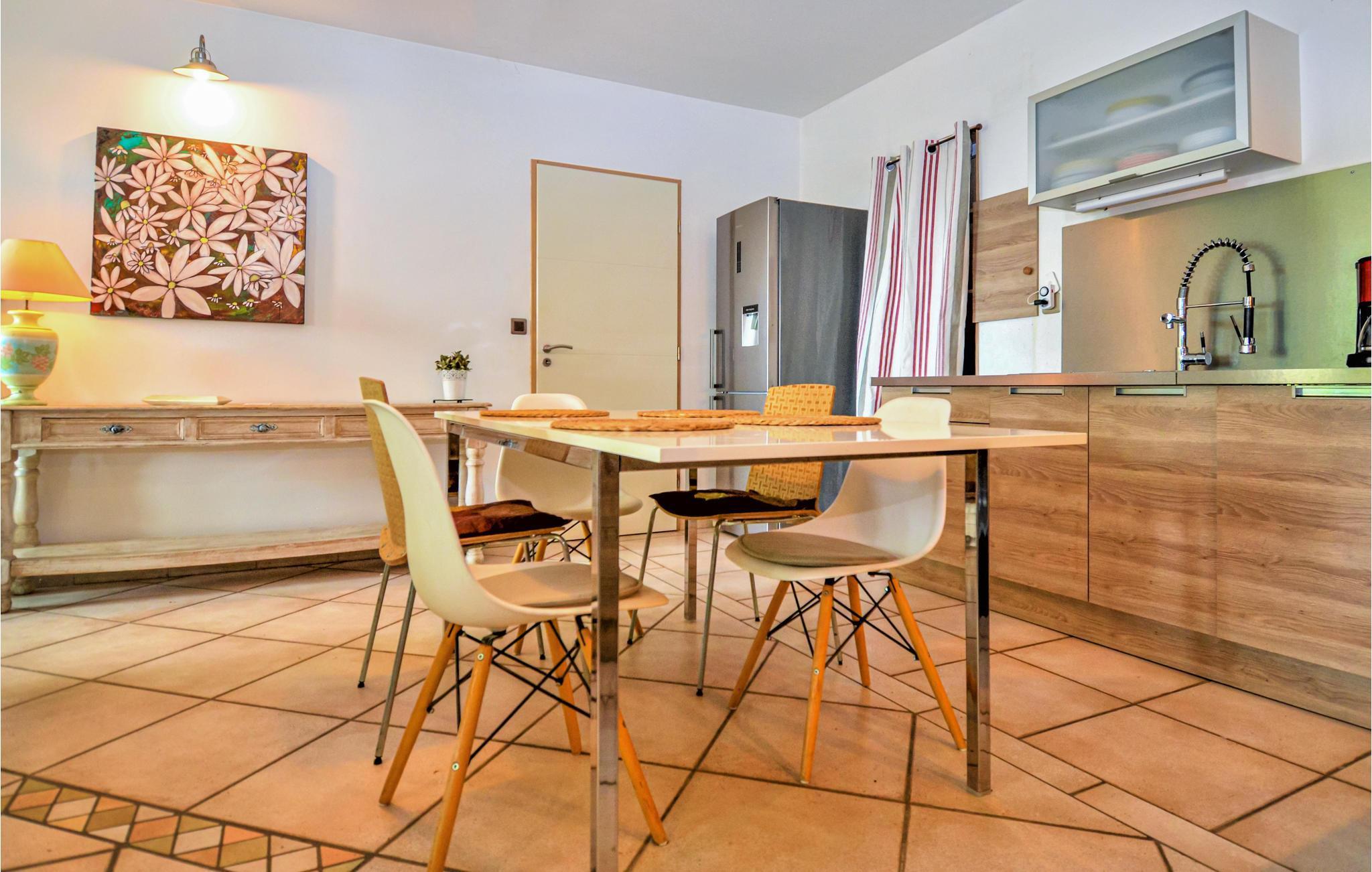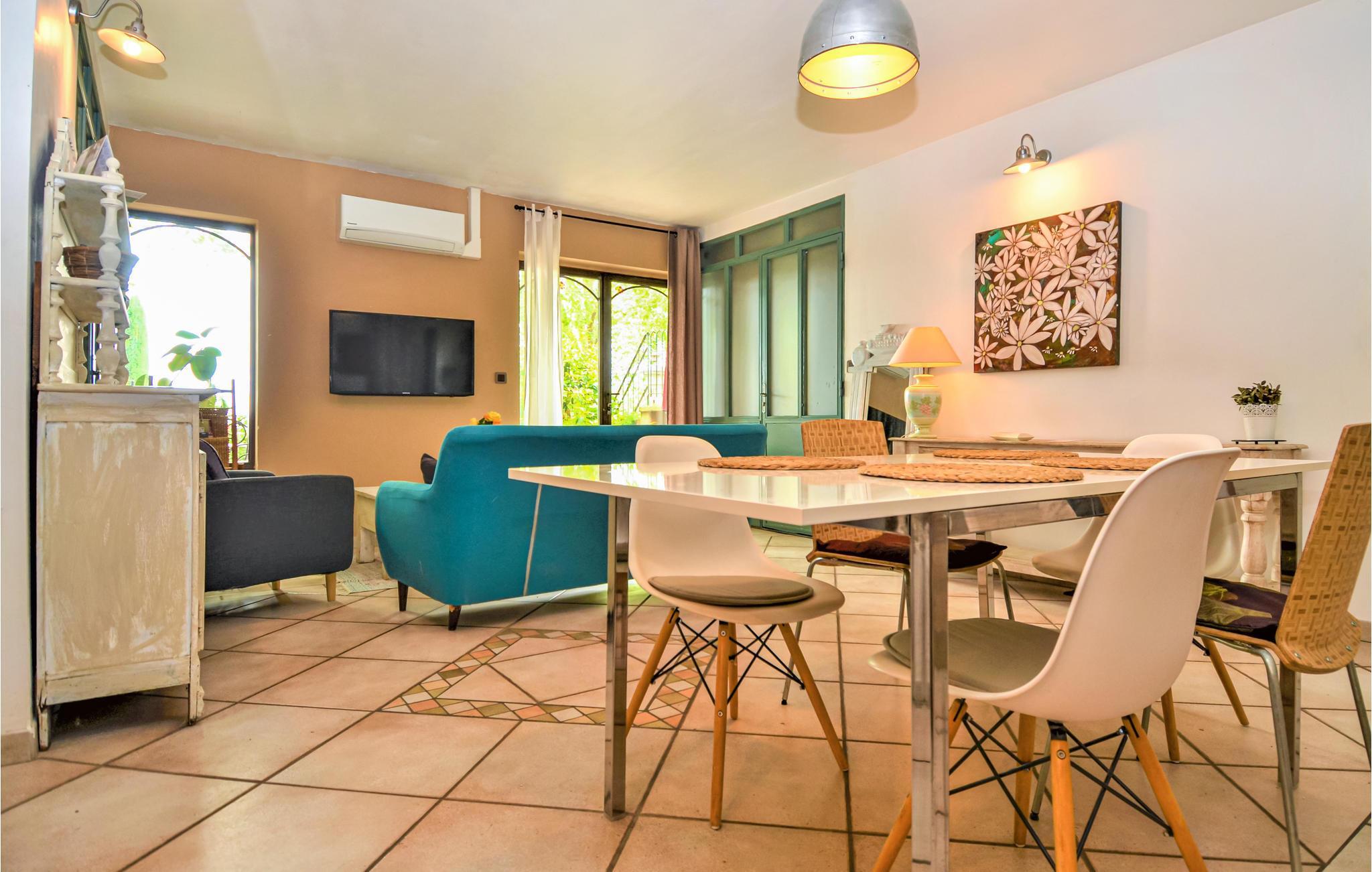 Feriehuset ligger på en vingård med privat pool, tre km fra Violès centrum. Der er tre soveværelser, hvoraf det lille har køjeseng samt et dejligt badeværelse med balneoterapibadekar, separat toilet, aircondition og et fuldt udstyret køkken. Indretningen er moderne og smagfuld.