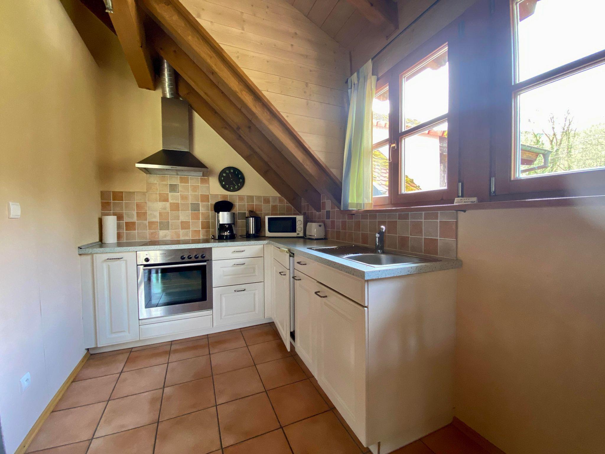 Die Wohnung ist für 2-4 Personen geeignet. Sie besteht aus einer großen Wohnküche mit offenen Dachbalken, einem separaten Schlafzimmer, Bad sowie einer Schlafnische mit Dachfenster. Die Räume haben durchgehend Parkettböden.
