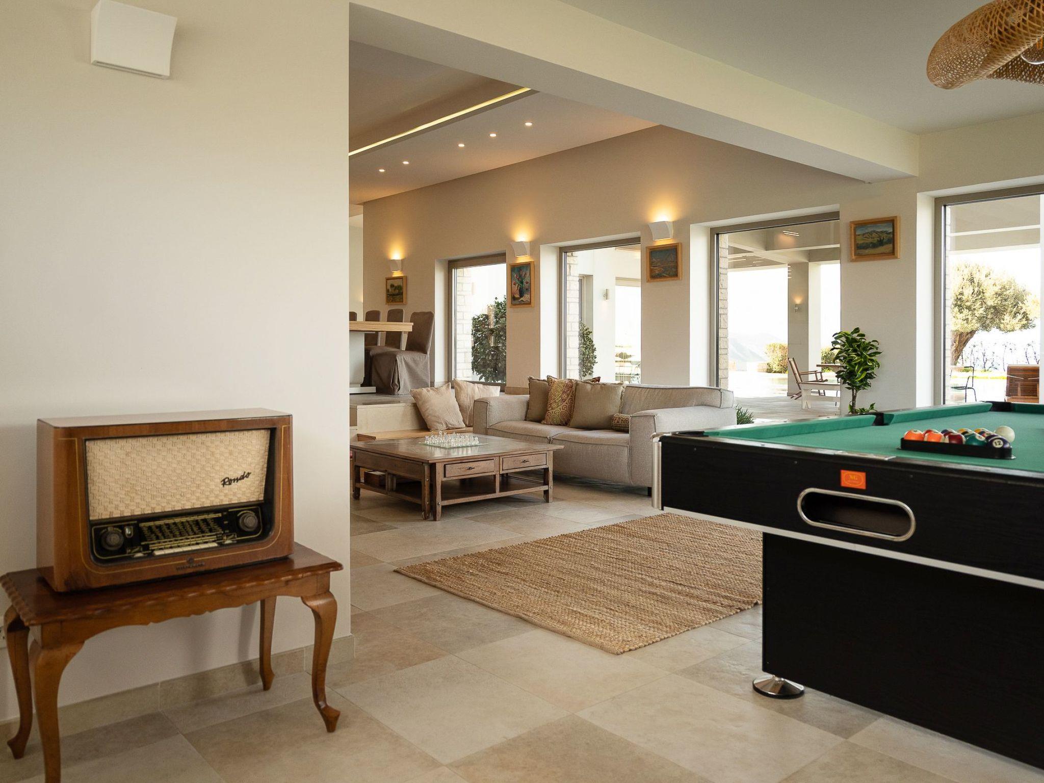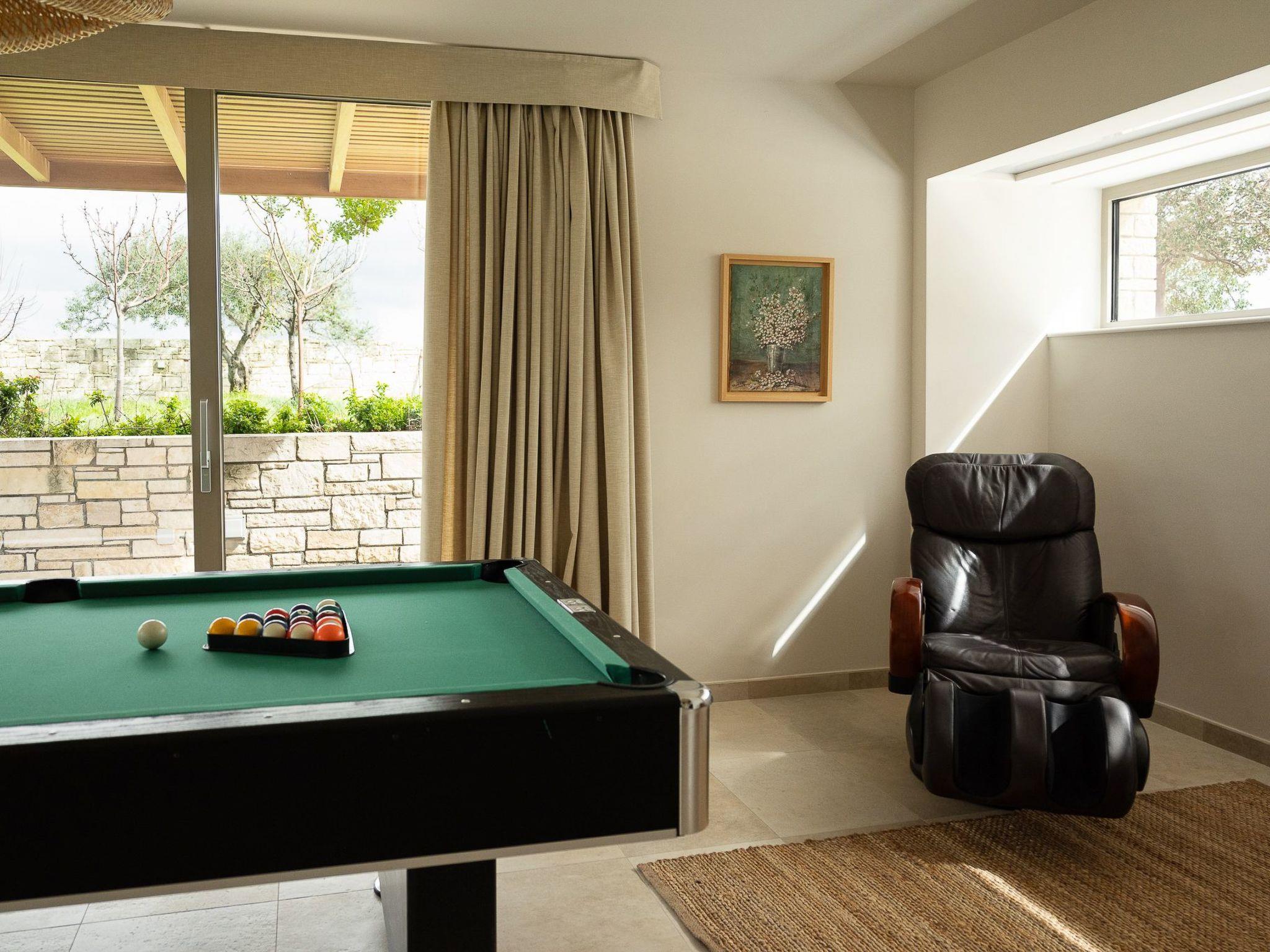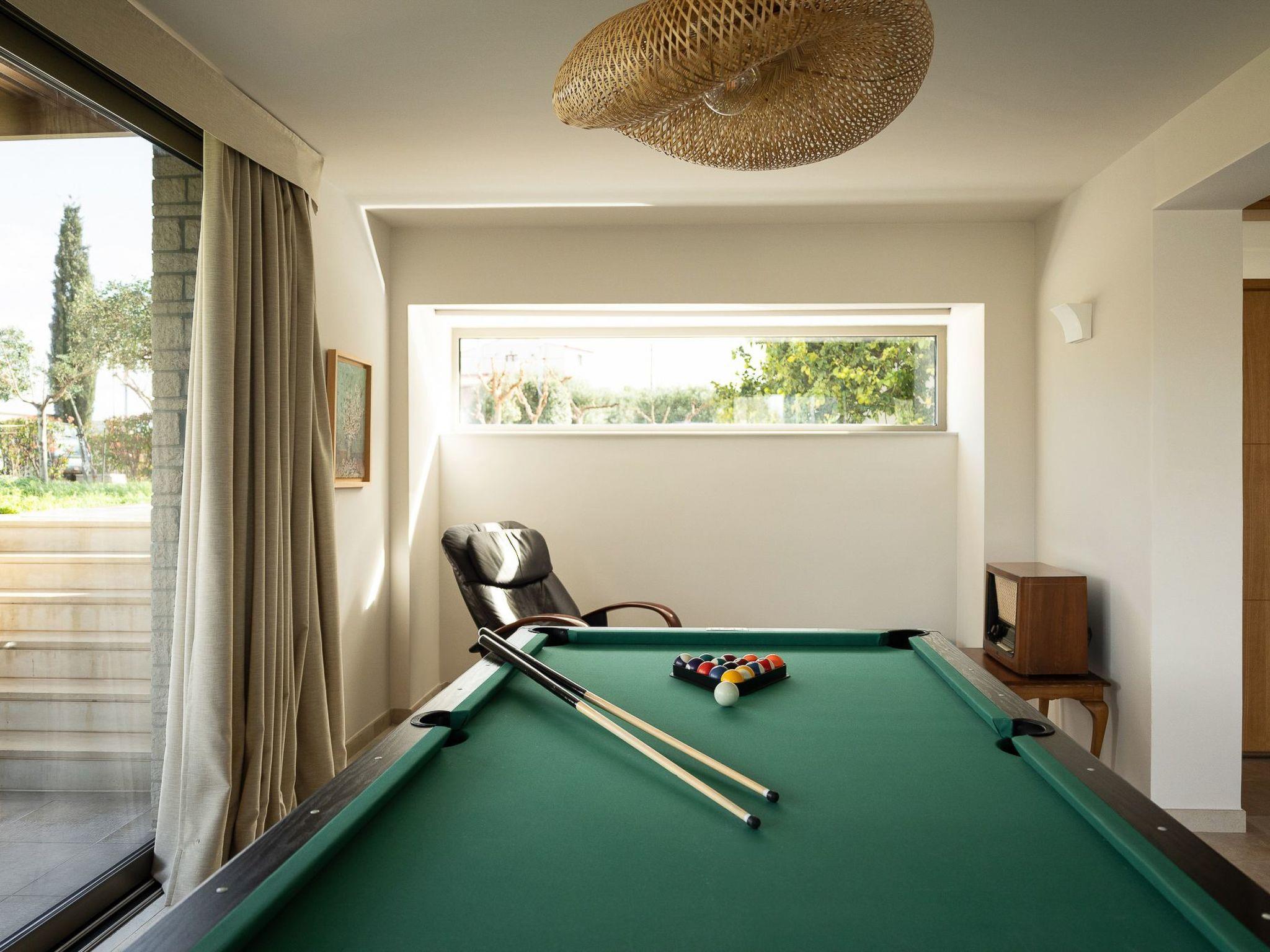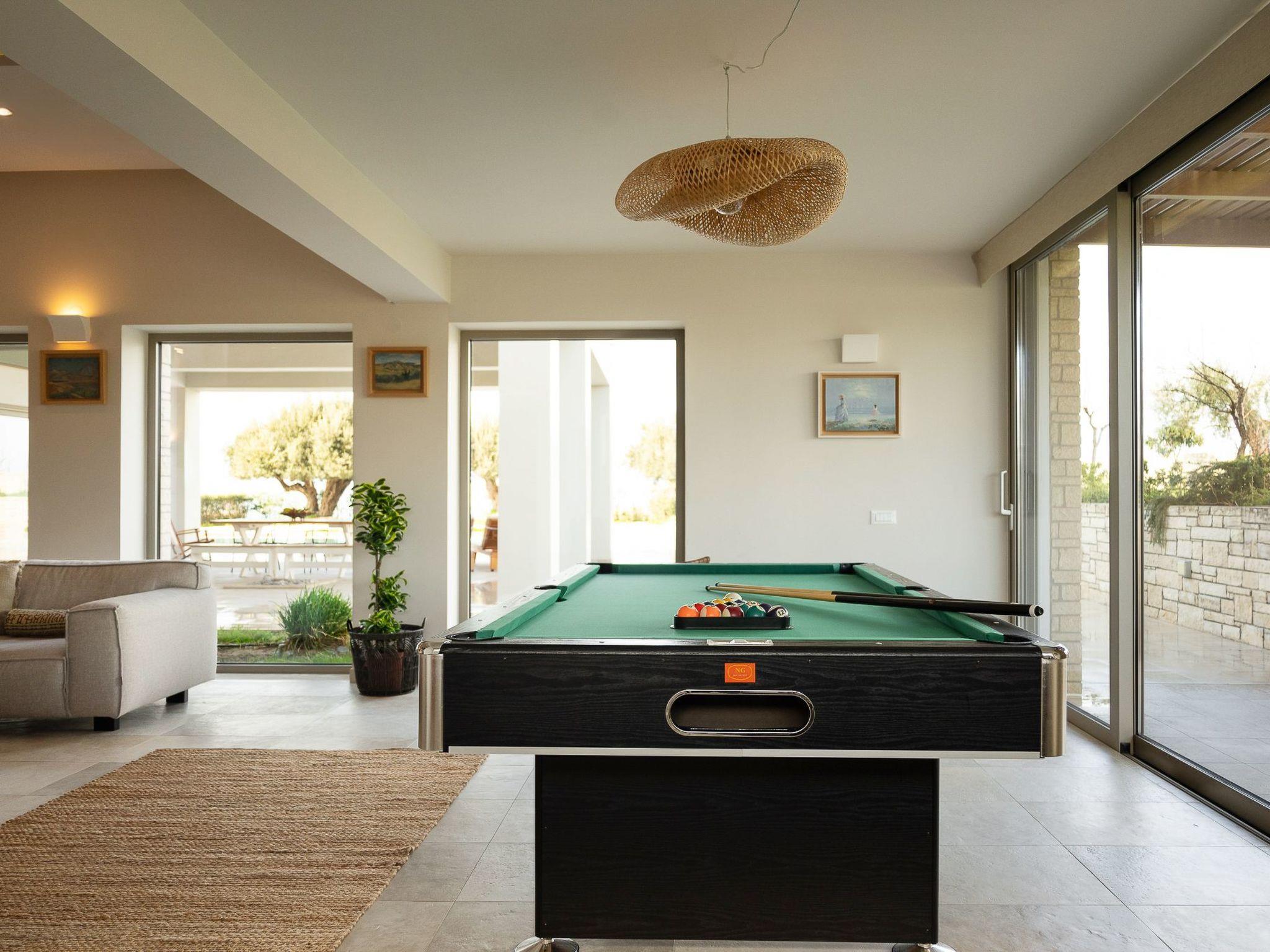 Inside, the villa shines with a plethora of modern conveniences and thoughtful touches. Across five bedrooms and four bathrooms, equipped with both showers and a bath tub with shower, guests will find personal oases conducive to rest and relaxation. Air conditioning throughout ensures a cool respite from the sun's warmth. Entertainment is never in short supply with features like a billiards table, games console, and renewable energy-powered amenities including a dishwasher, washing machine, clothes dryer, and various coffee machines from espresso to capsule ones, ensuring every need is met with a blend of efficiency and pleasure.