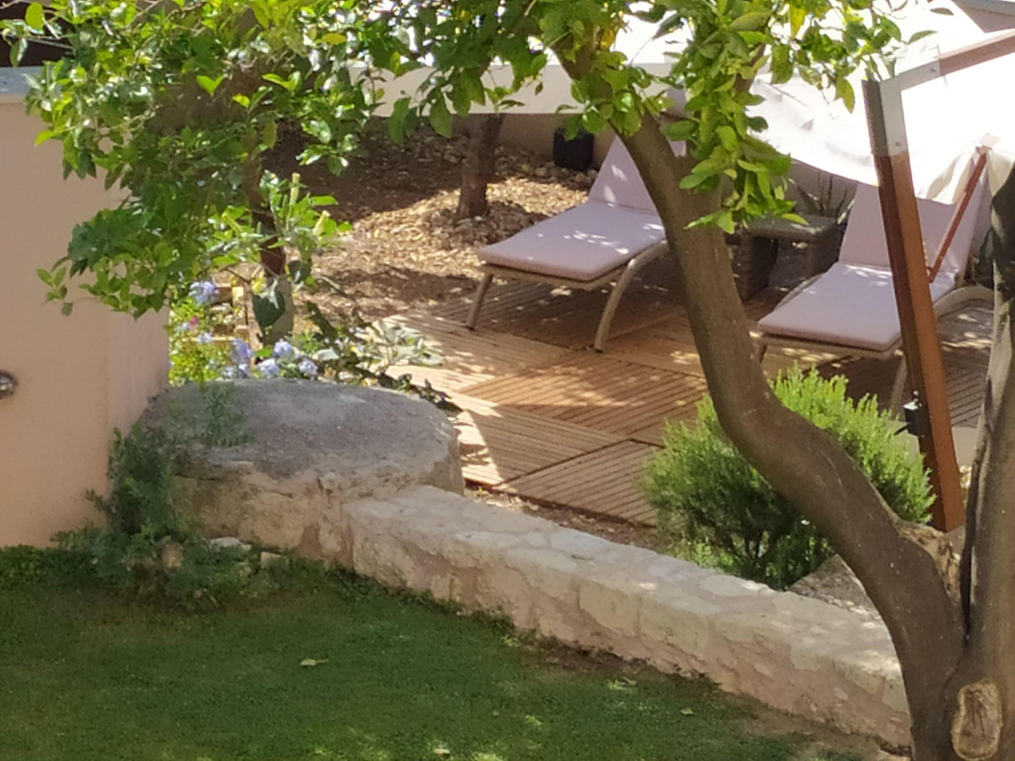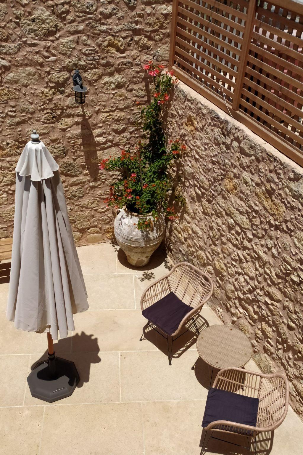 The terrace is equipped with garden furniture and has a view to Talaia mountain. The garden has barbeque facilities, flowers and grass suitable for childrens' play, a garden lounge and sunbeds under sunshade.The property is fenced and therefore suitable for children.