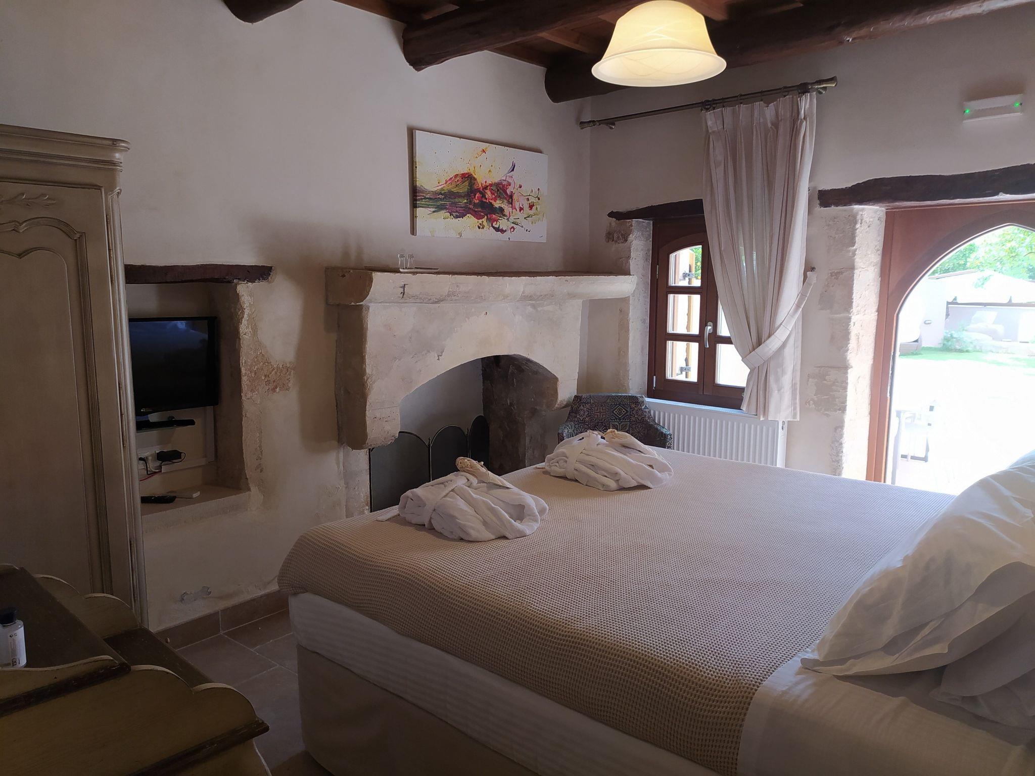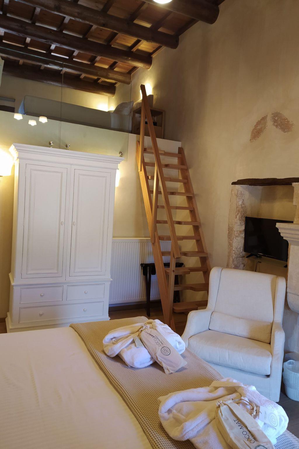 The ground floor is about 70 m² in size and comprises of the following rooms: A living room with sofas, a working area, a flatscreen TV, DVD player and a music system. There is also a bedroom next to it, which includes a queen bed, a fireplace and direct access to the garden. Plus there is a fully-equipped kitchen with an oven, microwave, coffee machines, ice making machine, fridge etc. and a dining area. By the kitchen, there is access to the garden, the barbeque and an outdoor dining table.The 1st floor has two bedrooms and a living room with access to the terrace and mountain view. The main bedroom is for 4 people with a queen bed, fireplace and view to the inner yard - as the ceiling is very high, a mezzanine with two beds was created, with a view to the terrace. The 2nd bedroom has view to the garden and a smaller mezzanine with boho cushions' sofa.