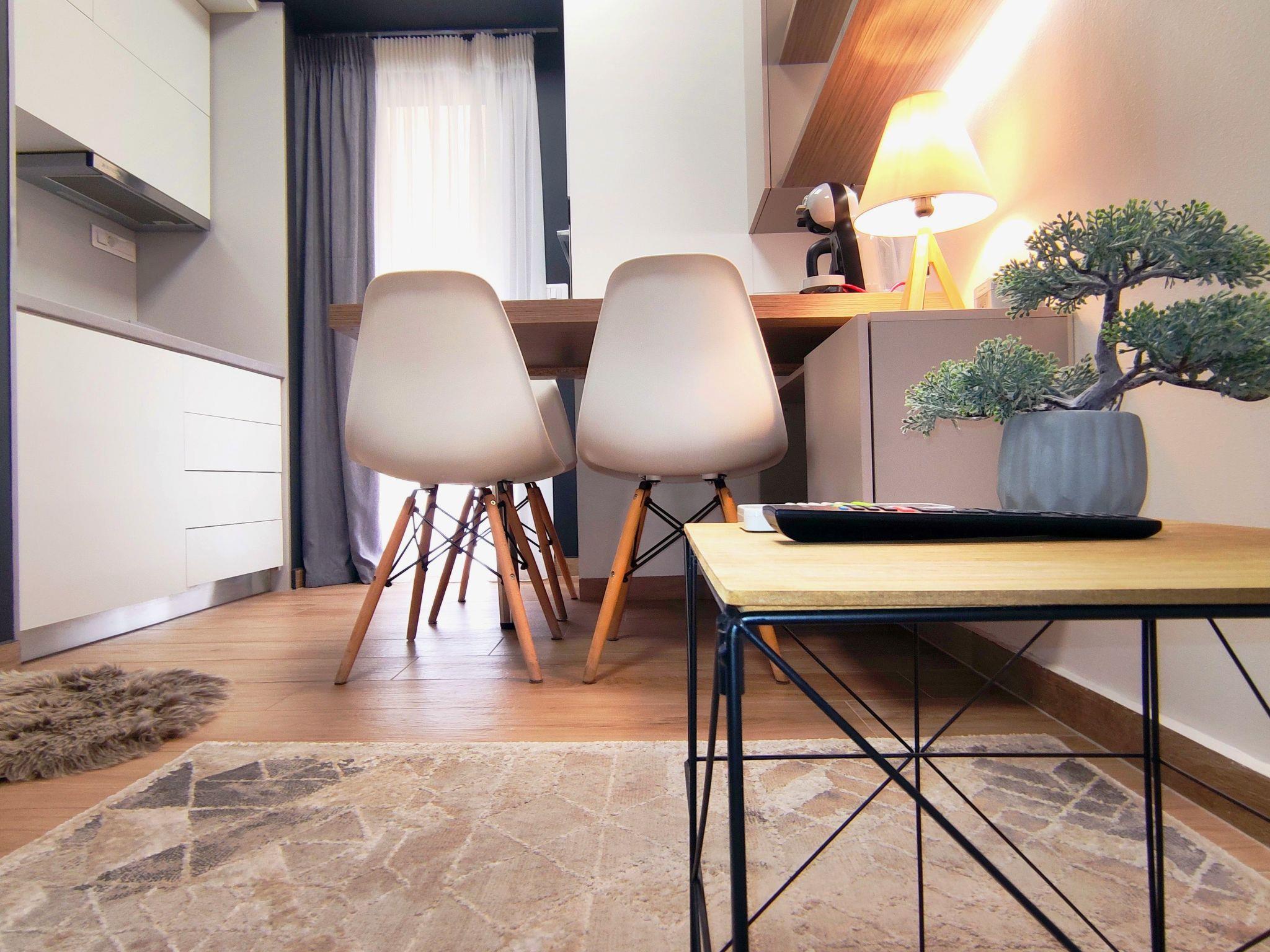 The interior of this studio apartment has been thoughtfully designed to maximize space and comfort. It features air conditioning throughout, ensuring a pleasant environment regardless of the outside temperature. For your convenience, the apartment includes a capsule coffee machine, an electric kettle, a mini oven, and a fan, ensuring all your needs are met. A washing machine and clothes dryer are also provided for your sole use, making longer stays as comfortable as possible.