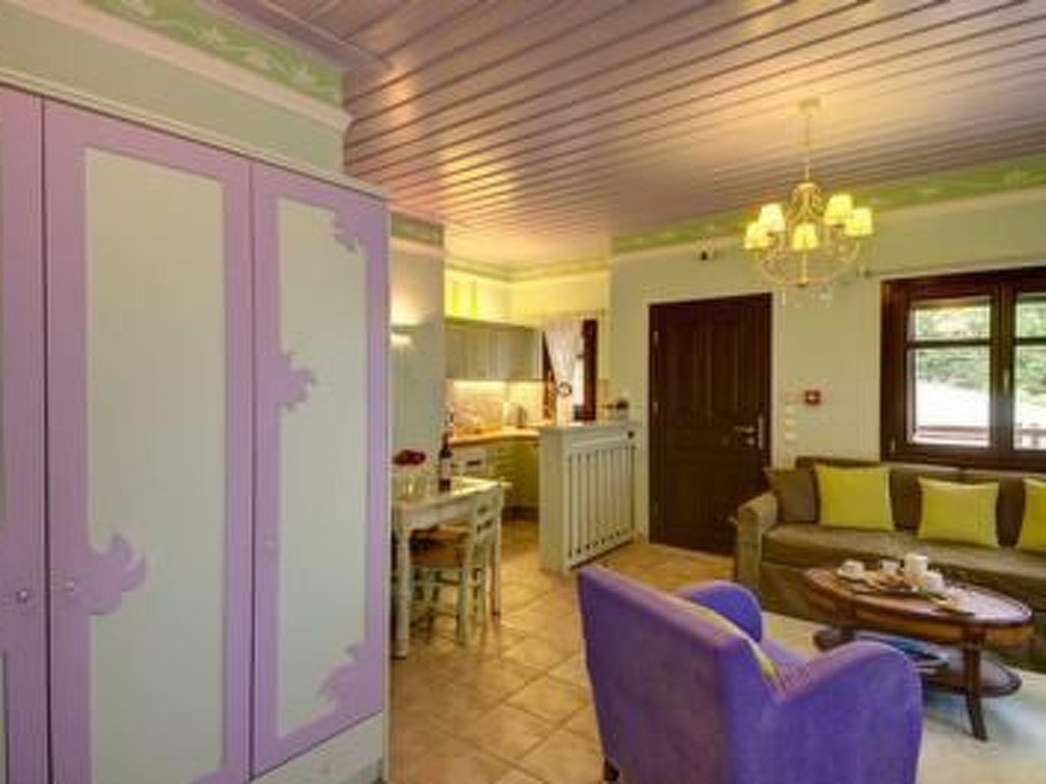 5 flats - each for 2-3 persons (two of them are also suitable for 2 adults + 2 children): Each flat is very tastefully and modernly furnished. The whole flat practically consists of one room. The sleeping area with a double bed is separated from the rest of the flat either by a counter or by curtains. The living room has a large sofa bed, fireplace, TV, heating, very well-equipped kitchenette, dining table with 4 chairs, shower/WC, terrace (20 square metres) with garden furniture and sea view.