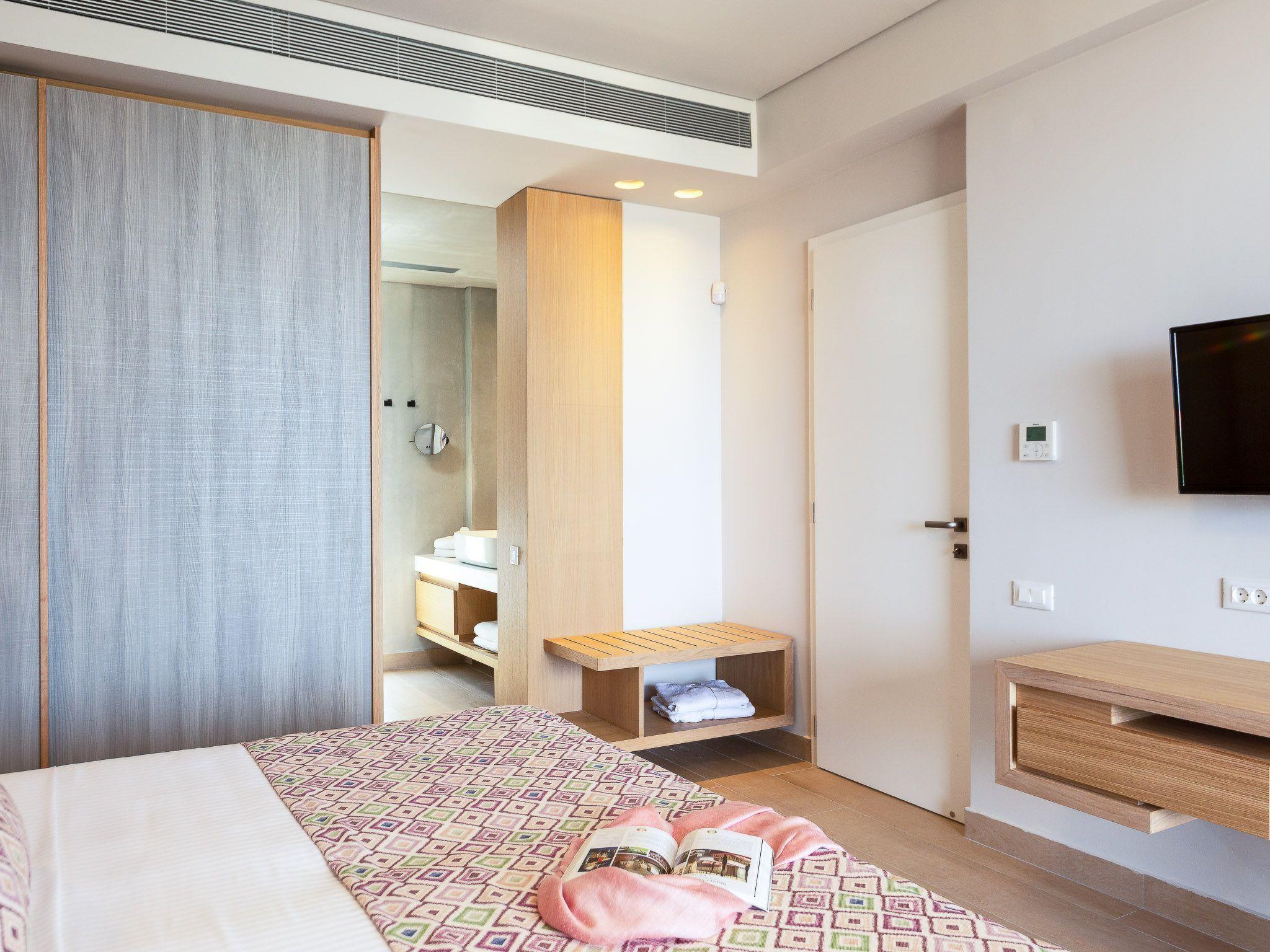 Floor Layout: •Ground floor -one master bedroom with one double bed, en-suite bathroom room, a living room with fully-equipped kitchen and dining area for up to 10 persons -1 WC Bathroom •First floor: -3 bedrooms with king size bed and en-suite bathrooms all with A/C, TV and balconies