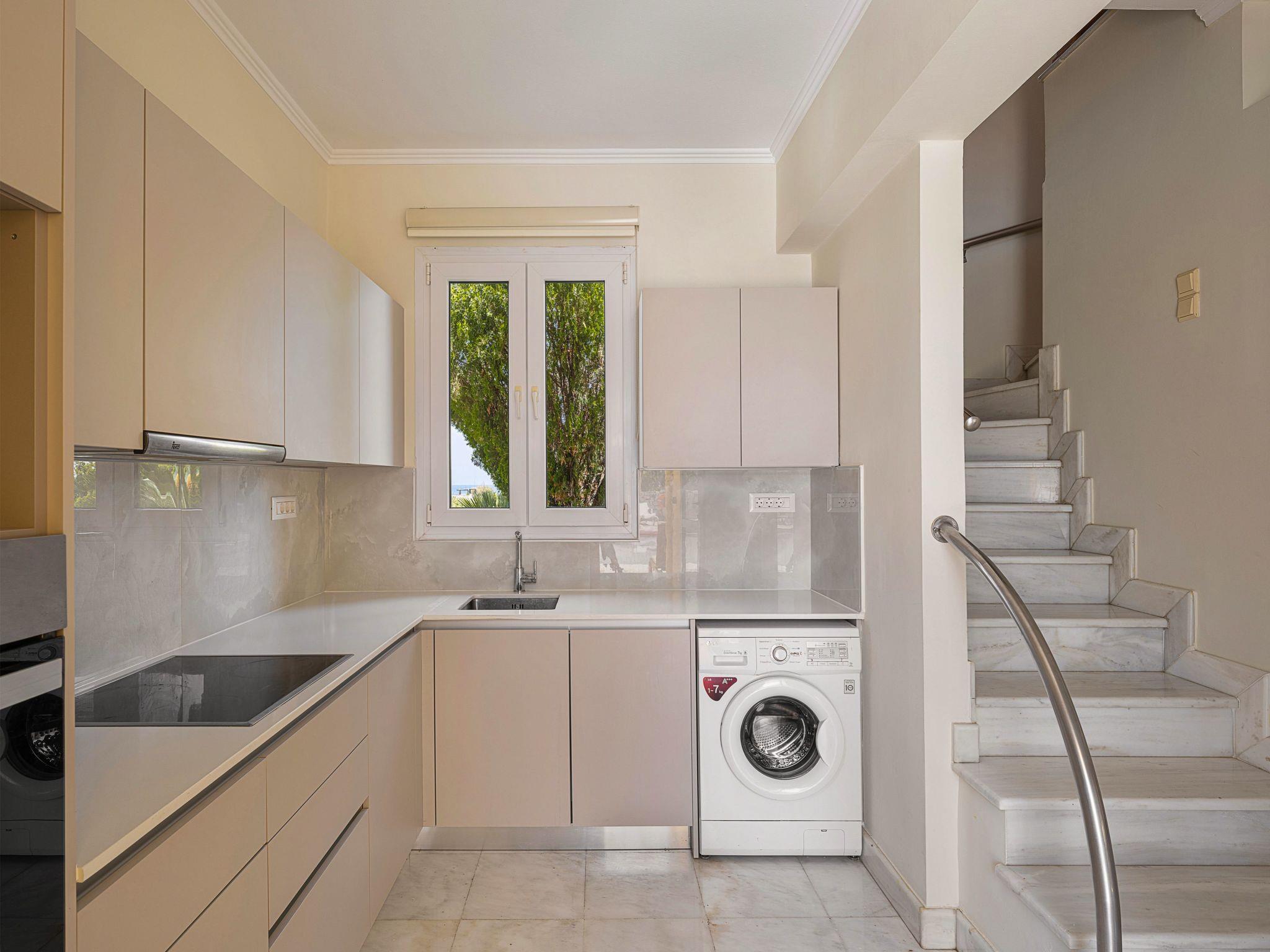 Each of the four villas, named Chloe, Ioli, Fedra, and Danae, presents a luxurious interior spread over three floors and 110 sqm, catering for up to 6 people. On the ground level, guests are welcomed into a spacious, fully-equipped living room with the finest marble tiles, leading to a dining area overlooking the swimming pool and a kitchen where guests can prepare their desired specialties. A bathroom completes the ground floor layout. The first floor features two bedrooms, one with a queen-size bed and one with twin beds, another marble-lined bathroom with a large bathtub, and a generous veranda offering a panoramic sea view. The cozy loft on the second level, accessible directly from the first floor, houses two twin size beds.