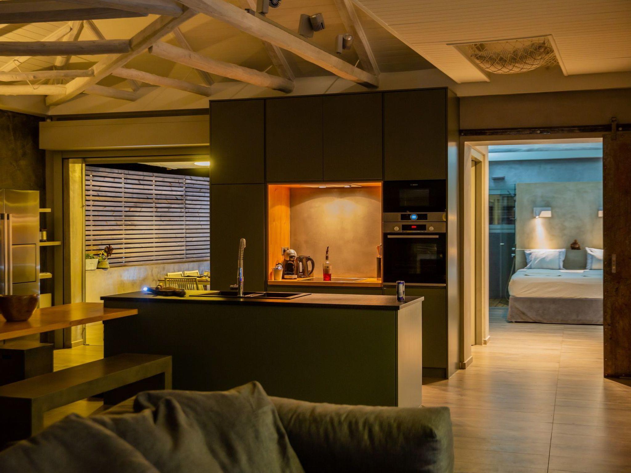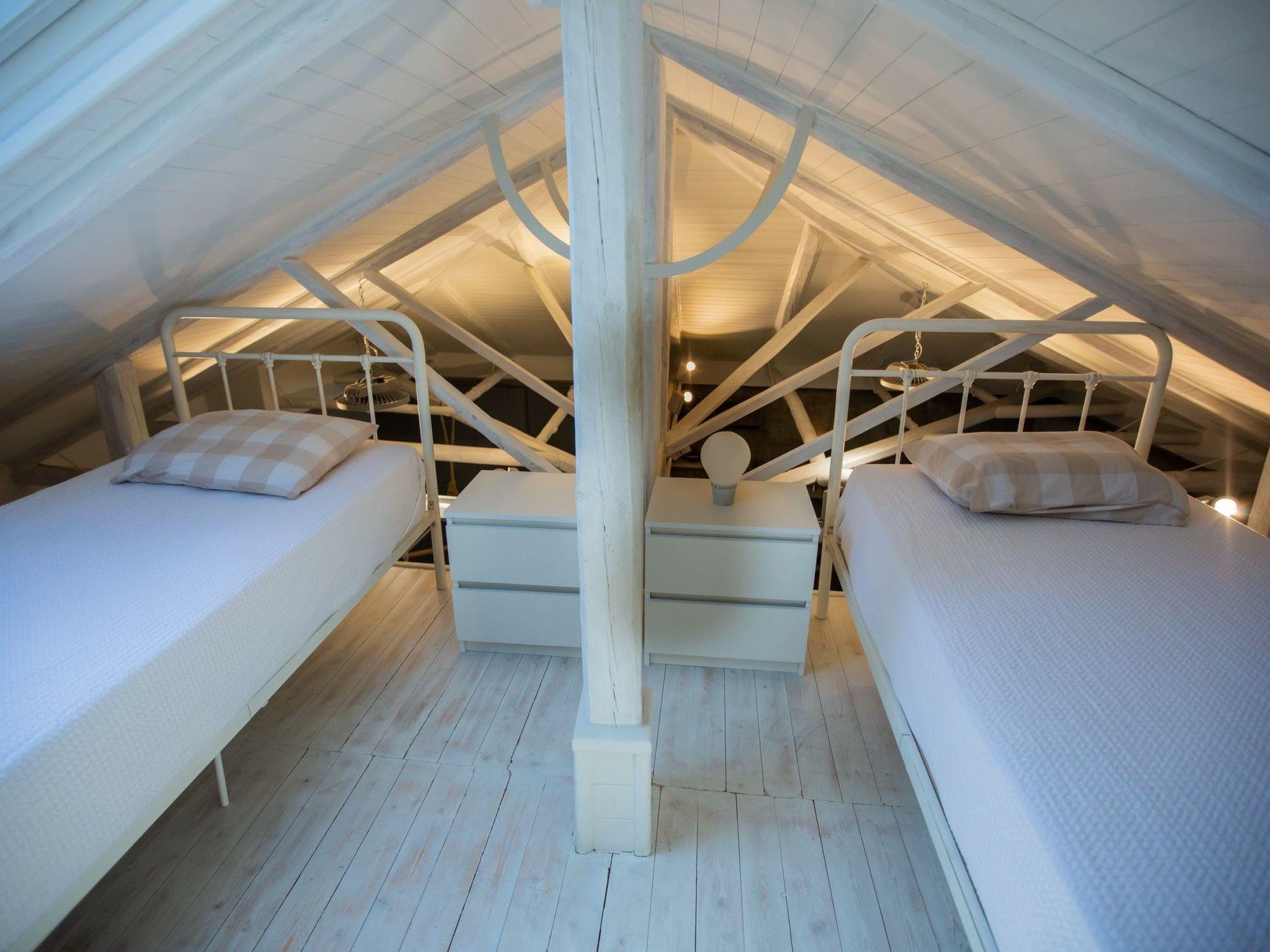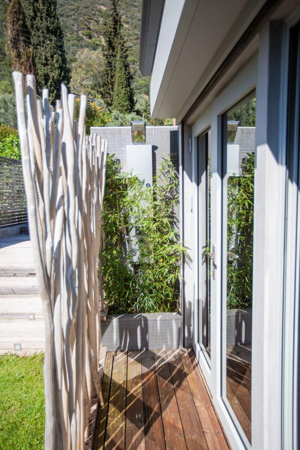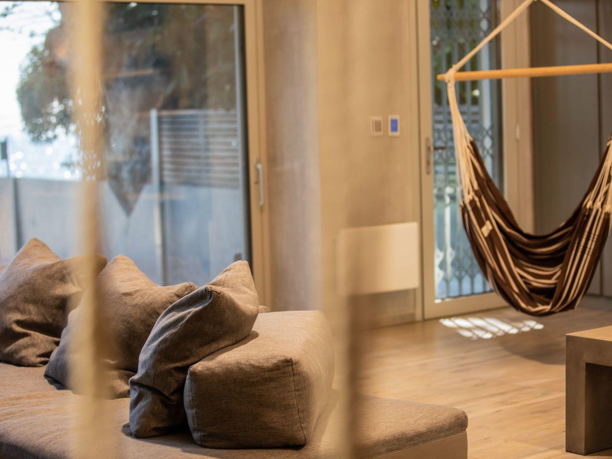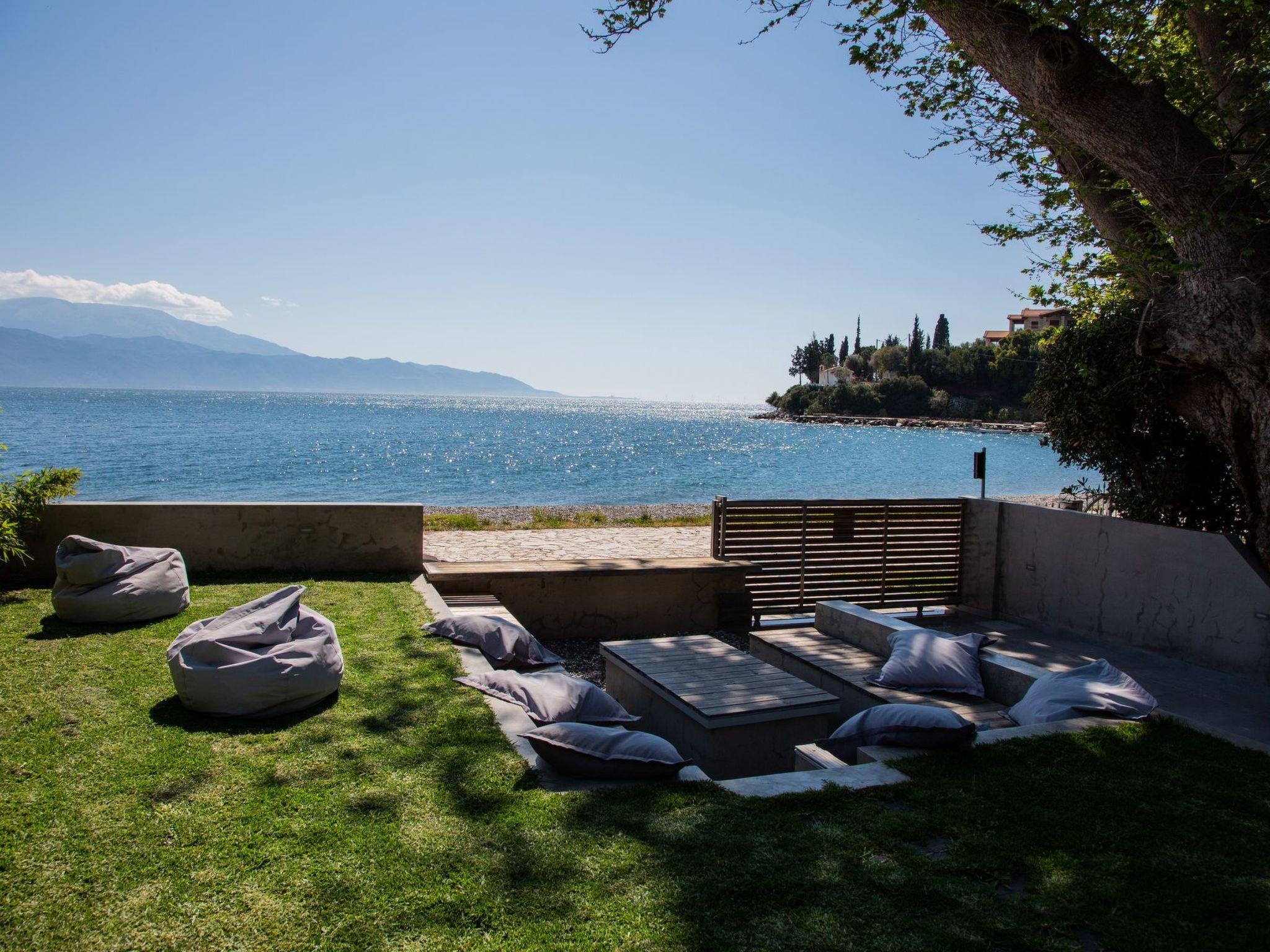 It’s built in with the sea” as it is only 10 meters away from it and is located in the best part of the beach, under plane trees and near a small sea platform. It is a charming and spacious villa of 130sq.m with large spaces and a bright living room facing to the south. This luxurious two-story villa with two bedrooms and two bathrooms can provide accommodation for up to six people. The combination of tall wooden ceilings and large glass doors allows a stunning view on the sea, the Rio-Antirio bridge, a small picturesque church and the Peloponnesian mountains.“ This villa is an absolute smart home, renovated with today’s highest standards of house construction and accomplishes the in-out living perfectly.On the ground floor there is a beautiful living room with a fireplace and a 55” television, an open spaced kitchen with an island fully equipped with branded built-in electrical devices, a dedicated multimedia workspace, and a built-in “nock” couch all in the same open space.There is also a large master bedroom with a king size bed, a double doored closet, a bathroom with two sinks and an in-out shower with multiple water ejectors. Finally there is an extraordinary WC, a large walk-in closet and a laundry room. On the second floor (attic) there is a bedroom with 2 single beds, 2 hammock beds, a desk with a bookcase and a roof window that offers a unique view and brightens up the place.