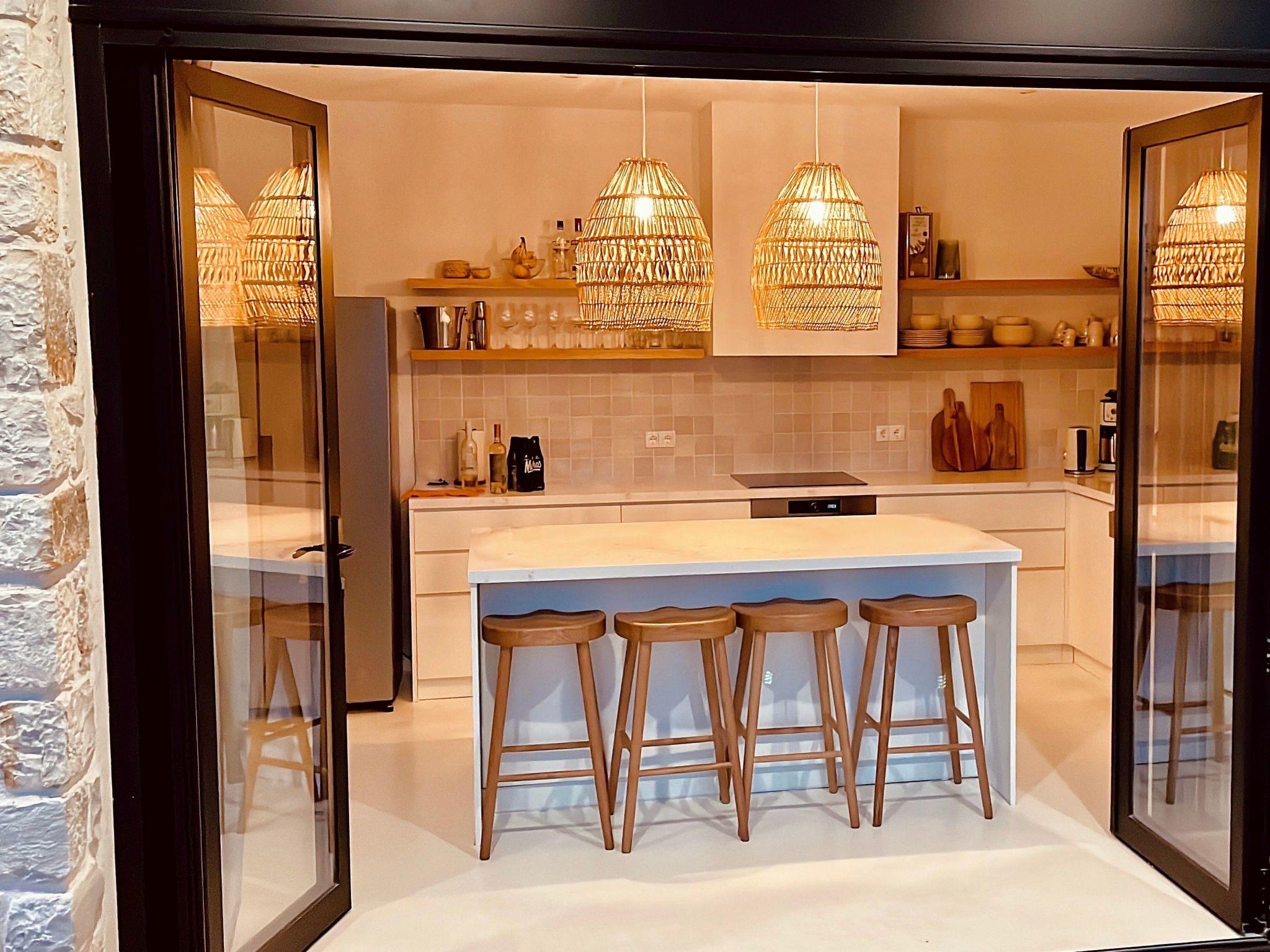 Nepenthe is a modest, yet luxurious two-bedroom villa with lots of character. The design is inspired by the traditional Greek style, infused with modern minimalism and attention to comfort. There's WiFi access from everywhere (except the back garden) and there's airconditioning in every room. Each bedroom has its own bathroom and access to the balcony.Downstairs, there's a living room with a closed fireplace and a 55 inch smart TV with satellite connection and Netflix. There's a fully equipped kitchen with an island, an oven and a big fridge. The main dining area is outside, under the pergola on the terrace. It will comfortably seat up to six people.The living room and kitchen have panoramic folding doors. When these are opened, the ground floor changes into one indoor-outdoor space with lots of space, light and a seamless transition with the terrace.Outside, you get the feeling of a self-contained resort, with a long pool and an outdoor shower, surrounded by tropical plants. Behind the house, there's a cozy stone garden with mediterranean plants. It has a comfortable seating area with an outdoor fireplace, perfect for cozy comfort in the evenings.The best place in the house is probably the patio on the roof. Surrounded by a herbal garden, there's lots of space to relax in the lounge and enjoy the breathtaking views over the valley with its olive trees, the surrounding mountains and the vast ocean. The culture in Crete revolves around open air cooking and eating. The rooftop dining area is equipped with an outdoor kitchen and a gas BBQ, perfect for a large lunch or dinner.