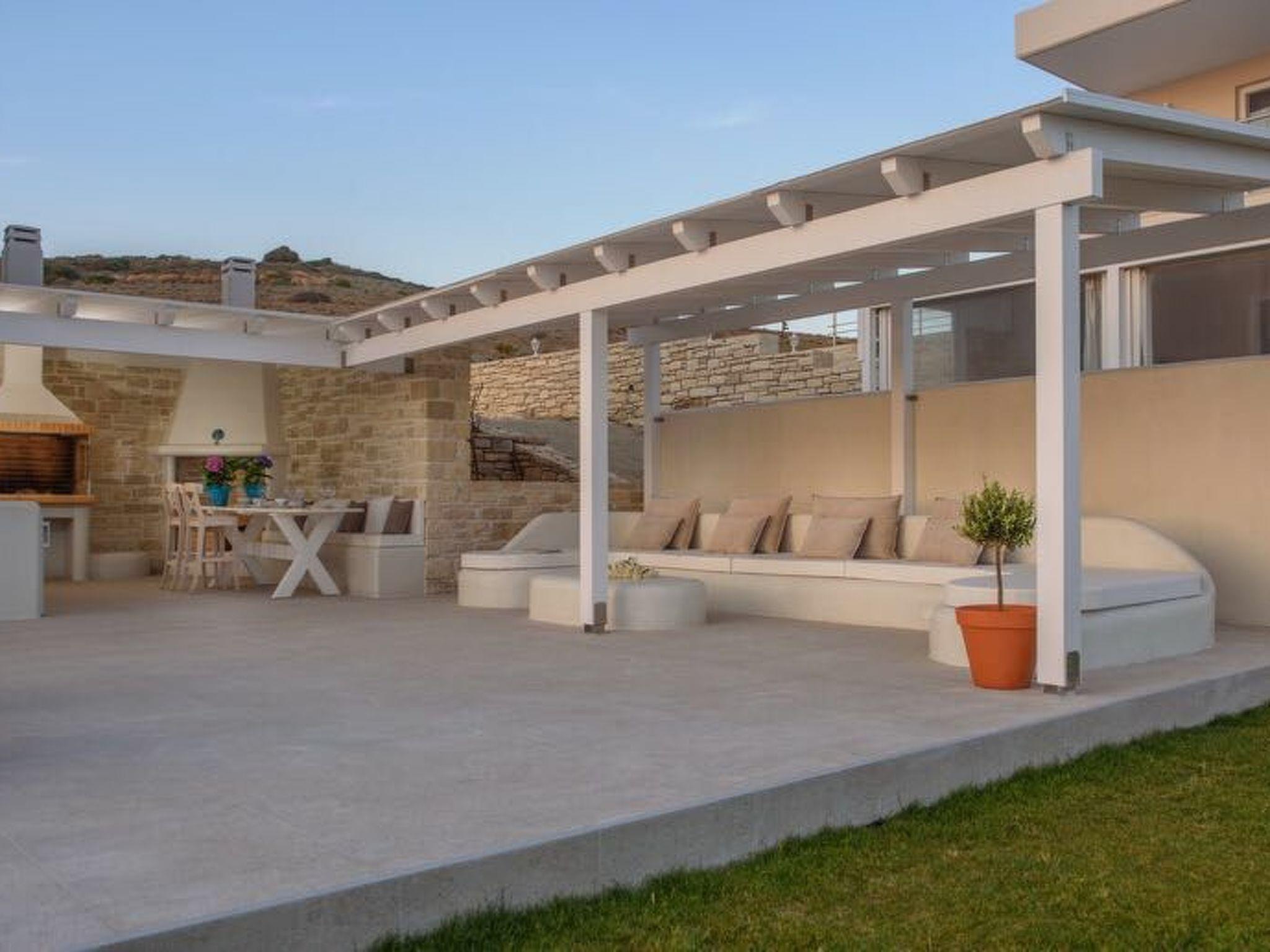 The swimming pool with splash shower measures 8.50 m x 4.00 m x 1.50 m and is chlorine-free and heatable, experience your holiday with luxury and relaxation in the adjoining Jacuzzi and enjoy a cocktail in the cosy lounge area. The villa offers an outdoor kitchen with space for up to 10 guests! The villa, in close proximity to the sandy beach of Kalamaki, leaning against a dune, the property is set on private 1,400 m² Mediterranean garden with lawn and offers a wide view of the Mediterranean Sea of the Libyan Bay and the Ida Mountains, fascinating the sea view, only 100 metres to the beach.