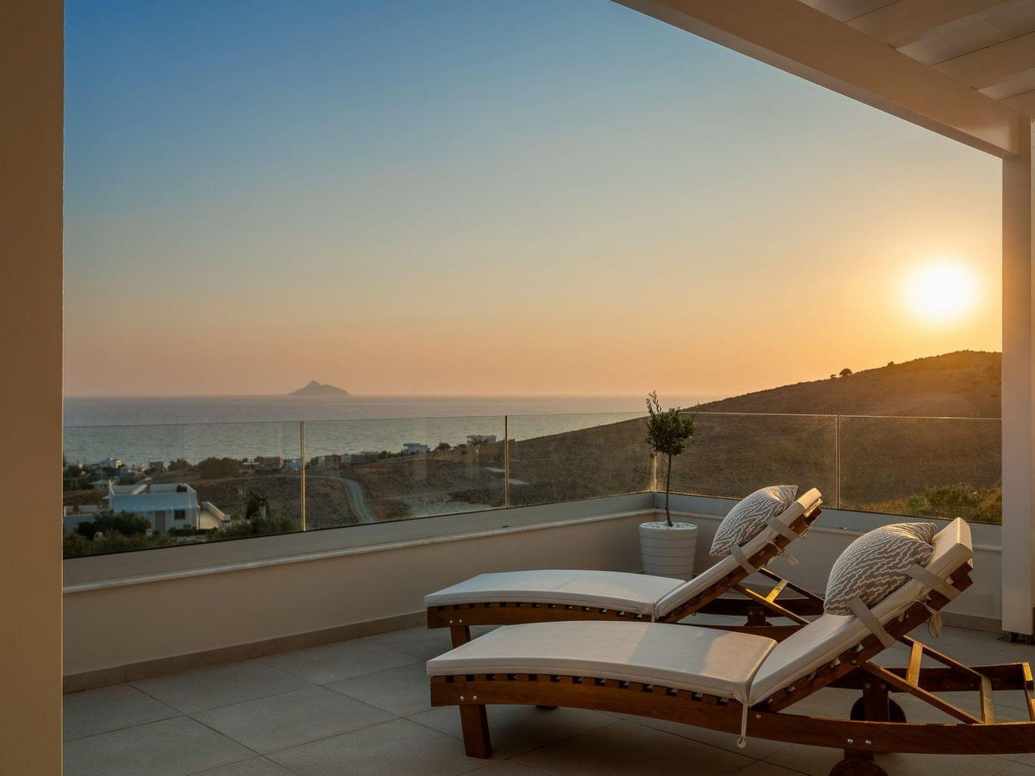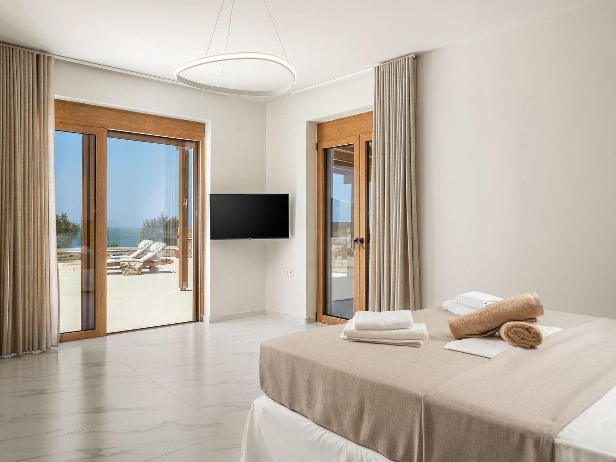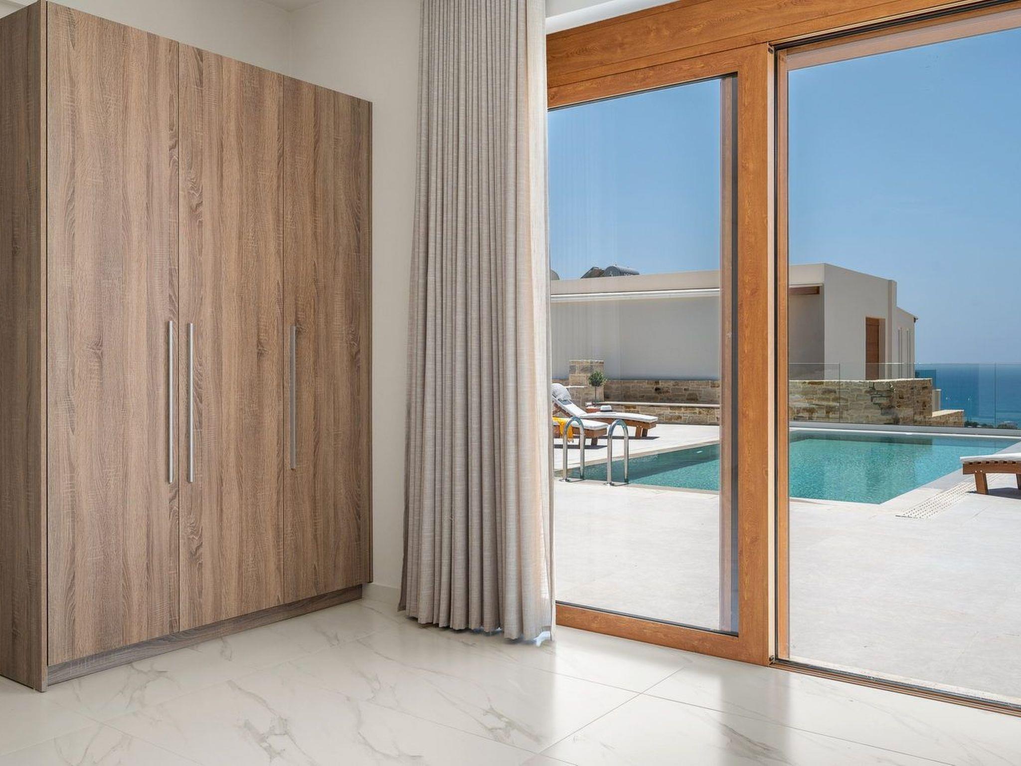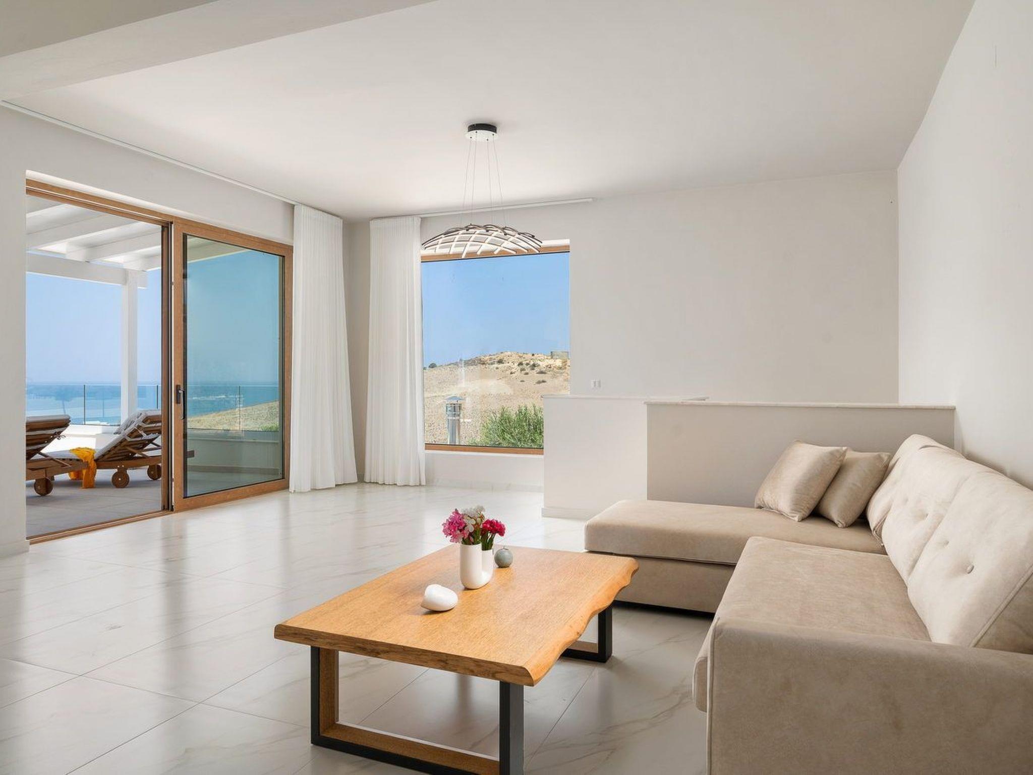 In the villa you will find a modern interior design on two levels with a total of 150m² of living space and a 50m² balcony, ideal for 4-6 people. The upper floor contains an inviting eat-in kitchen with smart home technology, sofa bed, high-quality kitchen equipment, dining table and panoramic windows that flood the room with light and bring the fascinating sea view directly into your living room. A staircase leads to the 3 spacious bedrooms on the lower floor, each equipped with king-size beds, Smart TV, fan coil air conditioning and an en-suite shower room, each with access to the pool and outdoor kitchen.