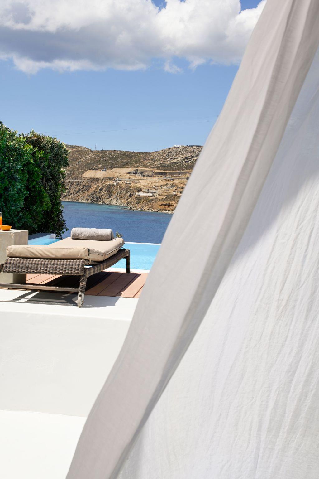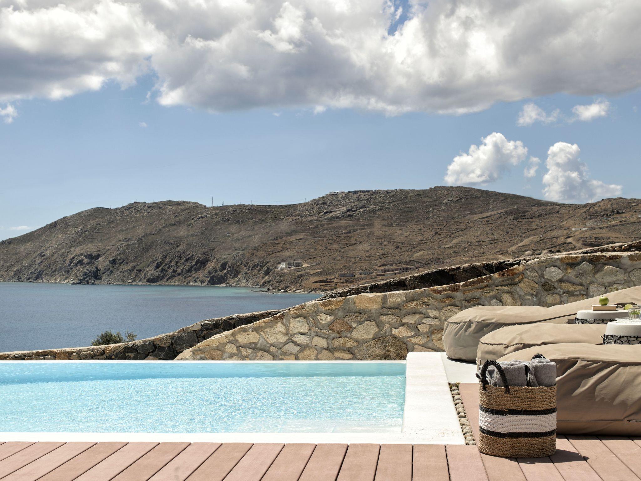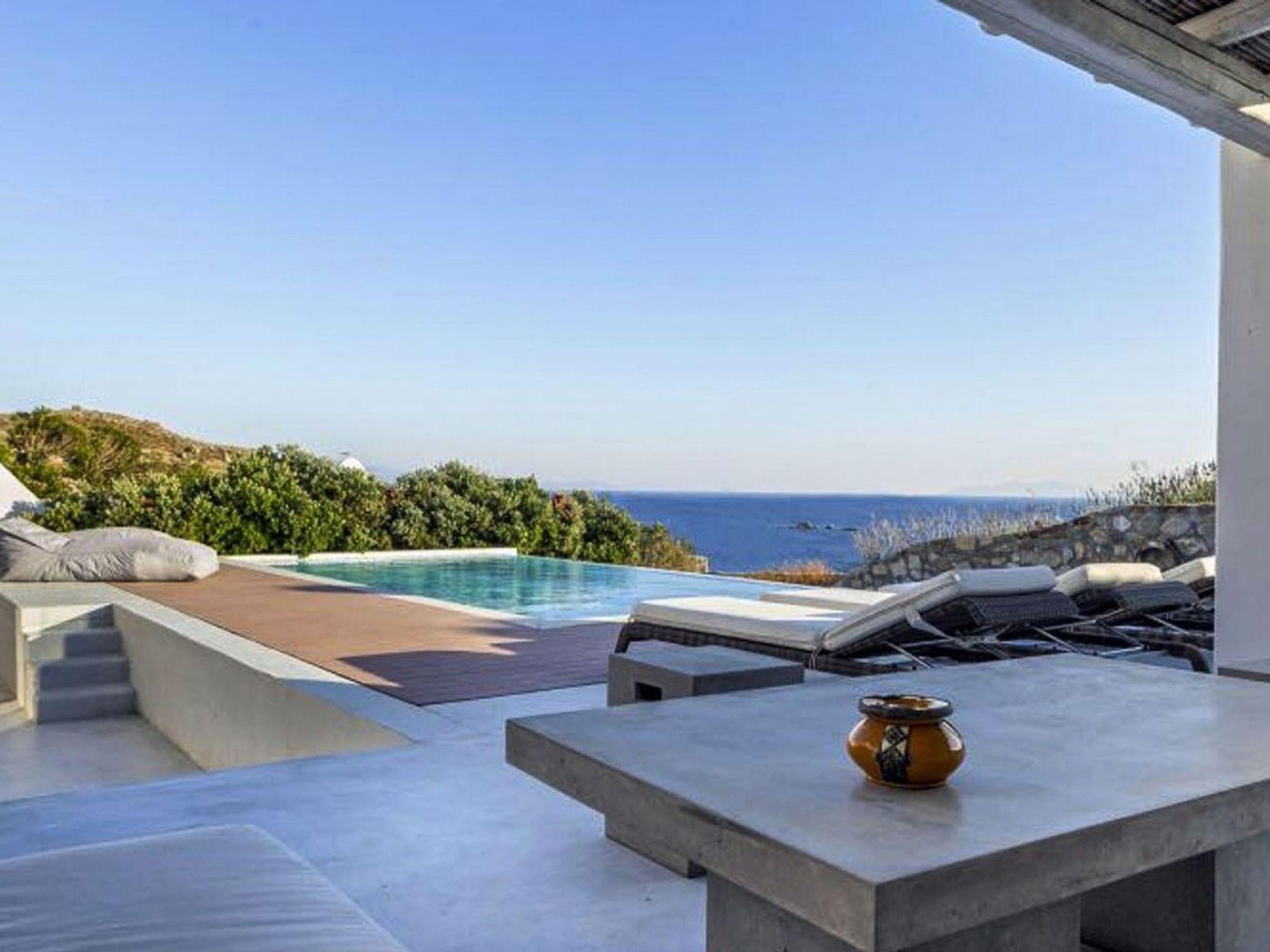 Enjoy moments of relaxation in the villa's comfy sunbeds, overlooking the refreshing swimming pool and the cosmopolitan beach of Kalo Livadi. Savour the moment in the pergola shaded area and enjoy some drinks, snacks or bbq with your friends. Apart from the pristine pool area, the villa offers a spacious veranda in the living room level, with exceptional sea views, making it another spot for gathering with your friends to enjoy a delicious breakfast or a rich dinner menu prepared by a professional chef!