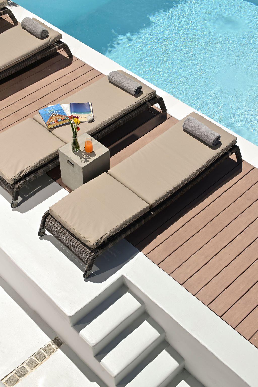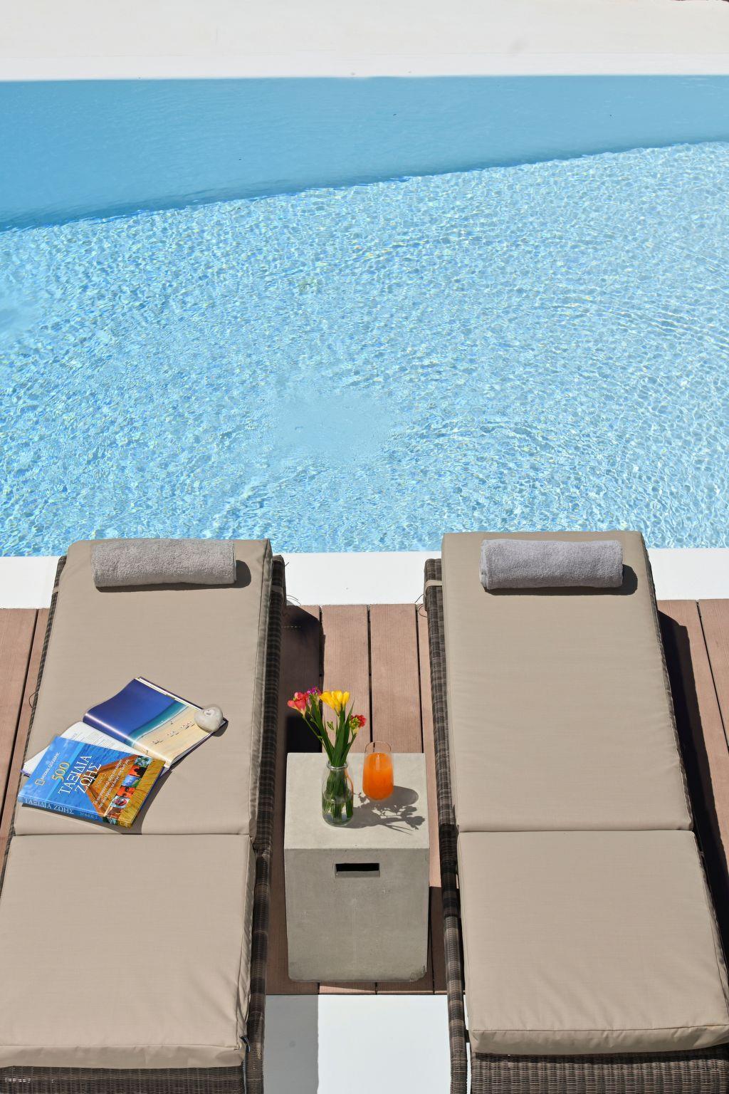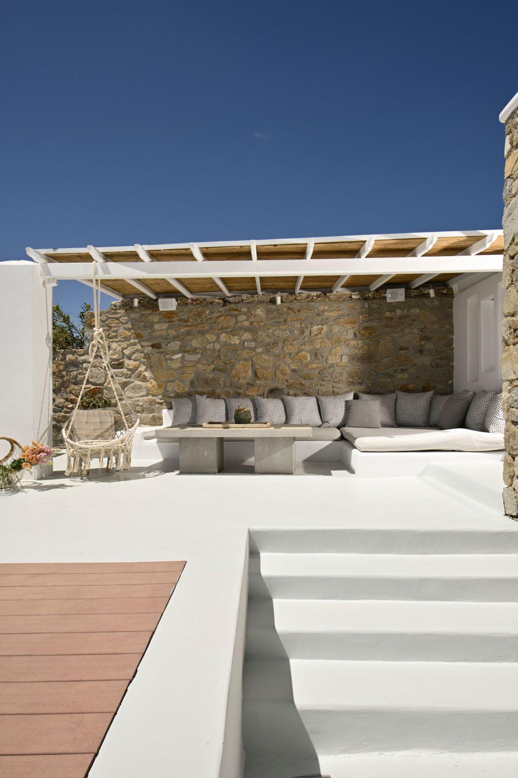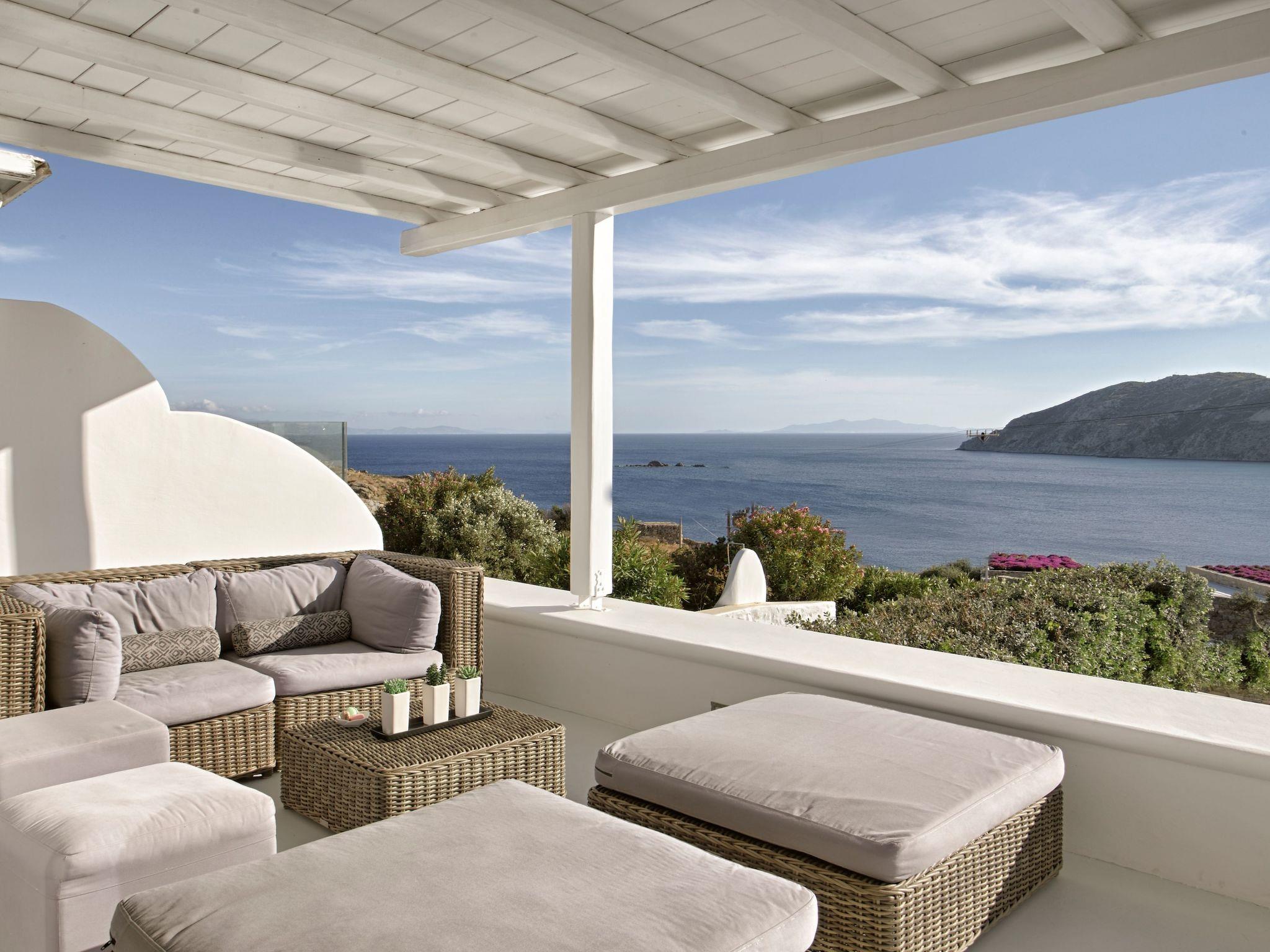 Enjoy moments of relaxation in the villa's comfy sunbeds, overlooking the refreshing swimming pool and the cosmopolitan beach of Kalo Livadi. Savour the moment in the pergola shaded area and enjoy some drinks, snacks or bbq with your friends. Apart from the pristine pool area, the villa offers a spacious veranda in the living room level, with exceptional sea views, making it another spot for gathering with your friends to enjoy a delicious breakfast or a rich dinner menu prepared by a professional chef!