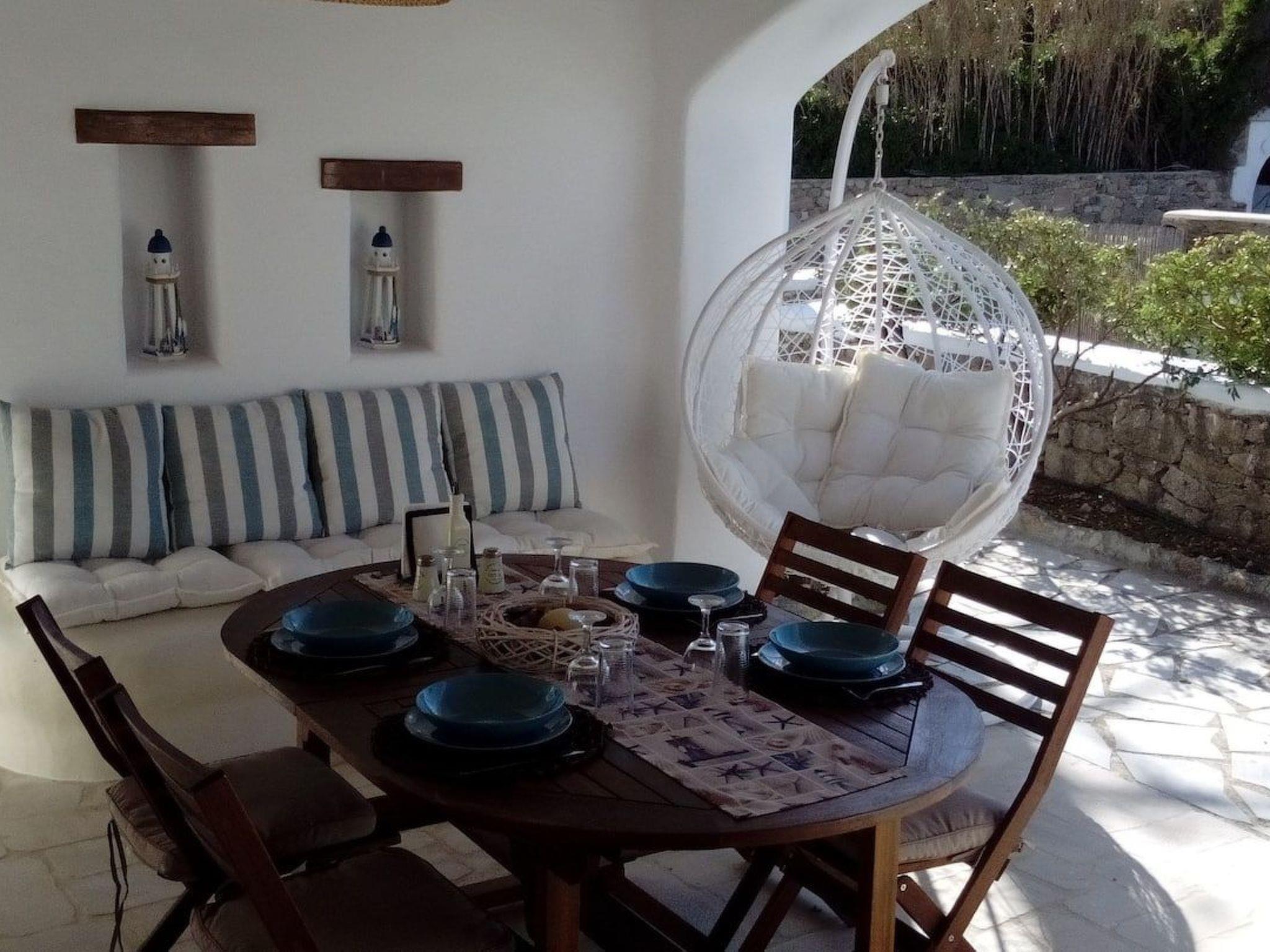 Mykonian Aroma House is a cosy,newly renovated and fully furnished house-the ideal setting for a dream vacation.Situated in a peaceful and luxurious complex,the house is ideal for families,small groups of friends and perfect for couples.Mykonian Aroma House is located on the ground floor,with no stairs,and immediate access to the olympic size swimming pool and the amazing private full of fragnant plants garden of the complex.The house accommodates 5 guests and it consists of a spacious living room in which there are 3 sofas(two of them can be converted into double beds).The house also offers a bright bedroom with a queen size bed,full closet,mirror,bedside tables and a bathroom next to it.The open plan kitchen is fully equiped with ceramic stove,oven,dishwasher,washing machine,kettle,blender,refrigerator/freezer,toaster and all types of sauce pans and dishes.Every room is cooled or heated with seperate aircondition.Satellite TV with international channels and free wifi internet connection are also provided.Baby cot and high chair are available upon request at no extra cost.Our guests can relax and enjoy their meals on our three big verandas with swimming pool and garden view.Two of them have garden-dinning tables and build-in couches.Our house has its own private entrance,too.