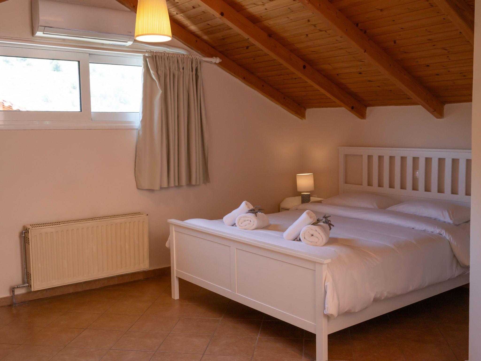 The ground floor is about 50 m² in size and comprises of the following rooms: A living room with a fireplace, a flat screen TV, a big sofa and chairs. There is also a fully-equipped kitchen with an oven, microwave, coffee machine, fridge, dishwasher and a dining area, as well as a bathroom with a shower. A marble staircase leads to the first floor, which includes: two separate bedrooms with double beds. The floor is complemented with a bathroom with shower and one extra toilet. There is also a 3rd bedroom with three single beds at the basement of the house, which can be accessed from the ground floor. There is central heating and AC for all the rooms, except the 3rd which is the coolest and has a fan.
