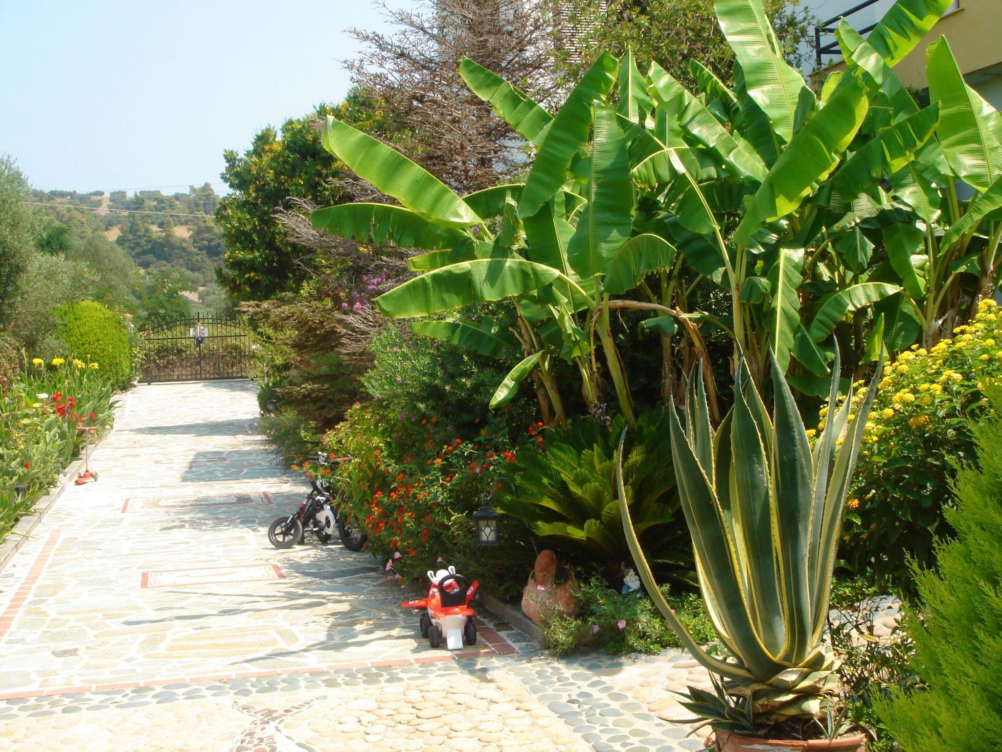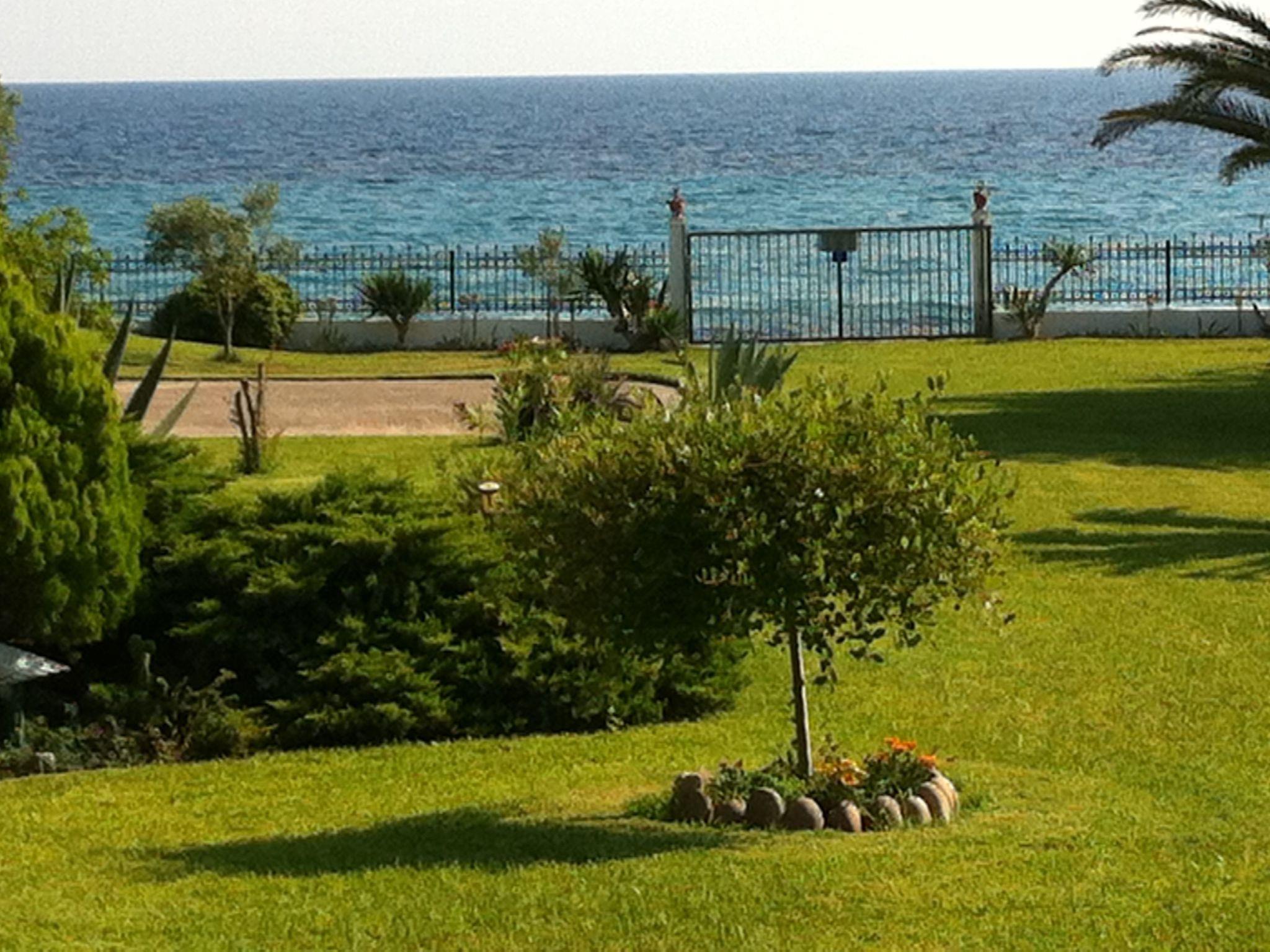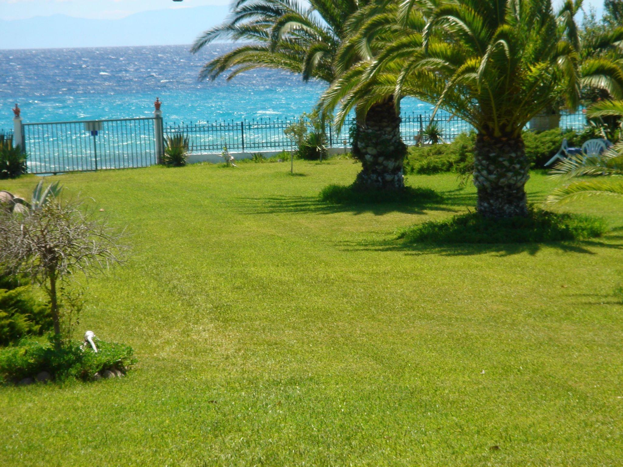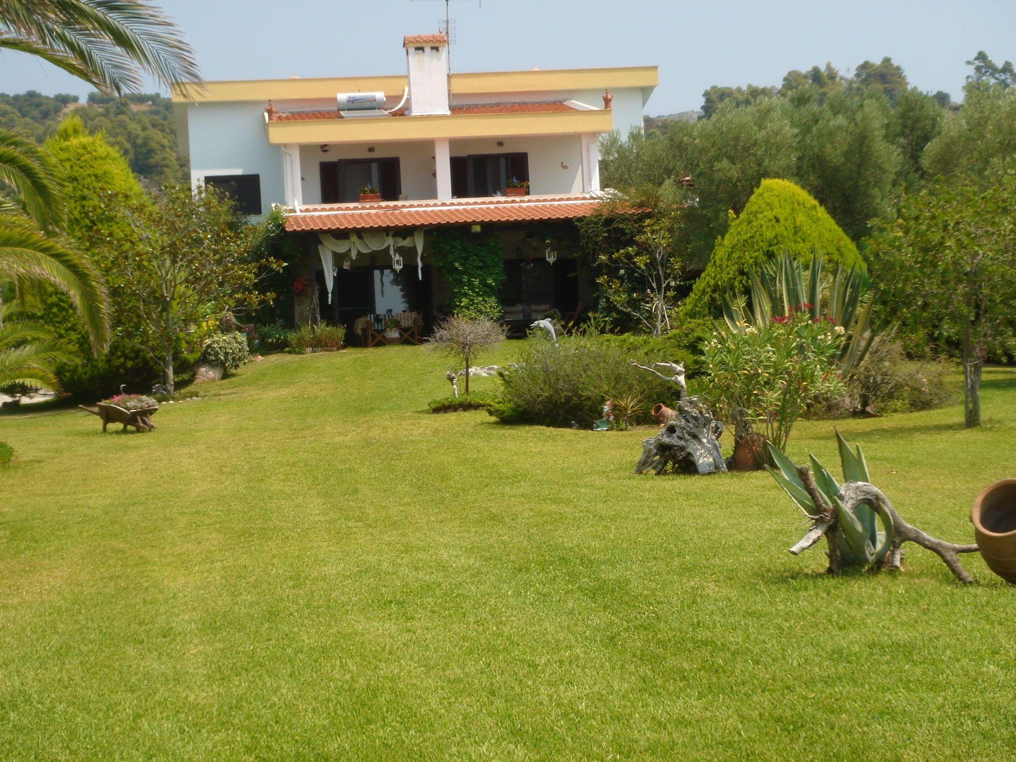 Here you will find a semi-detached beach house with a well-kept park-like garden for a relaxing holiday. You benefit from a very quiet location with views of the sea and the mountainous surroundings. Your holiday home is located near a tranquil fishing village on the south side of the Halkidiki peninsula, south-east of Tessaloniki. This means that the long, directly accessible beach at this location is rarely visited and is almost entirely yours to enjoy. The paradisiacal surroundings are characterised by a very dry microclimate, so that even banana trees grow here. During your stay, you will have a direct view of the sea from the garden, the lower veranda and the upper balcony.