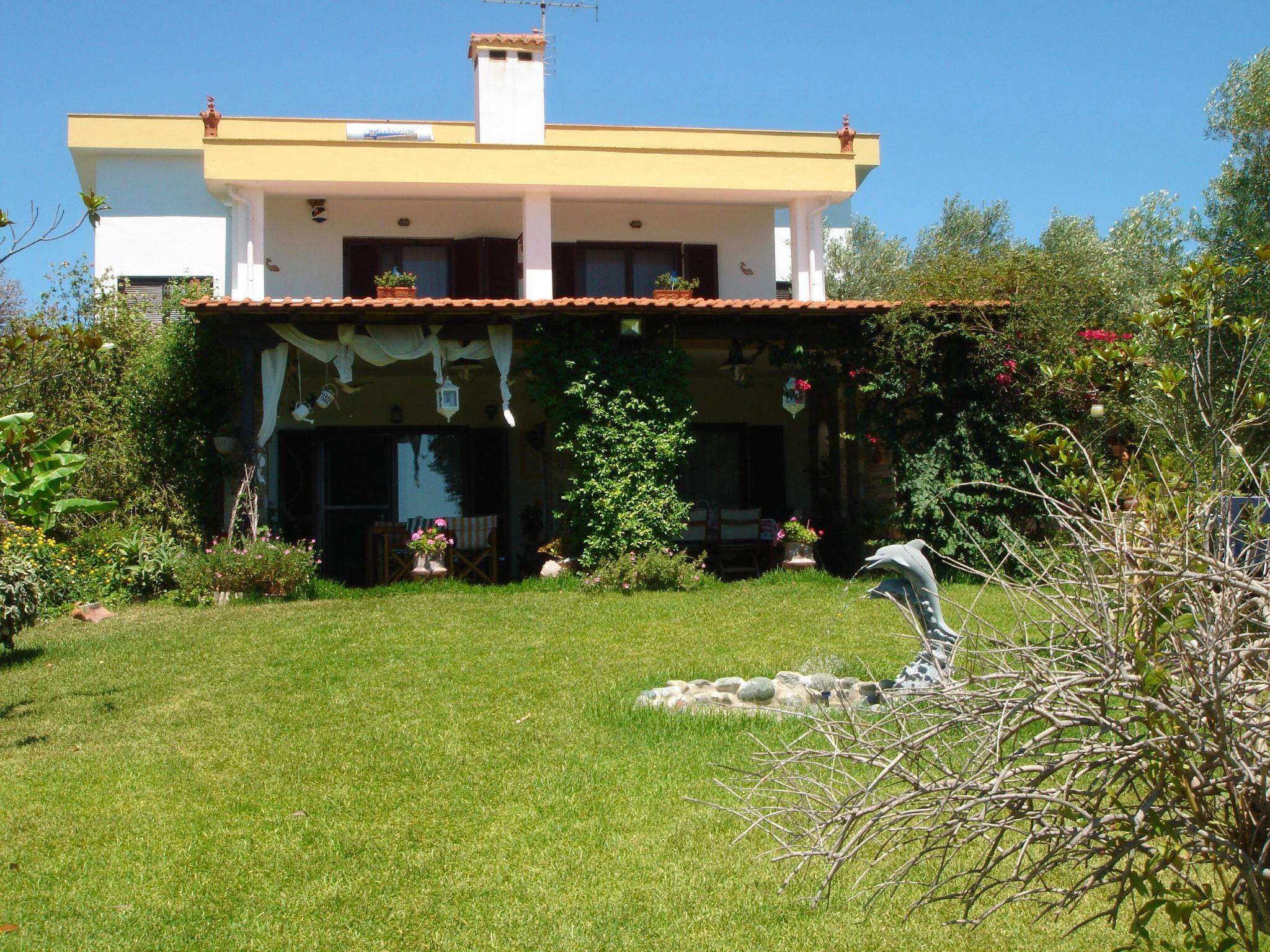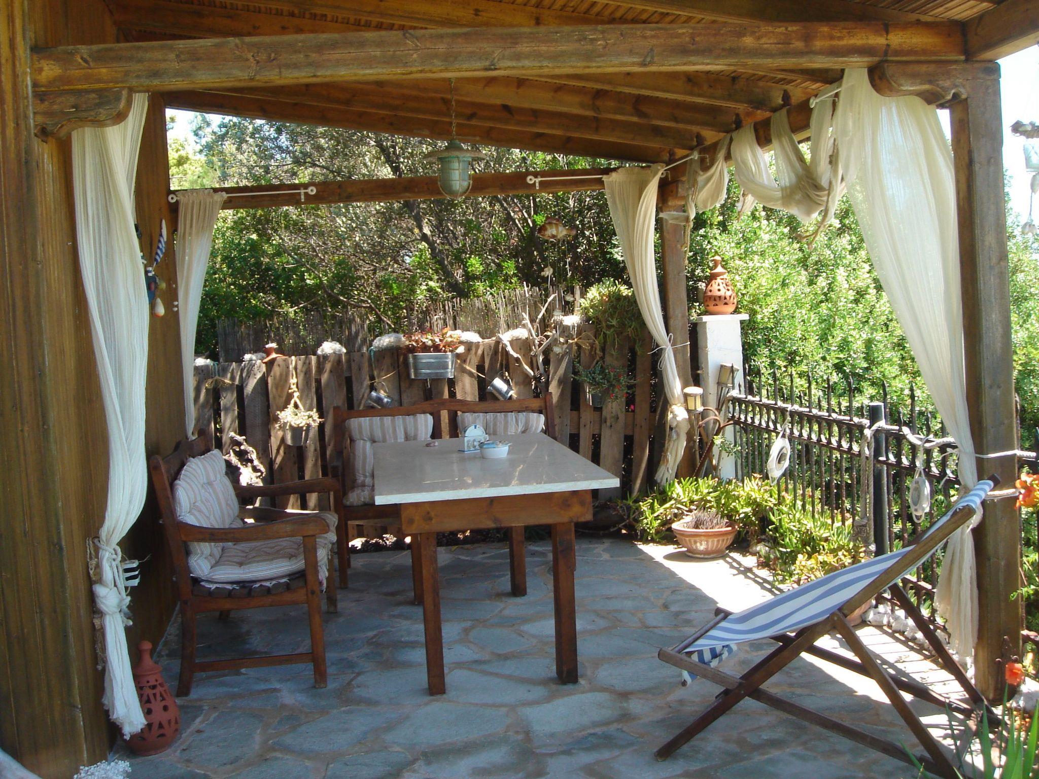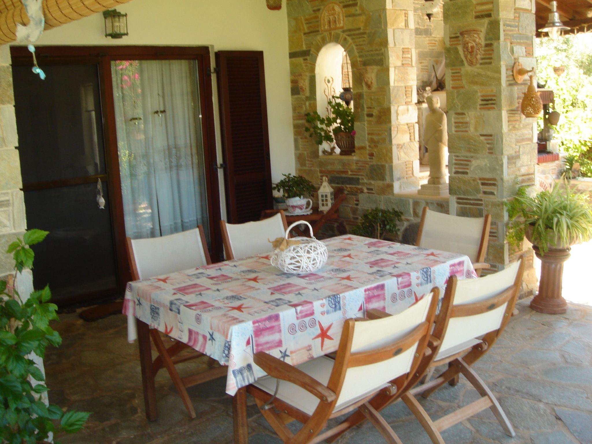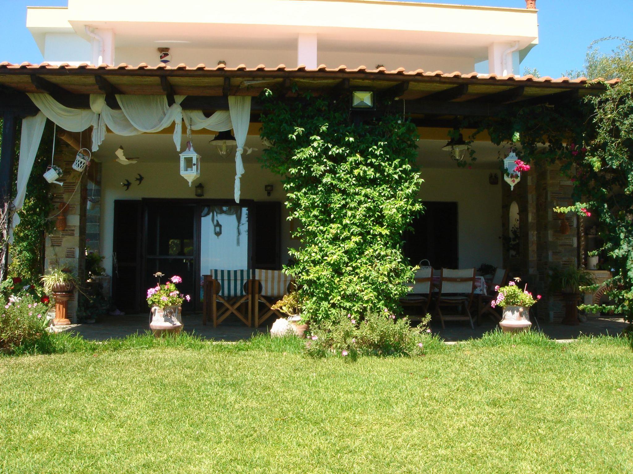Here you will find a semi-detached beach house with a well-kept park-like garden for a relaxing holiday. You benefit from a very quiet location with views of the sea and the mountainous surroundings. Your holiday home is located near a tranquil fishing village on the south side of the Halkidiki peninsula, south-east of Tessaloniki. This means that the long, directly accessible beach at this location is rarely visited and is almost entirely yours to enjoy. The paradisiacal surroundings are characterised by a very dry microclimate, so that even banana trees grow here. During your stay, you will have a direct view of the sea from the garden, the lower veranda and the upper balcony.