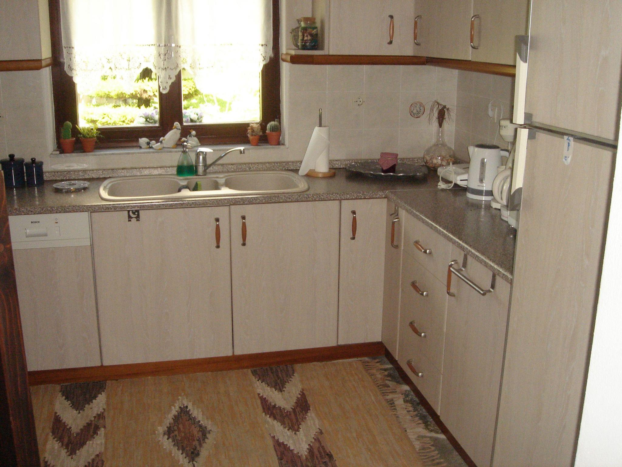 The two-storey house has a living space of 100 m². On the ground floor, measuring around 50 m², you are welcomed by a cosy living area with a fireplace, which leads past the dining table and the staircase to the upper floor into the fully equipped kitchen area. There is also a shower room with WC and wash hand basin. The three bedrooms are located on the upper floor. While you sleep in a double bed measuring 160 cm x 200 cm in the first double bedroom, there are two 90 cm x 200 cm single beds in the second bedroom. The third bedroom is furnished with a 90 cm x 200 cm single bed. The upstairs bathroom has a shower with a curtain in the bath, a hairdryer, a WC and a foot basin. The centrepiece of the house is the living area with two sofas for sociable hours after a day out. A fire in the fireplace creates a cosy atmosphere and the TV provides entertainment. At the round dining table, you can enjoy a home-cooked meal together. The kitchen allows you to prepare your own meals using the cooker with oven, dishwasher, fridge with freezer compartment and the usual small electrical appliances. Internet access via WLAN, bed linen and towels are also provided free of charge.