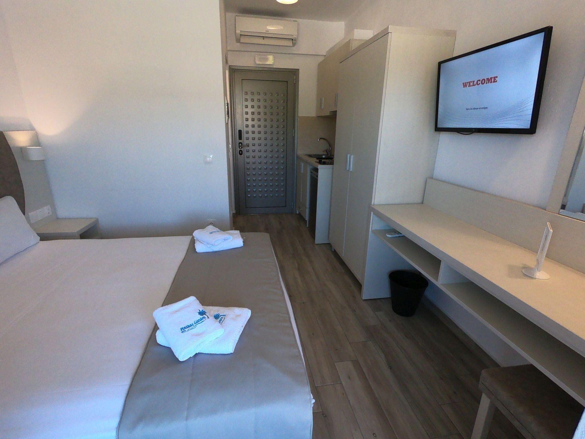 The studios comprise a double bed with bedside tables, a wardrobe, a suitcase rack and a desk. The bathroom has a toilet, washbasin, shower cubicle, hairdryer and toiletries. All the studios have quiet inverter air conditioning units, satellite TV and Wi-Fi with strong reception. The front doors are fitted with safety locks and card systems.