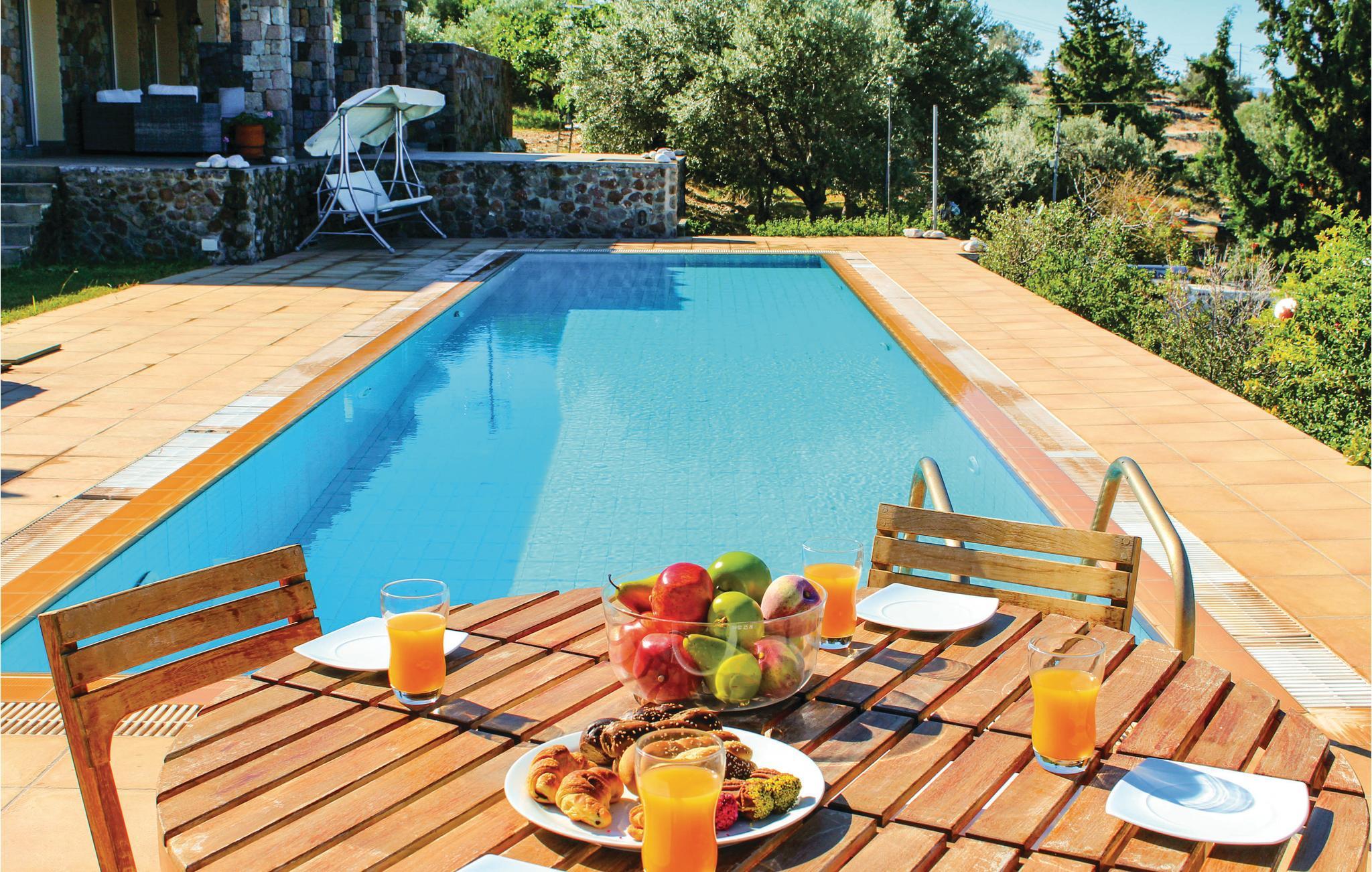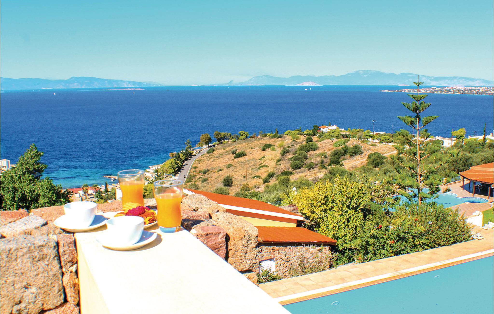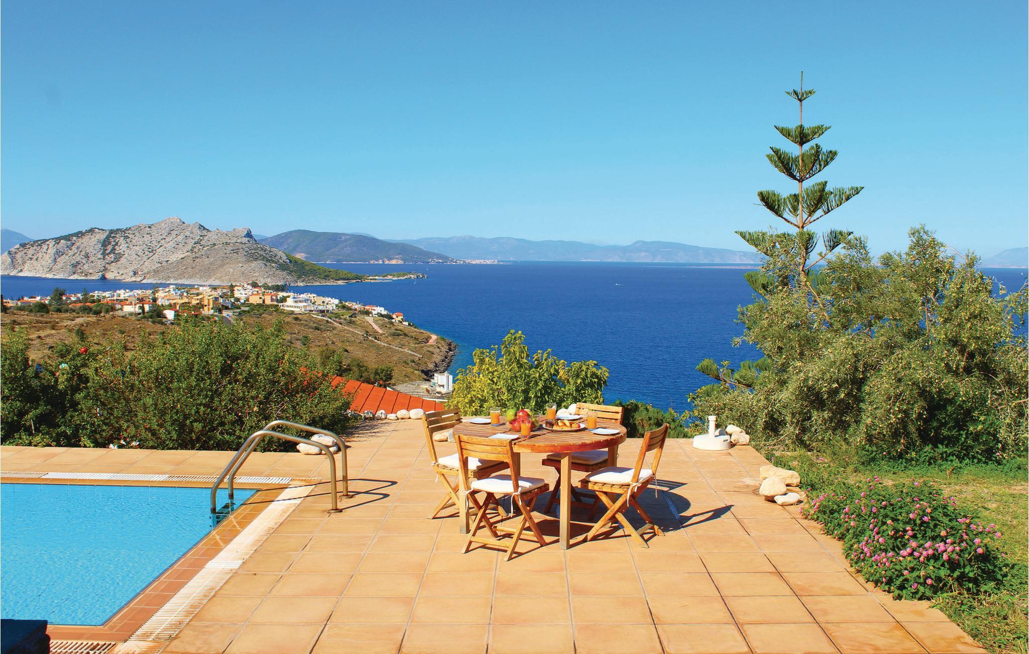 Dette moderne og stilfulde feriehus har en fremragende beliggenhed på den saroniske ø Égina, og er et perfekt valg til en herlig ferie i Grækenland. Til huset hører en privat swimmingpool, hvor I kan tage en forfriskende dukkert på varme sommerdage. I huset findes seks soveværelser, fem badeværelser, to køkkener og en rummelig stue-/spisestue. Til huset findes en dejlig, overdækket terrasse med spiseområde, hvor I kan sidde og slappe af, mens I nyder den storslåede udsigt over havet og fascineres af solnedgangen om aftenen. Der er kun 500 m til stranden fra huset.
