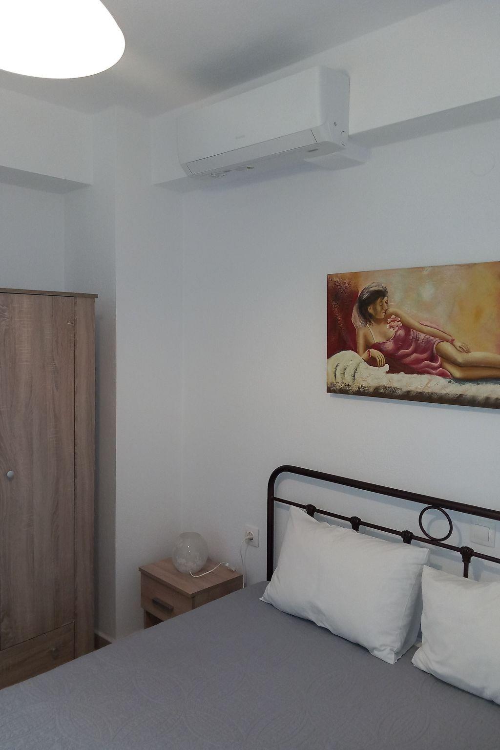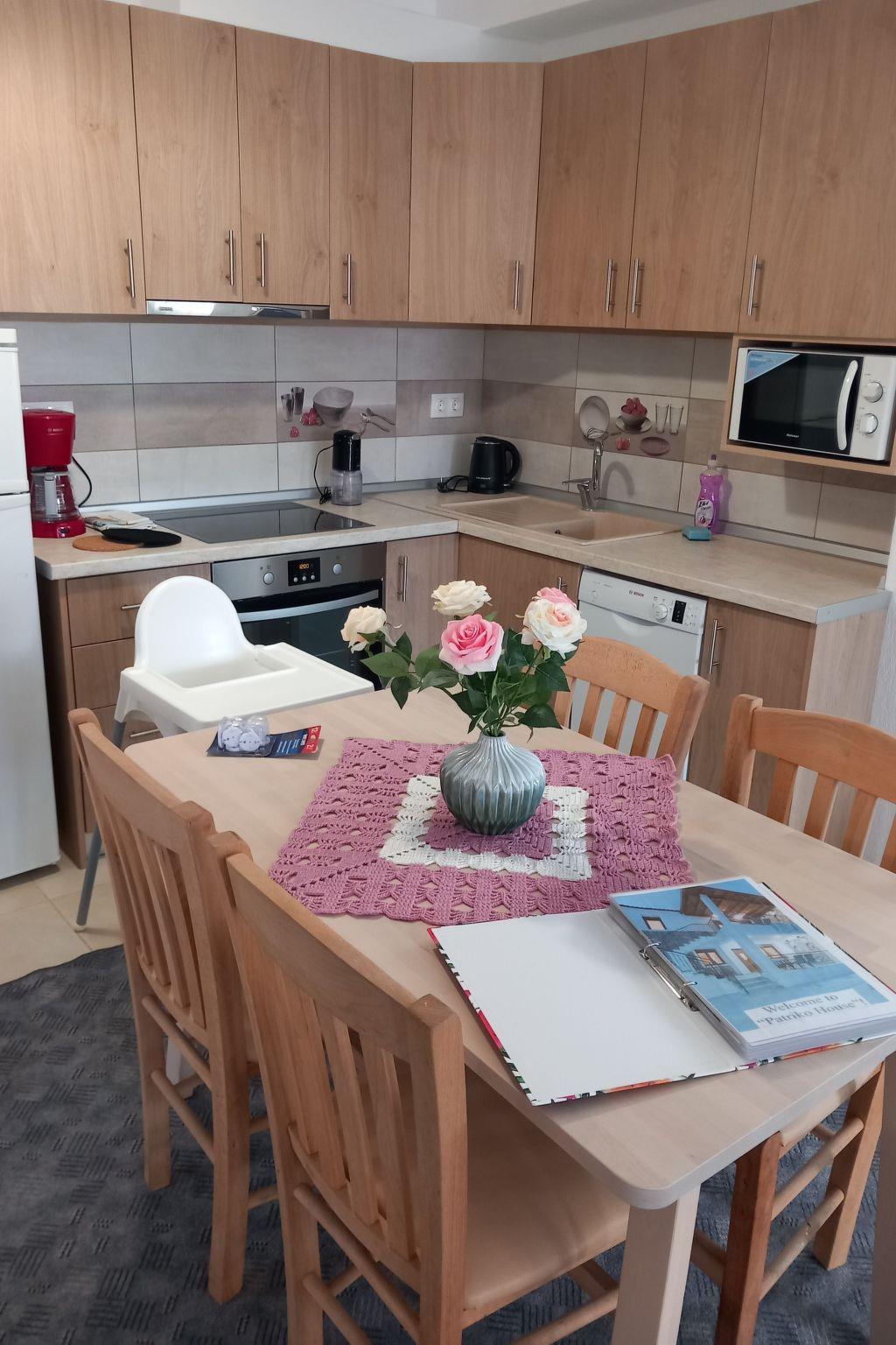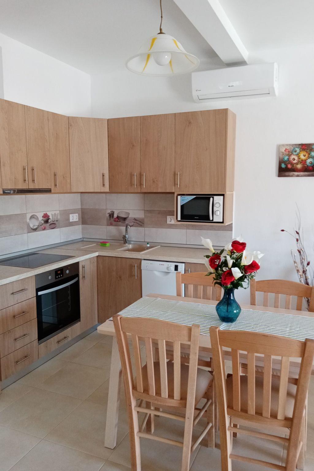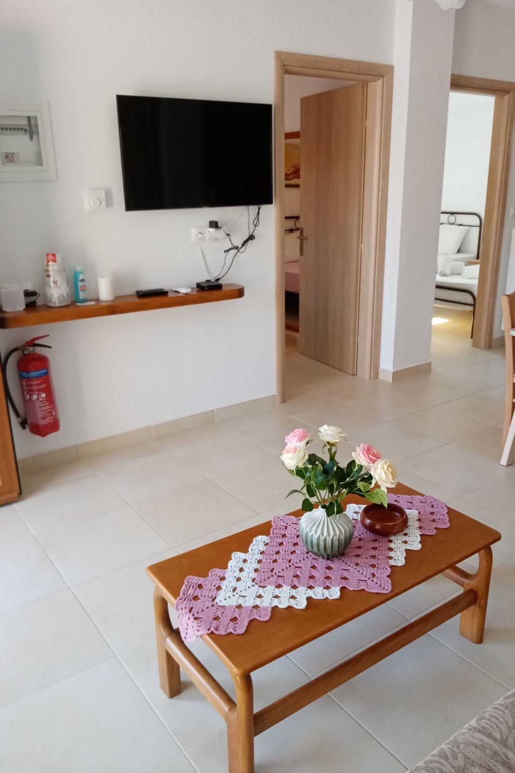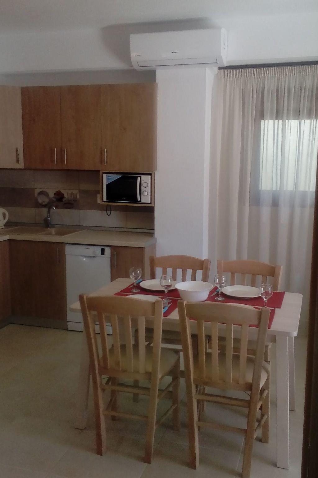 The flat has 2 bedrooms, one with a double bed and one with 2 single beds. Another person can sleep on the fold-out couch in the living room. A baby cot is also available. Babies and toddlers weighing up to 15 kilograms can sleep safely in there if required. The kitchenettes are fully equipped: Coffee machine, kettle, microwave, dishwasher, electric cooker, fridge and iron. In the bathroom you will find a washing machine and hairdryer. Hot water is supplied to the bathroom and kitchen by the solar system on the roof. A large flat screen TV hangs on the wall in the living room. A satellite dish on the roof ensures good reception of many German, English, French, Russian, Italian, Spanish and Turkish channels. Free Wifi is available. English and German books can be found in our bookshelf next to the front door should you get bored. Each flat has air conditioning in the living area and since 2024 also in the bedroom with the double bed.