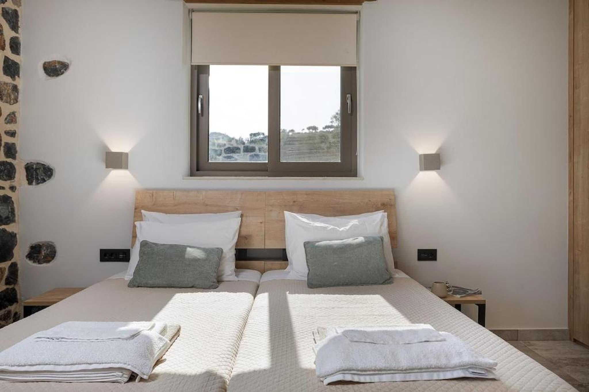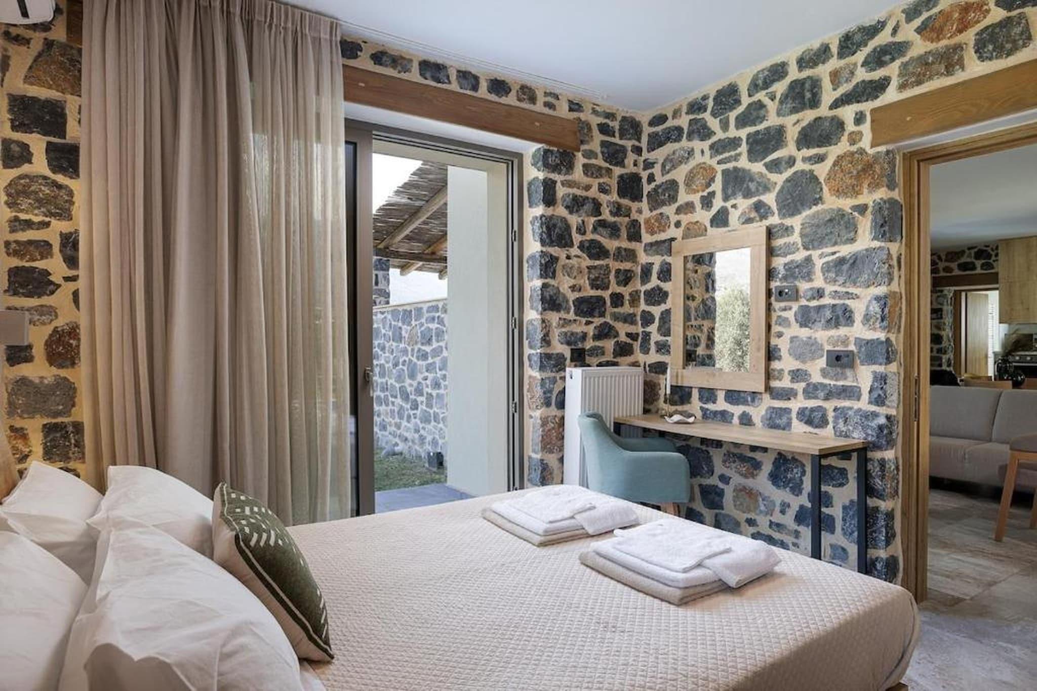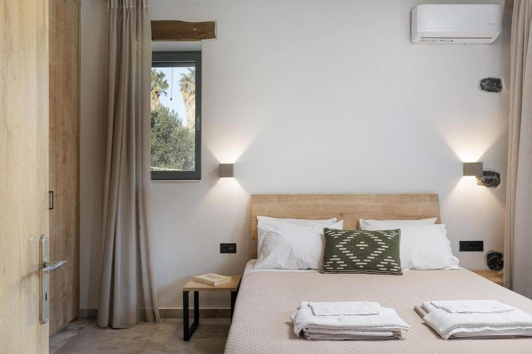 Denne villa med to soveværelser ligger i et fredeligt villaområde nær Damnoni-stranden og tilbyder et afslappet ophold omgivet af grønne områder og åben udsigt. Beliggenheden kombinerer privatliv med adgang til fælles udendørsområder, hvilket gør den velegnet til familier eller små grupper, der ønsker at nyde Kretas sydkyst. Indenfor har villaen to soveværelser og plads til op til fire gæster. Det største soveværelse har en dobbeltseng, mens det andet soveværelse har to enkeltsenge, hvilket skaber en klar og praktisk planløsning. Opholdsstuen inkluderer komfortable siddepladser, et tv og en spiseplads til fælles måltider. Et fuldt udstyret køkken inkluderer apparater såsom ovn, opvaskemaskine, køleskab, mikrobølgeovn og kaffemaskine, hvilket gør det nemt at tilberede måltider. Ejendommen har også et badeværelse med bruser, samt faciliteter såsom WiFi, aircondition, vaskemaskine og privat parkering for daglig bekvemmelighed. Udenfor åbner villaen ud til en privat terrasse med havemøbler, der tilbyder et behageligt sted til udendørs spisning eller afslapning i den friske luft. Gæsterne har også adgang til en fælles swimmingpool omgivet af grønne områder samt grillfaciliteter, der forbedrer udendørsoplevelsen. Villaen ligger i nærheden af Damnoni og Plakias, i nærheden af sandstrande, kyststier og vandaktiviteter. Nærliggende tavernaer og traditionelle landsbyer tilbyder lokale spisemuligheder, mens byen Rethymno byder på kulturelle seværdigheder, markeder og historiske gader at udforske. Denne villa tilbyder en afbalanceret base for både afslapning og opdagelse.