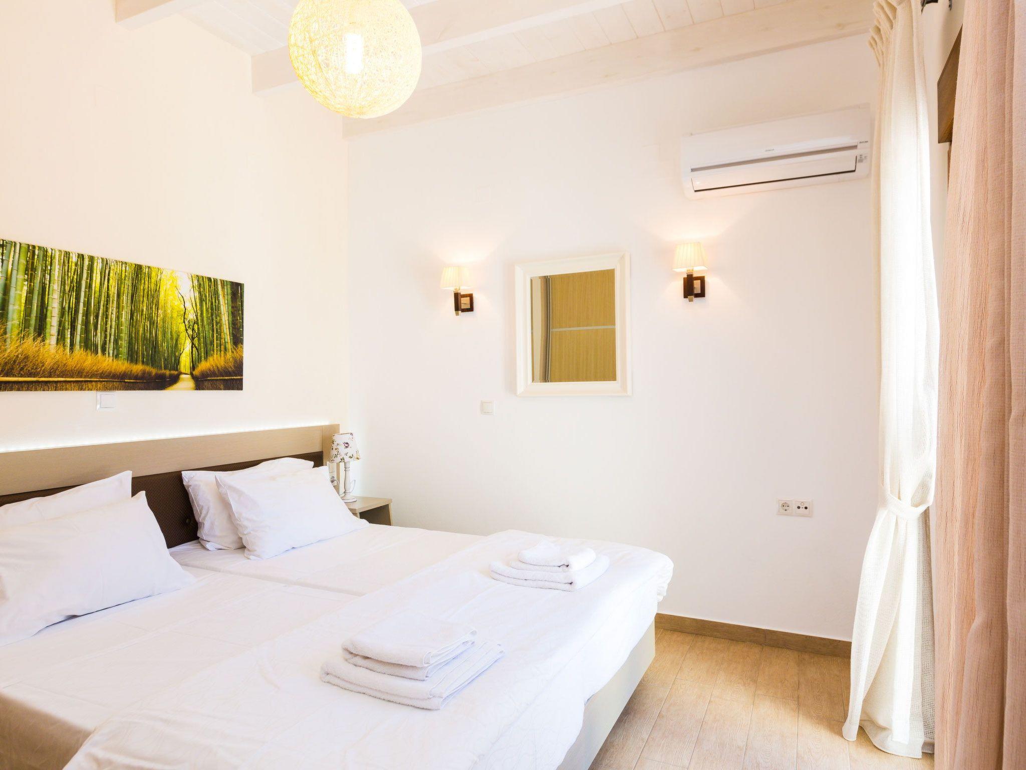 After entering the stone paved path leading to the secure garage and leaving your car, you climb up the staircase and find yourselves in the outdoor area of Kampos Villa, which could only be described as a summer fantasy! To start with, there is a big sunbathing terrace, featuring a 25 sq. m. private heated swimming pool (1.50m deep) and a lawn covered area, equipped with sun beds, umbrellas and an outdoor shower, where you can relax and enjoy the sun and fresh country side air all day long! It also features an outdoor sitting area and stone built BBQ facilities with an extra sink, for doing the cleaning up, after enjoying you homemade meal and al fresco dining!o make things even better, the two Villas share a shaded playground area, located right next to the BBQ facilities, with children’s toys and covered with a soft pad, where our younger guests will love to spend their time, as well as an extra relaxation area with sun beds and umbrellas. Additionally, guests have access to the wonderful vegetable garden, where they can help themselves to fresh vegetables for their meals!Pool Heating Policy:-The pool can be heated March-May, October-November and the days with outside temperature less than 25 °C.-The pool needs 24h prior notice, before the arrival, to reach 23 °C. The pool should be heated for minimum 3 days use per time. Prior notice is required.-Water temperature can reach up to 26 °C degrees, depending on the outdoor temperature.-In case of rain there won’t be a possibility to use the pool.