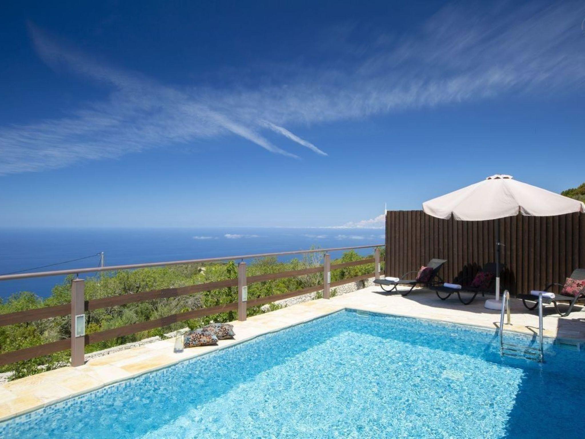 The private pool area gives a spectacular view of the Ionian Sea and invites you to relax outside with friends or family. The stunning sunsets with their wide range of colours will offer unforgettable magical moments and the high-end balcony will make you feel that you are hoovering above the sea.