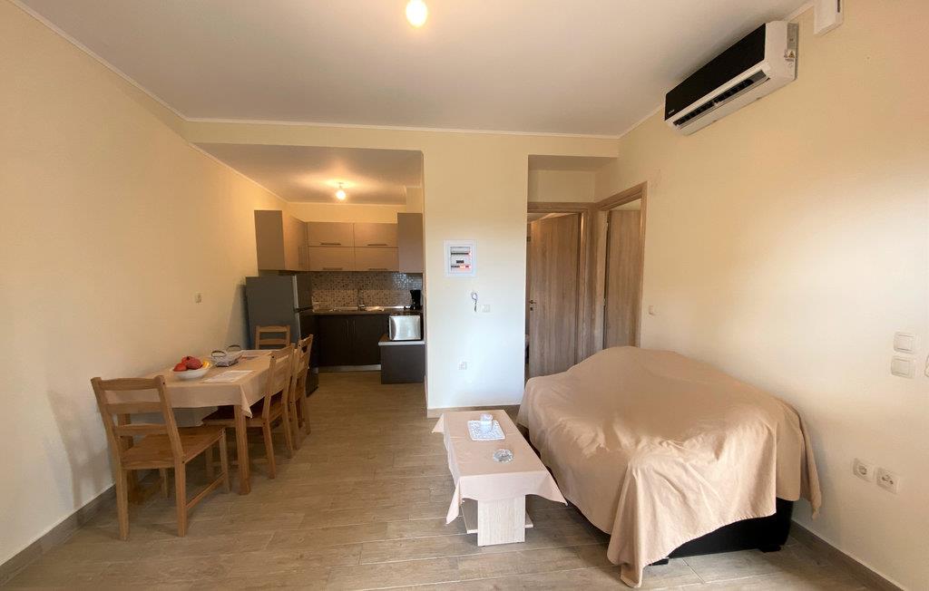 Dette skønne feriehus består af fire pæne lejligheder. Denne lejlighed ligger i stueetagen og indeholder alt, hvad I får brug for til en ferie uden bekymringer. Indretningen er enkel og funktionelt i en varm farveskala, og I kan se frem til at spise morgenmaden på jeres egen terrasse.