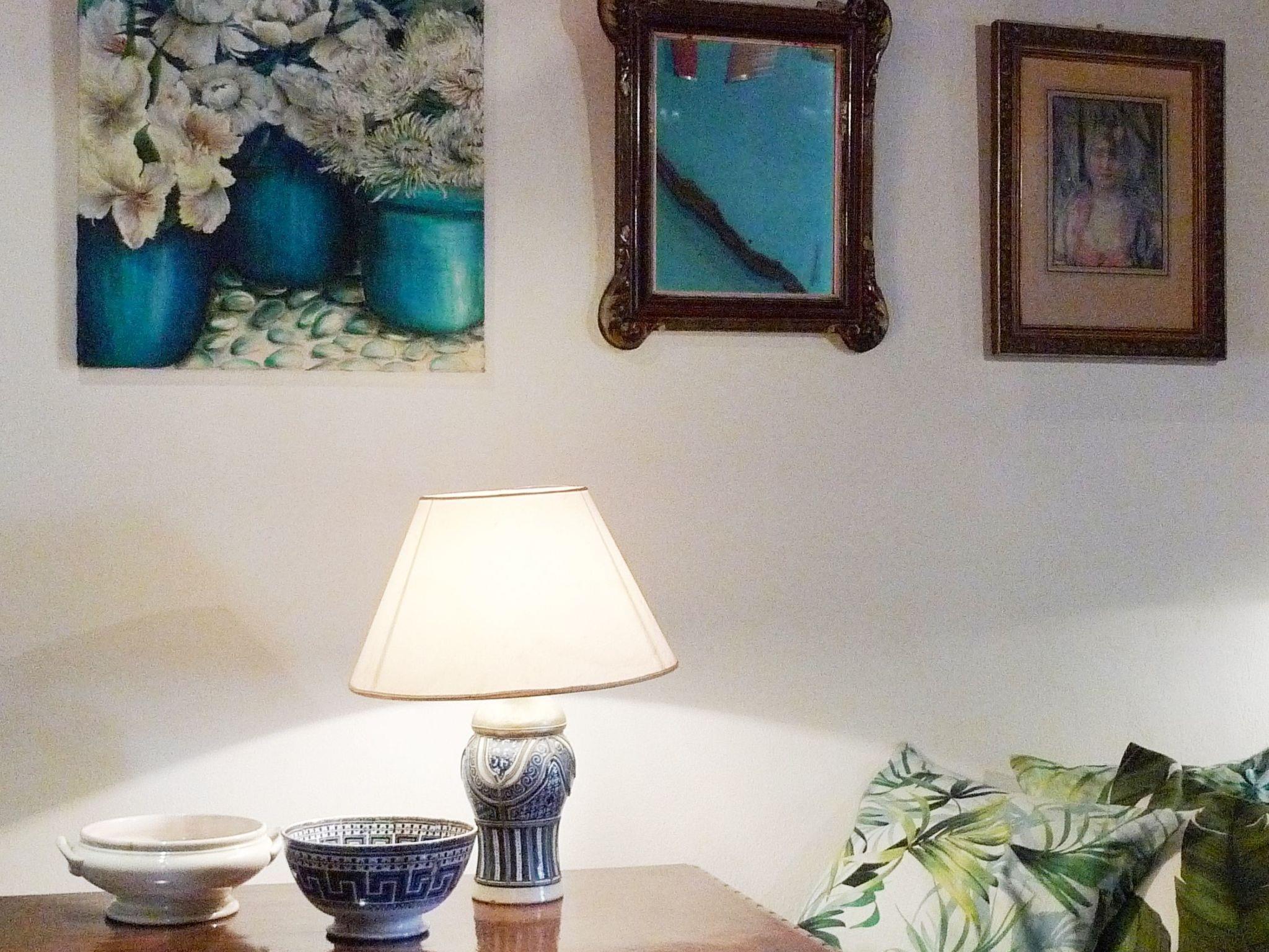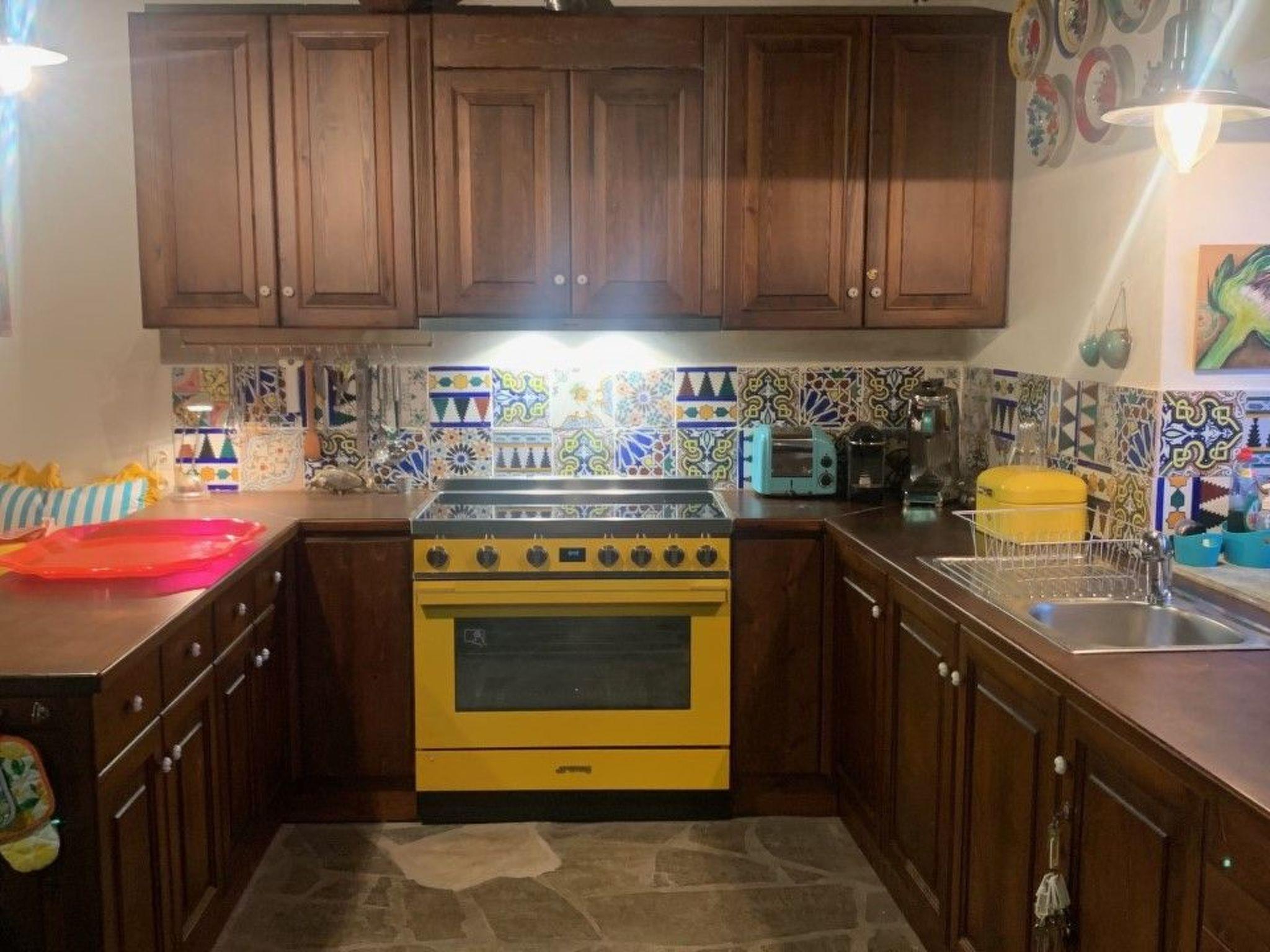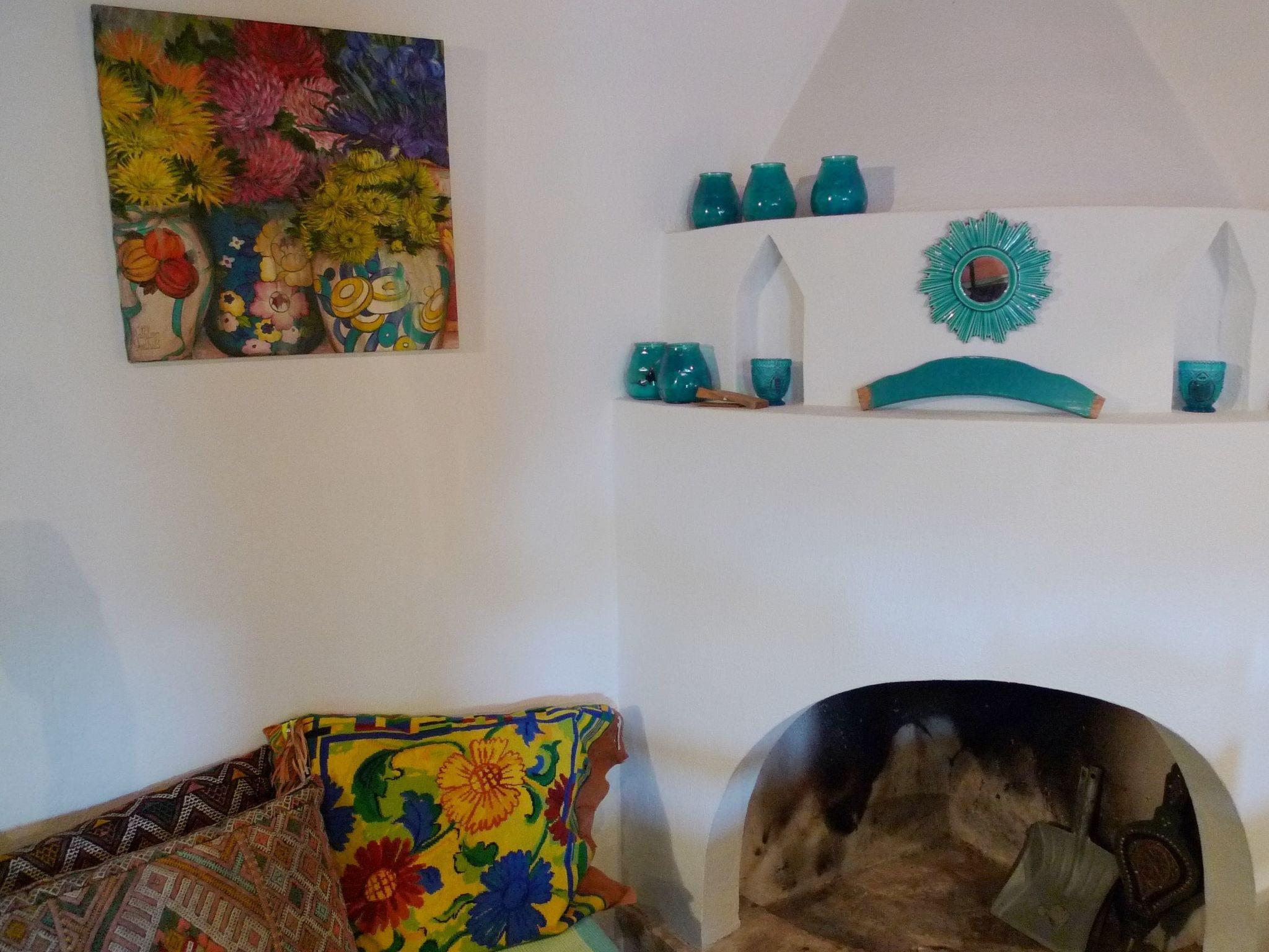 The house has a living area of 80 m² and can accommodate two people. Through a large walled courtyard, you enter the spacious living room on the ground floor. A breakfast bar separates the living room with fireplace, large sofa and beautiful old dining table from the beautiful kitchen. This is equipped with a high-quality cooker, oven, fridge, microwave, coffee machine and kettle. Also on the ground floor is the bathroom with shower, toilet, a beautiful sink and decorative mirrors. There is also a hairdryer. An open staircase leads to the dreamy bedroom with four windows, a ceiling with wooden beams and another fireplace. The room occupies the entire upper floor. The windows offer views of the sea and mountains. Wardrobes and drawers are built into the wall. The double bed is 160 x 200 cm. There is air conditioning with hot-cold function throughout the house. The imaginative decoration and tasteful furnishings make this homey and inviting, creating a sense of security and privacy.