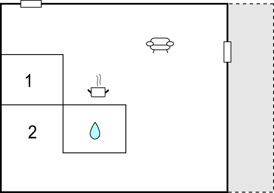 Over hele lejlighedens bredde har I en dejlig altan med havemøbler. Fra omkring kl. 13 har I masser af sol der og kan nyde en smuk solnedgang om aftenen. Den lyse stue har en dejlig opholdsstue med to sofaer og tv og et spisebord med seks stole. Der er også en sovesofa, der også kan sove to personer mere. Det separate køkken har et langt bord med stole. Badeværelset har et badekar med bruser, håndvask og toilet bag en separat dør. Der er to soveværelser på den rolige bagside af lejligheden. Et soveværelse har en dobbeltseng. Det andet soveværelse har to enkeltsenge.