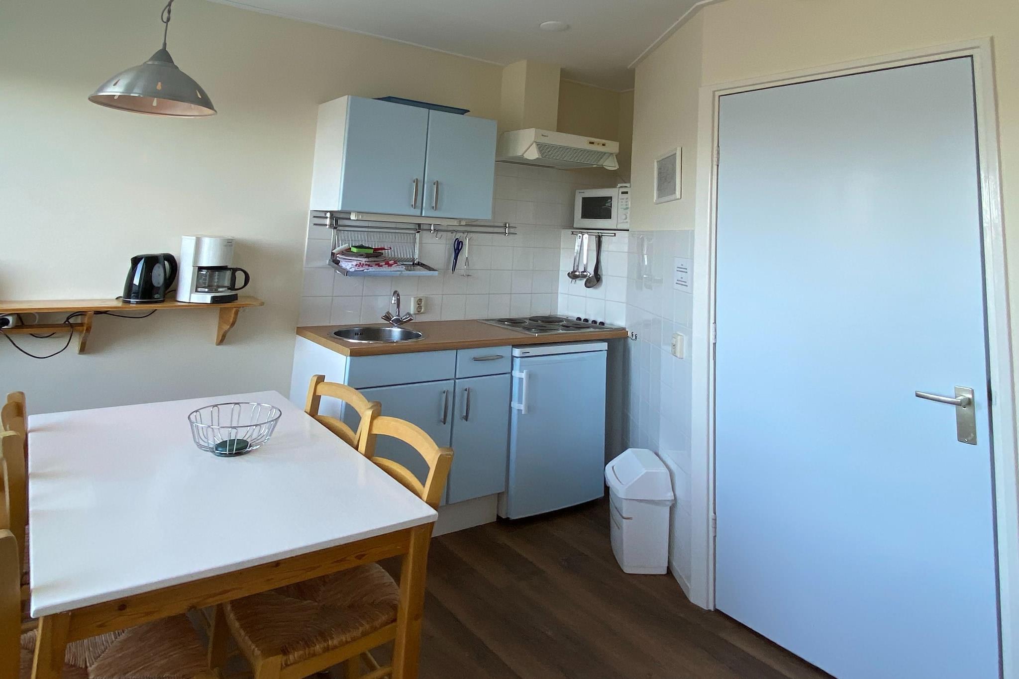 På 2. etage(via forholdsvis stejle trapper): (entre(toilet), tekøkken(kogeplade(elektrisk), elkedel, brødrister, kaffemaskine(kaffetragt, kaffepude), mikrobølgeovn, køle-fryseskab), stue / spisestue(Fjernsyn(fladskærm), spisebord(4 personer), sofahjørne(4 personer), barnestol), soveværelse(dobbeltseng(to enkeltdyner, 140 x 200 cm)), badeværelse(bruser, håndvask, vaskemaskine), balkon, havemøbler(4 personer)) På 3. etage(via forholdsvis stejle trapper): (soveværelse(2x enkeltseng), Repos(barneseng))