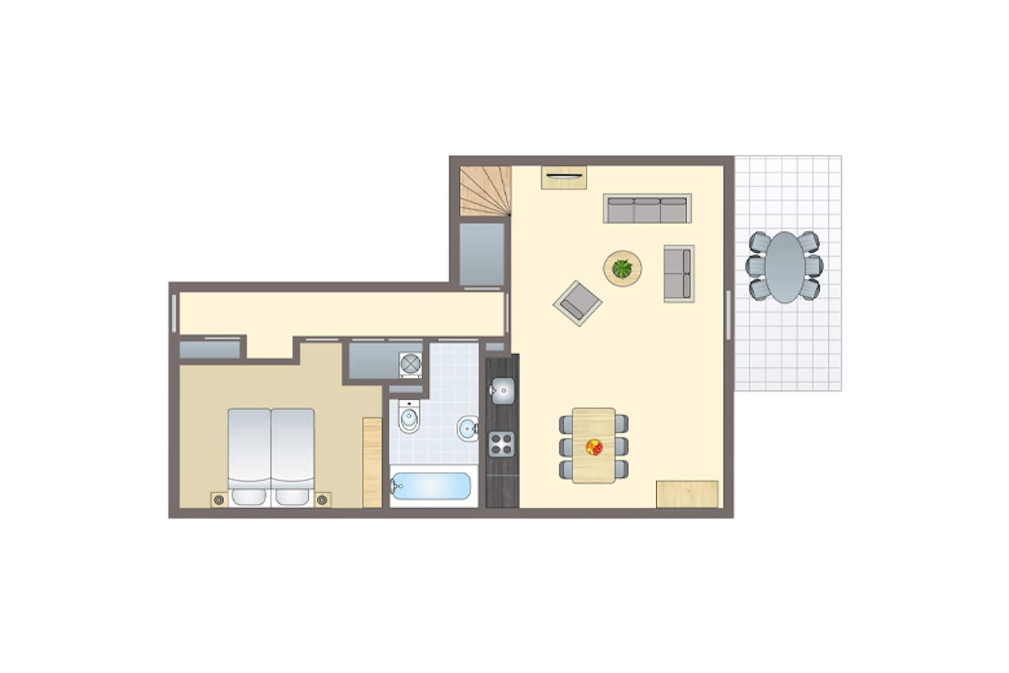 På 1. etage: (entre, Stue(Fjernsyn, radio, hyggespil, Chromecast), åbent køkken(elkedel, brødrister, komfur, kaffemaskine(kaffetragt, kaffepude), mikrobølgeovn, opvaskemaskine , køle-fryseskab), soveværelse(dobbeltseng eller 2 enkeltsenge Senge), badeværelse(badekar eller bruser, håndvask, toilet), pulterkammer(vaskemaskine)) På 2. etage: (soveværelse(enkeltseng, enkeltseng), soveværelse(enkeltseng, enkeltseng), Repos(trappegitter)) balkon, havemøbler, parkering, barneseng, barnestol, trappegitter