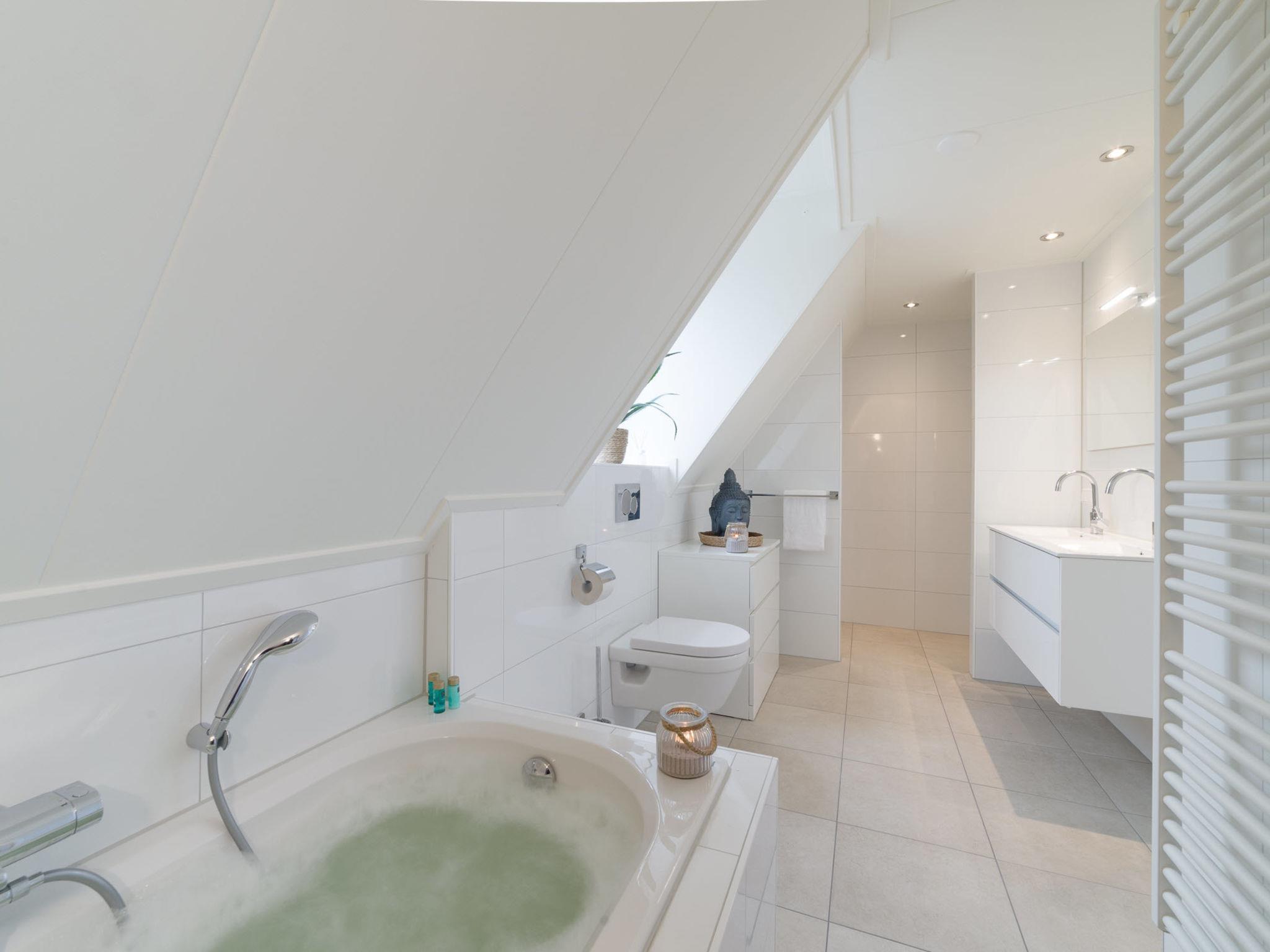 "8-persoons", 5-room house 126 m2 on 2 levels. Comfortable furnishings: living/dining room with dining table and flat screen. Exit to the terrace. 1 room with 2 beds (90 cm, length 210 cm), TV. Open kitchen (oven, dishwasher, 4 induction hot plates, kettle, microwave, electric coffee machine, Capsules for coffee machine (Nespresso-not incl.)). Shower/WC, Sauna. Underfloor heating. Upper floor: with sloping ceilings, 3 rooms, each room with 2 beds (90 cm, length 210 cm), TV. Bath/shower/WC. Terrace. Terrace furniture, barbecue, box-room. Facilities: washing machine, dryer, hair dryer. Internet (WiFi, free). Parking at the house. Please note: non-smoking house. Smoke alarm. Pets on request.