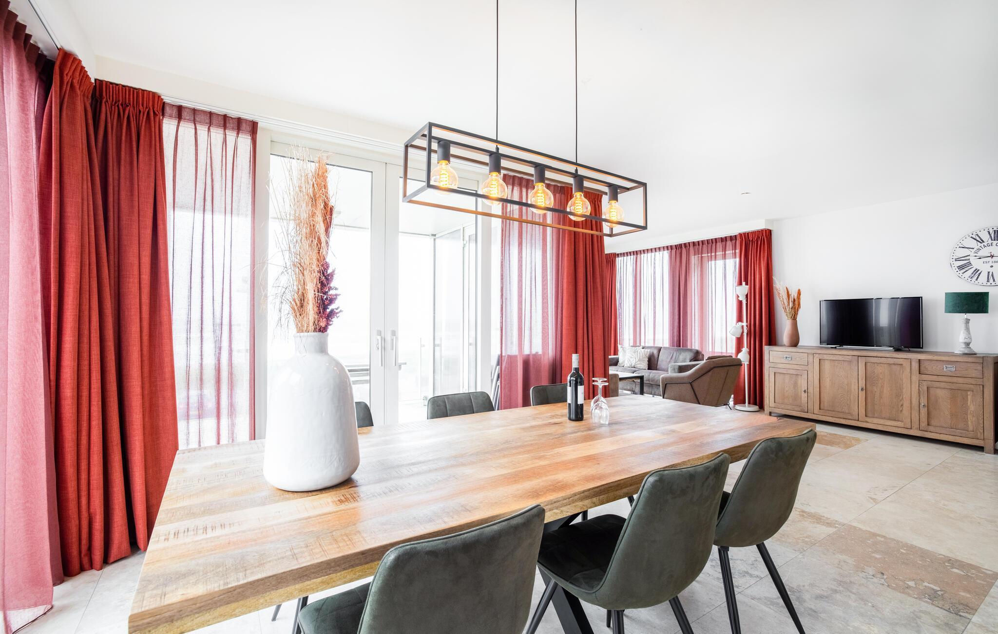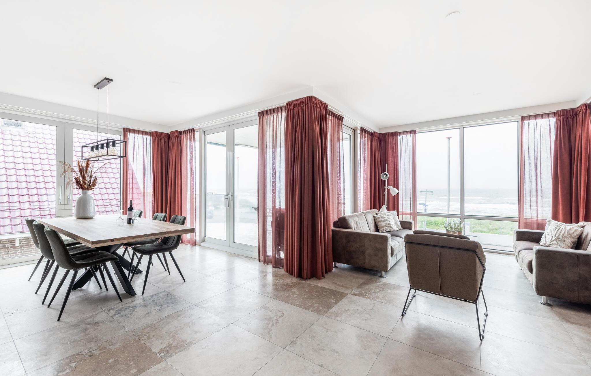 Velkommen til denne skønne ferielejlighed, som ligger på første sal i en moderne lejlighedsbygning lige ved havet. Den rummelige arkitektoniske stil og masser af glas giver jer en betagende panoramaudsigt over Nordsøen. Find jer godt til rette, slap af på sofaerne og lav lækre måltider i det veludstyrede køkken. Denne komfortable ferielejlighed byder på plads til familien.