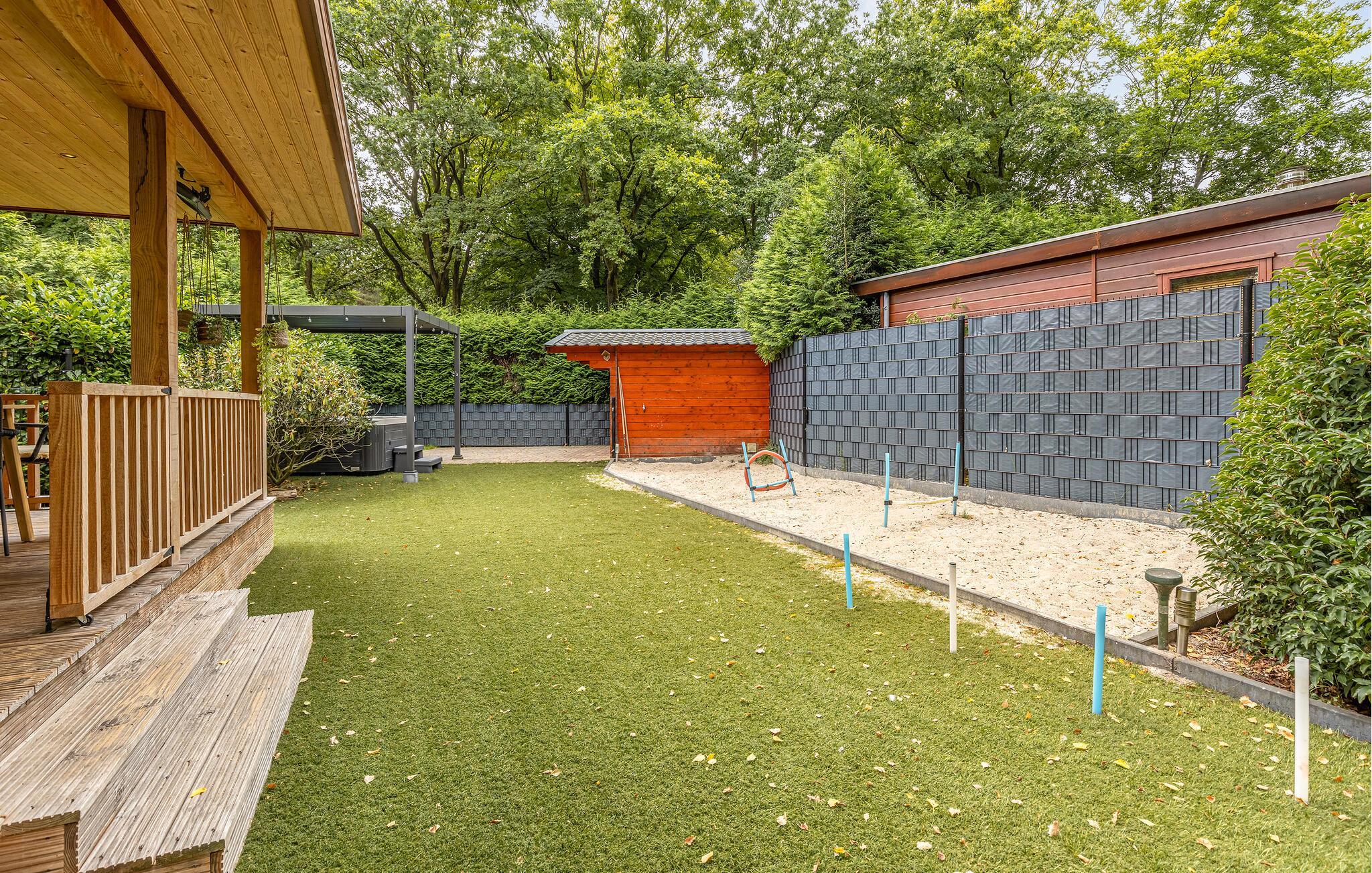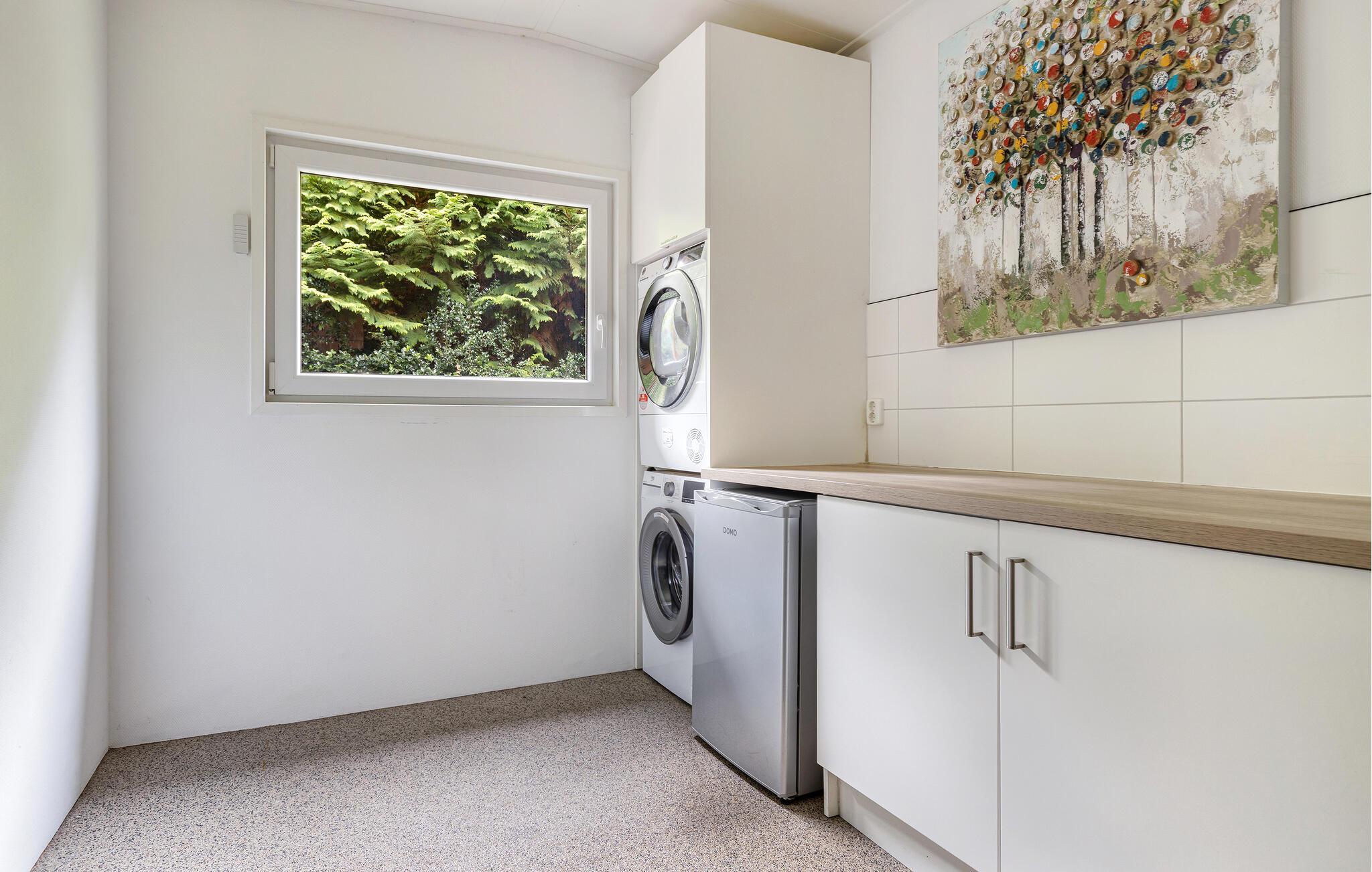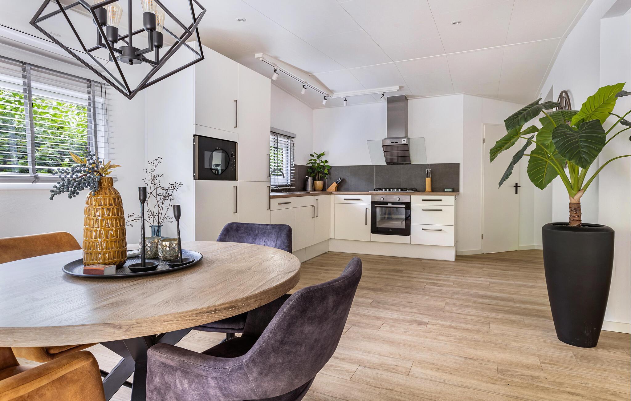 Tilbring en afslappende parferie i et charmerende feriehus omgivet af natur og med masser af komfort. Træd ind i den lyse, kærligt møblerede opholdsstue med store vinduer og komfortable siddepladser. De smagfulde møbler i bløde farver skaber en venlig og indbydende atmosfære. Læn jer tilbage og lad blikket vandre over det grønne. Nyd jeres måltid ved spisebordet ved siden af ??det åbne køkken, som lægger op til at lave mad sammen.