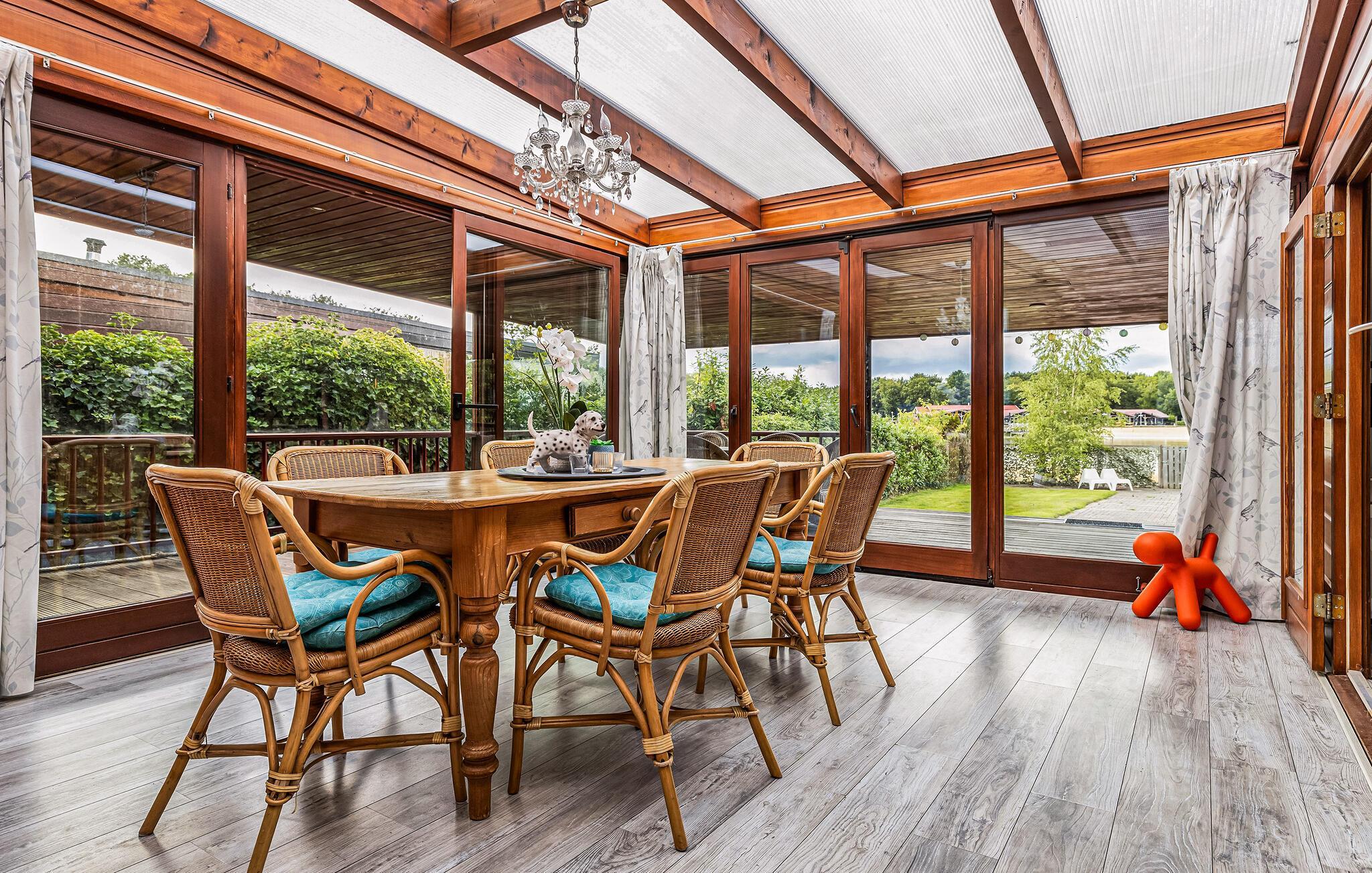 Træd ind i den lyse, velindrettede opholdsstue med store vinduer og komfortable sofaer. De smagfulde møbler i bløde farver skaber en venlig og indbydende atmosfære. Læn jer tilbage, og lad blikket vandre over det grønne. Spis sammen ved det hyggelige spisebord i udestuen, eller brug det åbne køkken til at lave mad sammen. Fra stuen og udestuen har I udsigt til stranden og søen.