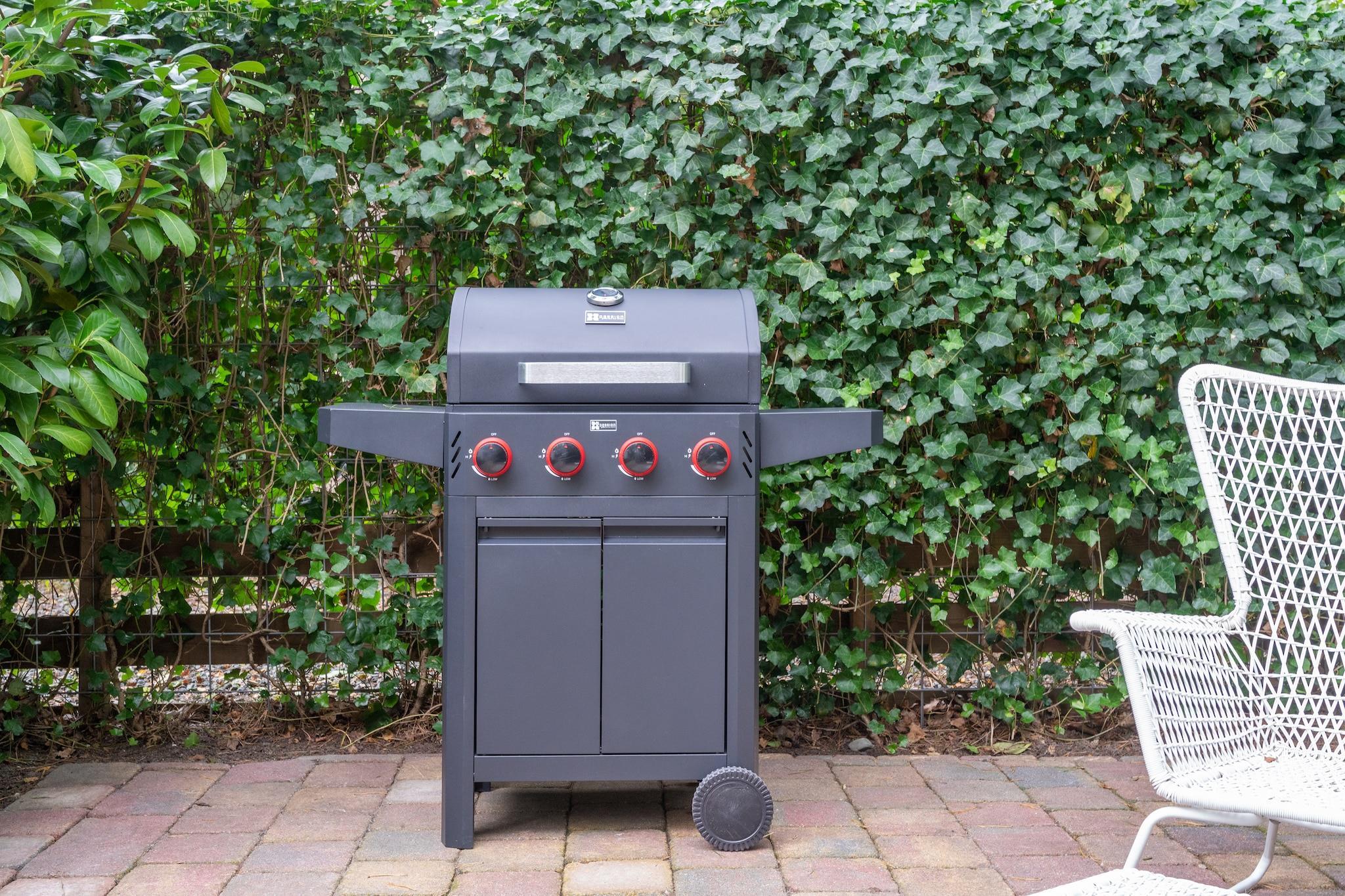 Stueetage: (åbent køkken(kogeplade, elkedel, emhætte, kaffemaskine, ovn, mikrobølgeovn, køleskab), Stue/soveværelse(dobbeltsovesofa, Fjernsyn, spisebord, sofahjørne), soveværelse(dobbeltseng), badeværelse(bruser, håndvask, toilet), veranda) varme, terrasse, have, havemøbler, grill, liggestole, loungemøbler, Haveskur