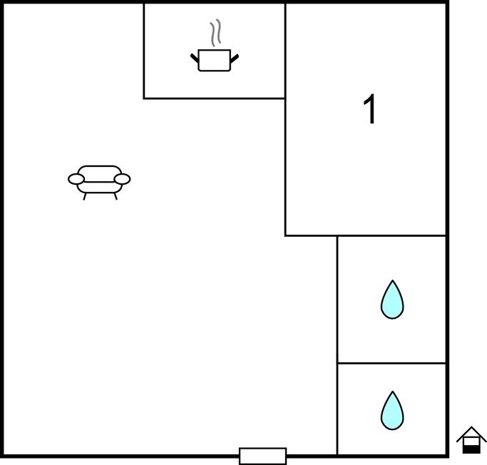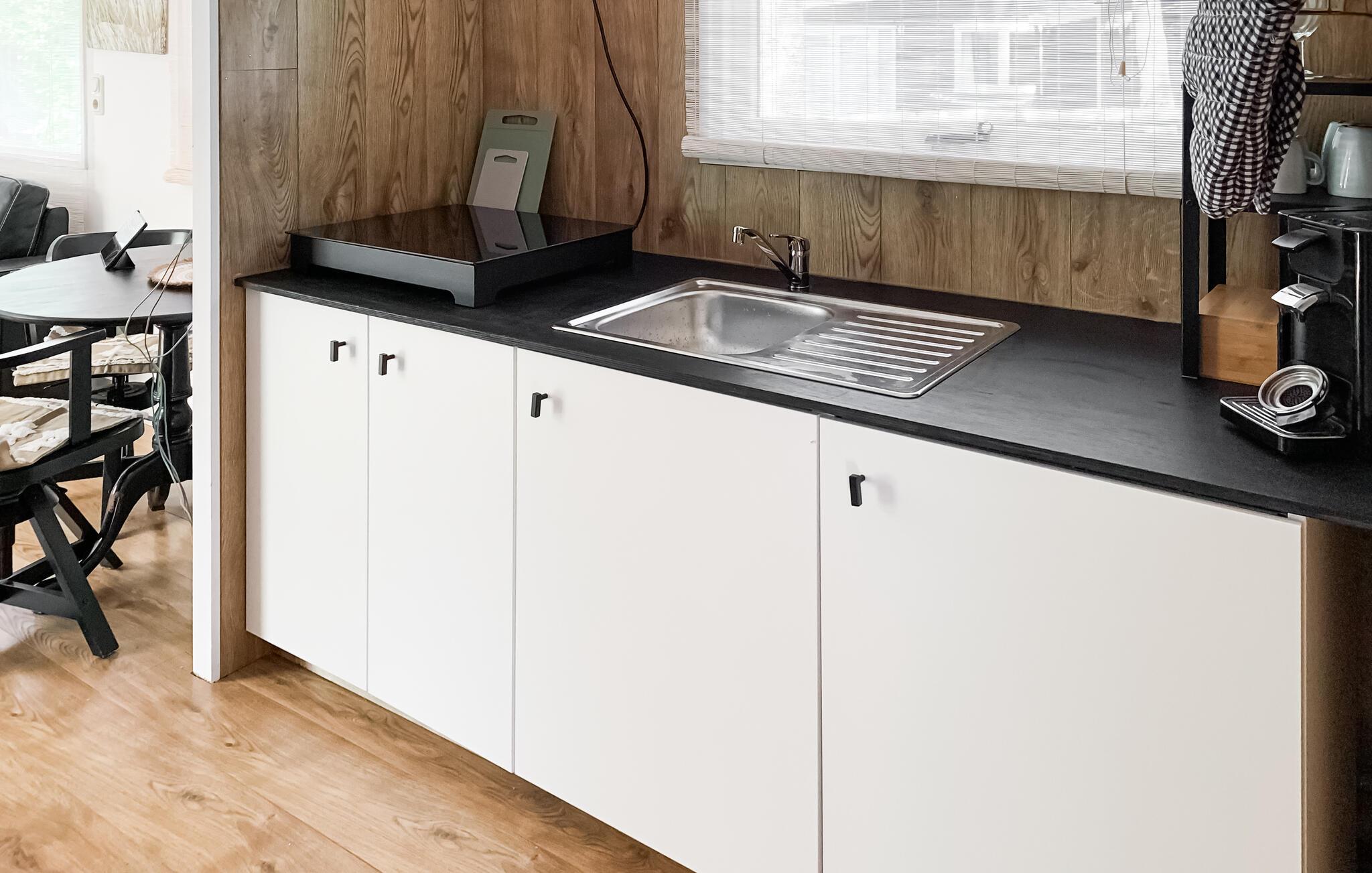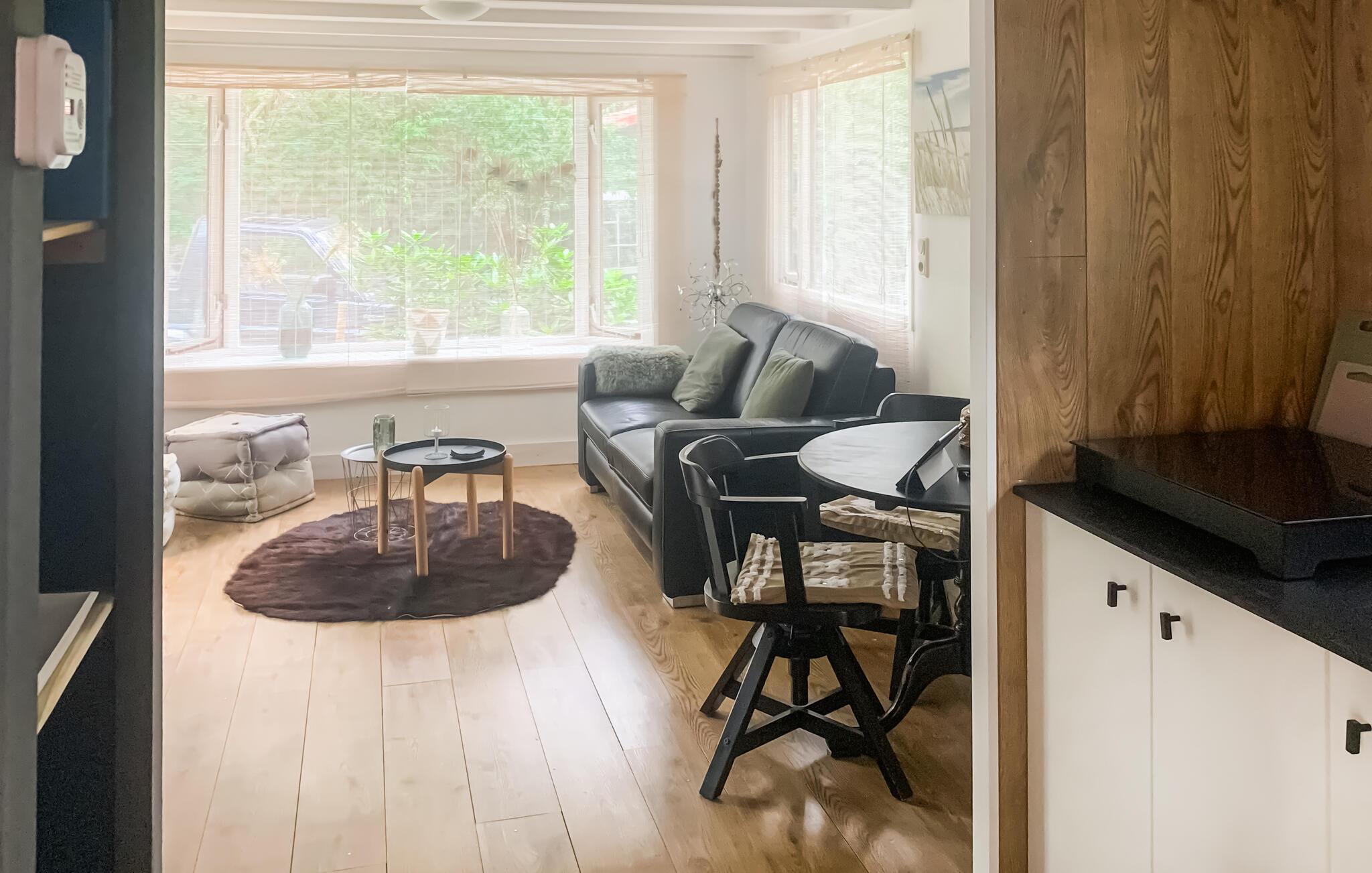 Dette moderne hus er lyst og smagfuldt indrettet. Her kan I tage jeres hund med på ferie. Ud over det store soveværelse rummer huset et køkken, badeværelse og en stue. I stuen er der en fin brændeovn.