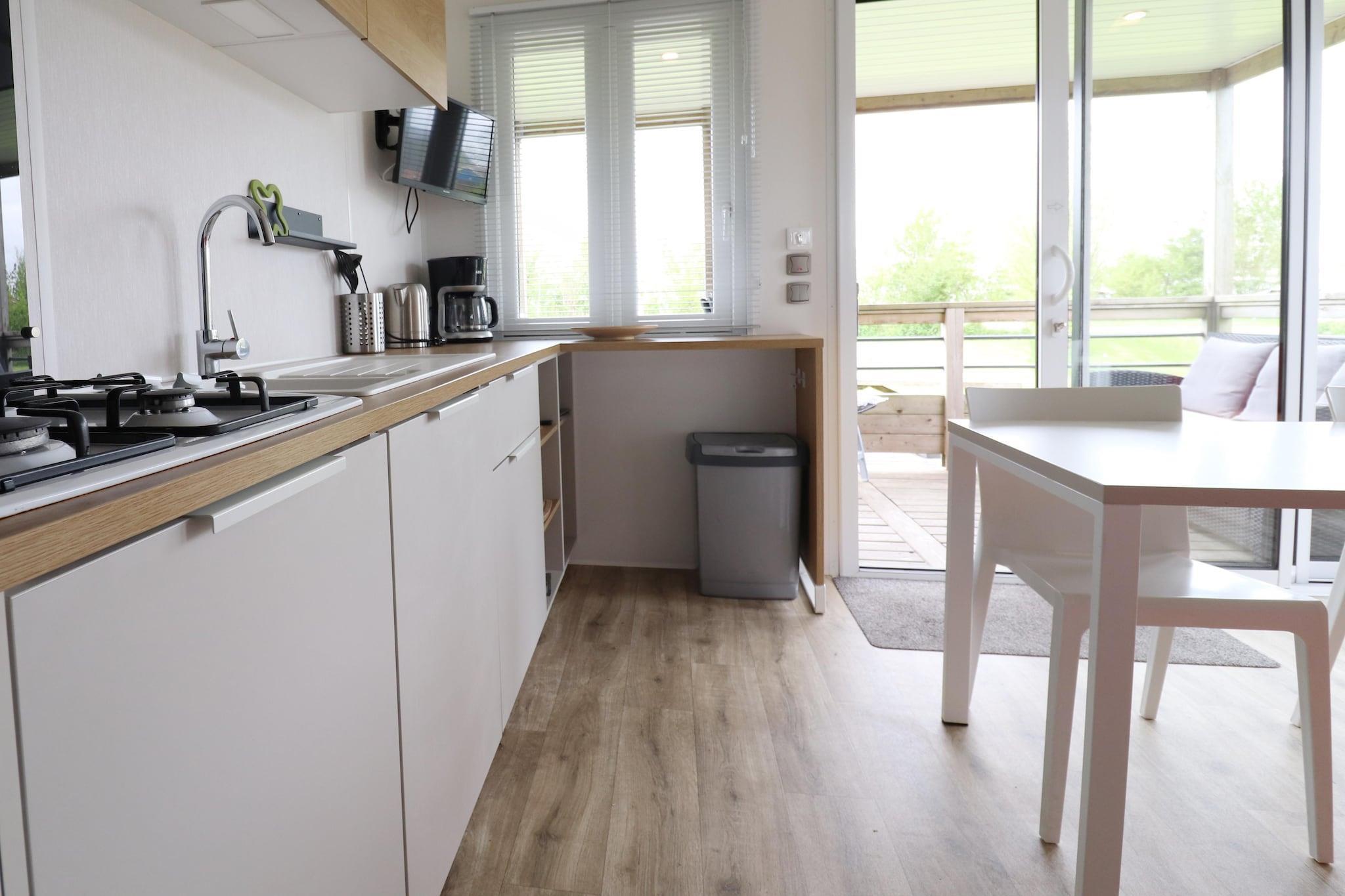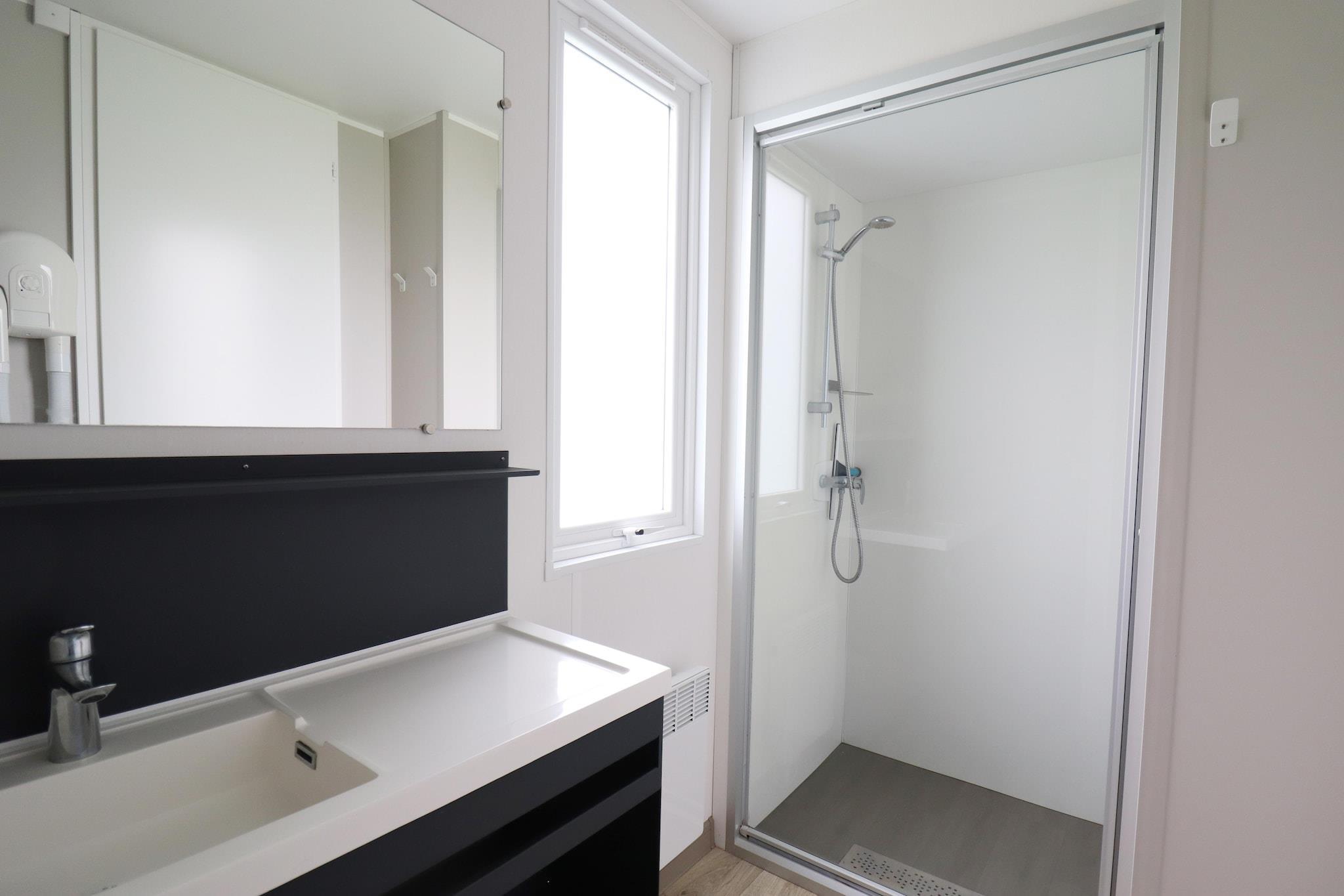Beliggende på en charmerende familiecampingplads lige ved den maleriske Hegermeer, tilbyder denne moderne terrassehytte et hyggeligt og indbydende tilflugtssted for din ferie. Den overdækkede, oplyste terrasse giver de perfekte rammer for afslappende aftener udendørs, uanset om du nyder et måltid eller blot slapper af under stjernerne. Interiøret er lyst og indbydende med en smart planløsning, der sikrer, at begge soveværelser åbner direkte ud til et smukt, moderne badeværelse. Et særligt højdepunkt er det legeområde i det ene soveværelse med en højseng, hvilket gør det særligt sjovt og velegnet til børn, mens et separat toilet øger bekvemmeligheden. Indvendigt er hytten fuldt udstyret med hensyn til komfort og praktisk anvendelighed. Køkkenet har alt det nødvendige til at tilberede måltider, og stuen har et fjernsyn til underholdning. Både opholdsstuen og badeværelset er udstyret med elektrisk varme, hvilket sikrer en hyggelig atmosfære selv på køligere dage. Vinduerne er udstyret med myggenet og mørklægningsgardiner, så du kan nyde afslappende nætter og frisk brise uden forstyrrelser. Beliggenheden tilbyder direkte adgang til Hegermeer, hvor der er skabt en dejlig havn til vandaktiviteter. Her kan du leje en slup eller sejlbåd på stedet eller tage en forfriskende dukkert i søen. En gåtur ind til den nærliggende landsby Heeg kan varmt anbefales, med dens charmerende terrasser ved vandet og butikker, der tilbyder lokale lækkerier. På campingpladsen kan familier nyde et opholdsrum med bordfodbold og forskellige spil samt en legeplads for børn, hvilket gør dette chalet til den perfekte base for en aktiv og afslappende familieferie.