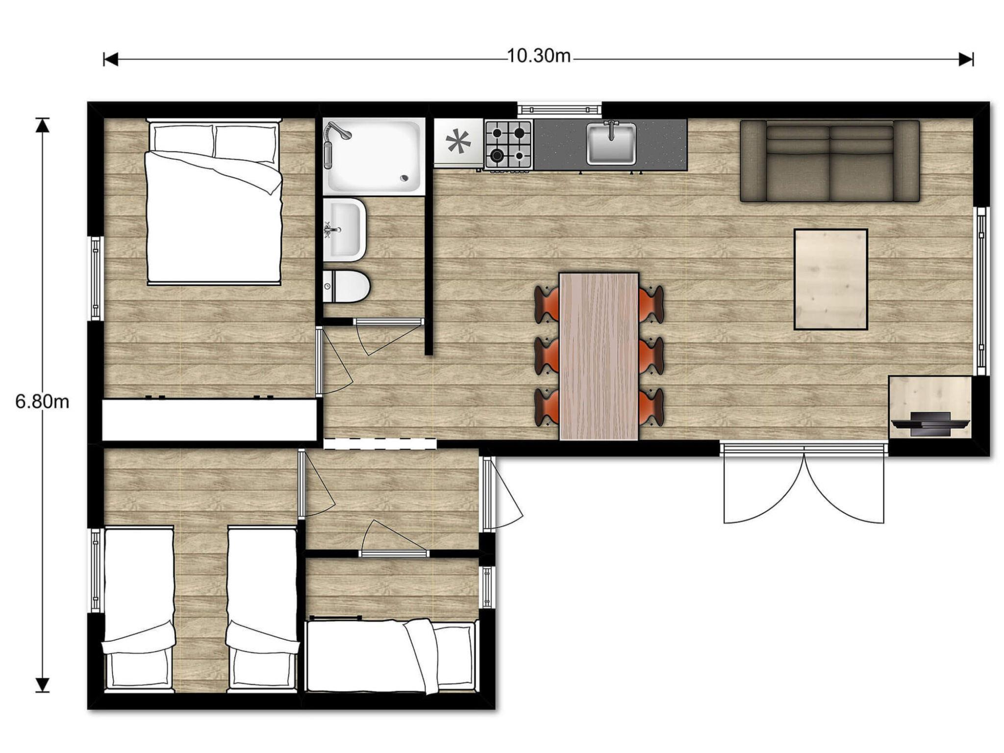 "Stelleplas", 4-room chalet 52 m2. Living/dining room with dining table and TV. Exit to the terrace. 1 room with 1 double bed. 1 room with 2 beds. 1 room with 1 x 2 bunk beds. Open kitchen (oven, dishwasher, Gas stove, kettle, microwave, electric coffee machine). Shower/WC. Heating. Terrace. Terrace furniture. Facilities: children's high chair, baby cot. Internet (WiFi, free). Please note: non-smokers only. Smoke alarm. Bookings accepted for holiday purposes only.