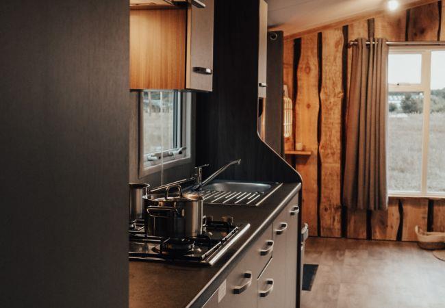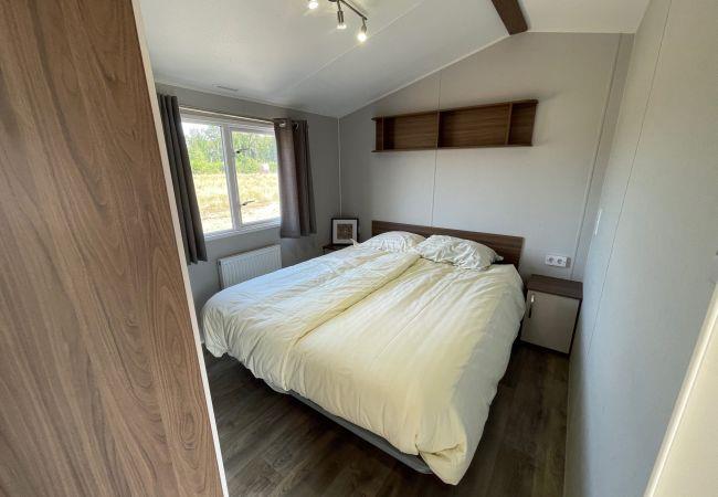 The chalet has a lovely living room with a seating area and a dining table, where you can relax after a day outdoors. Through the double garden doors, you step directly onto the terrace, where you can enjoy the view of nature. The chalet is equipped with all conveniences, such as free WiFi, an electric stove for colder days and central heating. The kitchen is fully equipped, with a gas cooker, extractor hood, coffee maker and a fridge/freezer combination, so you have all the freedom to cook for yourself.