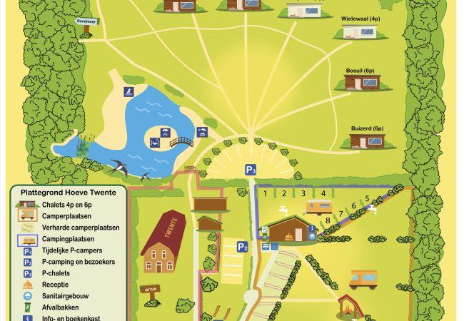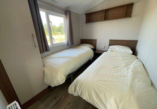 The chalet has two bedrooms. One with a double bed and the other with two single beds. In the spacious bedroom with the double bed, you will find a large wardrobe and two bedside tables. The bathroom is equipped with a washbasin, mirror, shower and toilet. Bed linen is included, but kitchen linen is not present and can be brought along or booked additionally..