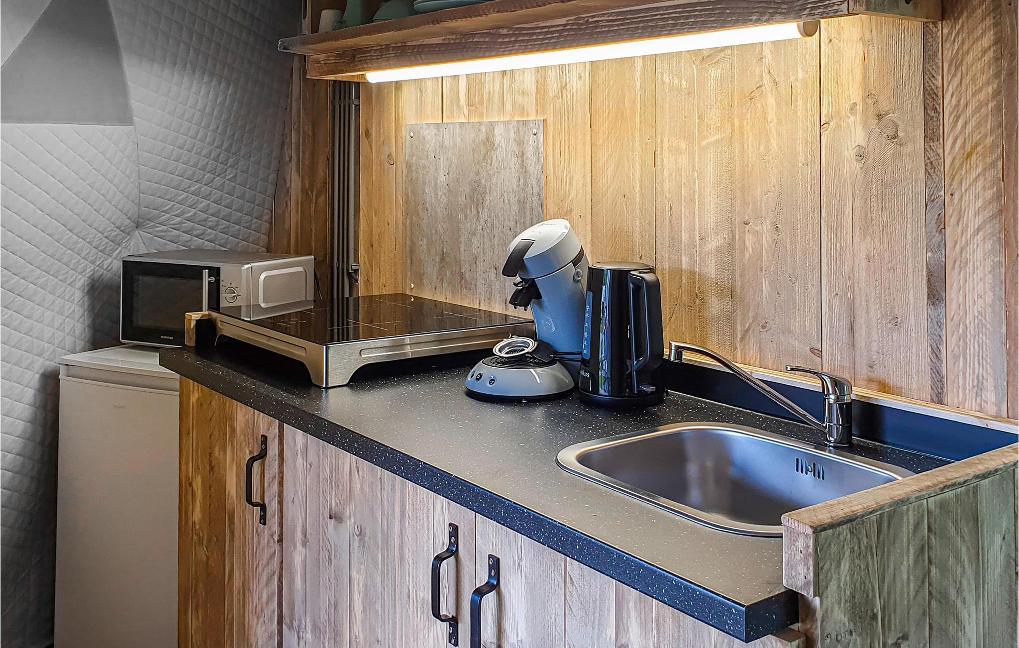 Jeres telt er udstyret med en træterrasse, hvor I kan sætte jer og slappe af i solen efter jeres oplevelser ude i området. Teltet er bygget som et lille sommerhus, hvor der er værelser, og samtidig har I gode rammer til at samles i opholdsrummet med køkken. Teltet er indrettet med træmøbler både inde og ude. Nyd dagens første solstråler på terrassen, mens I slubrer kaffe og lægger jer fast på nogle spændende aktiviteter.