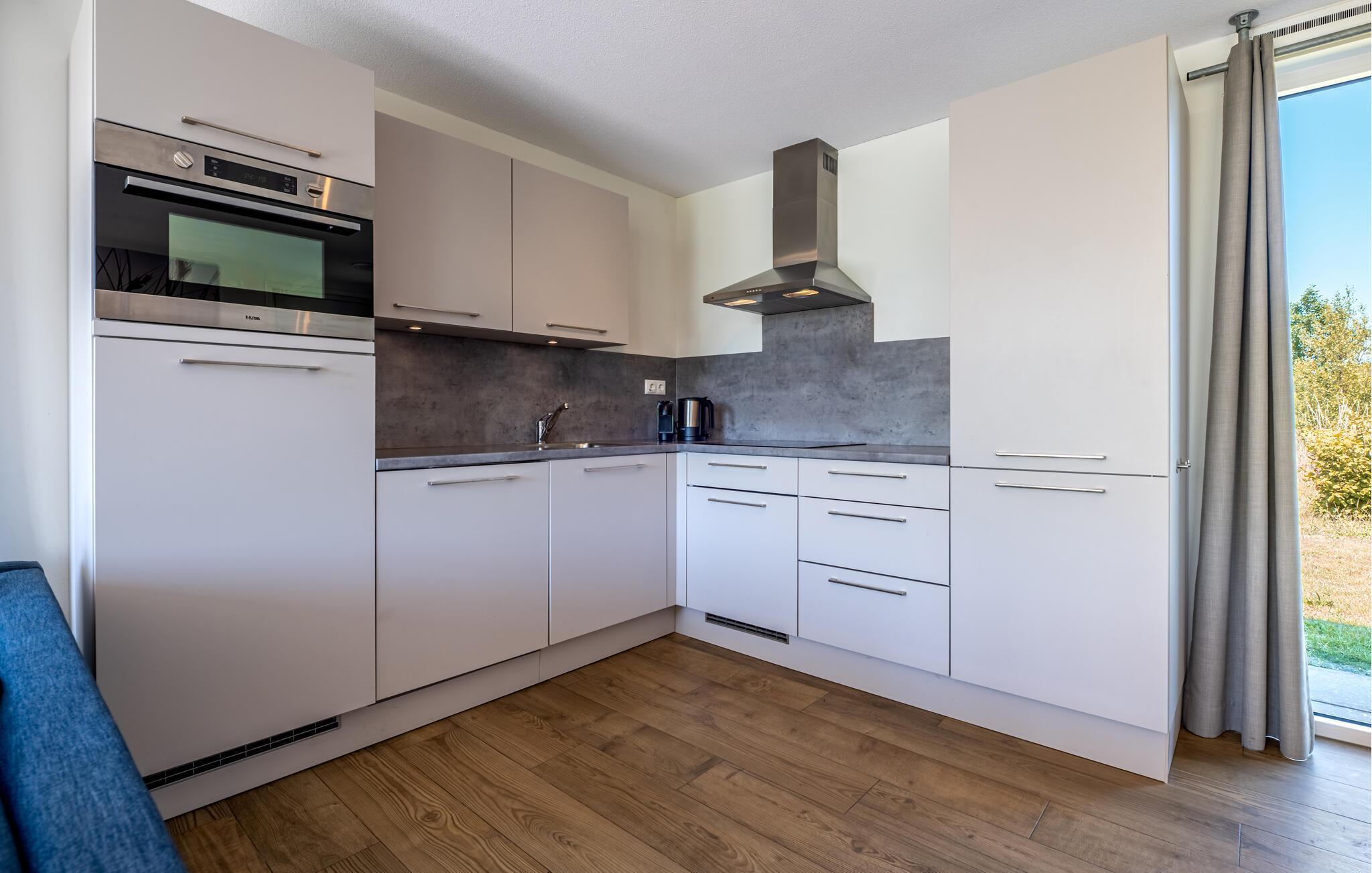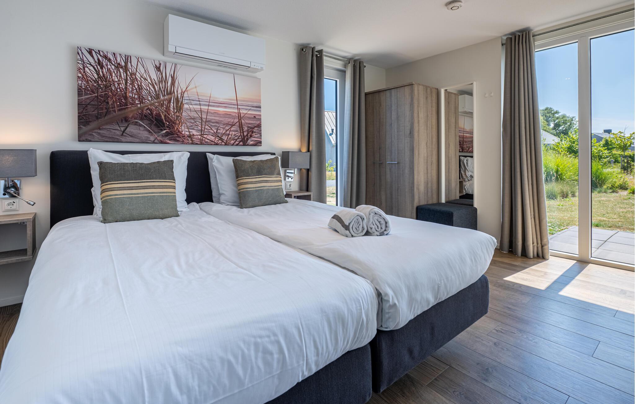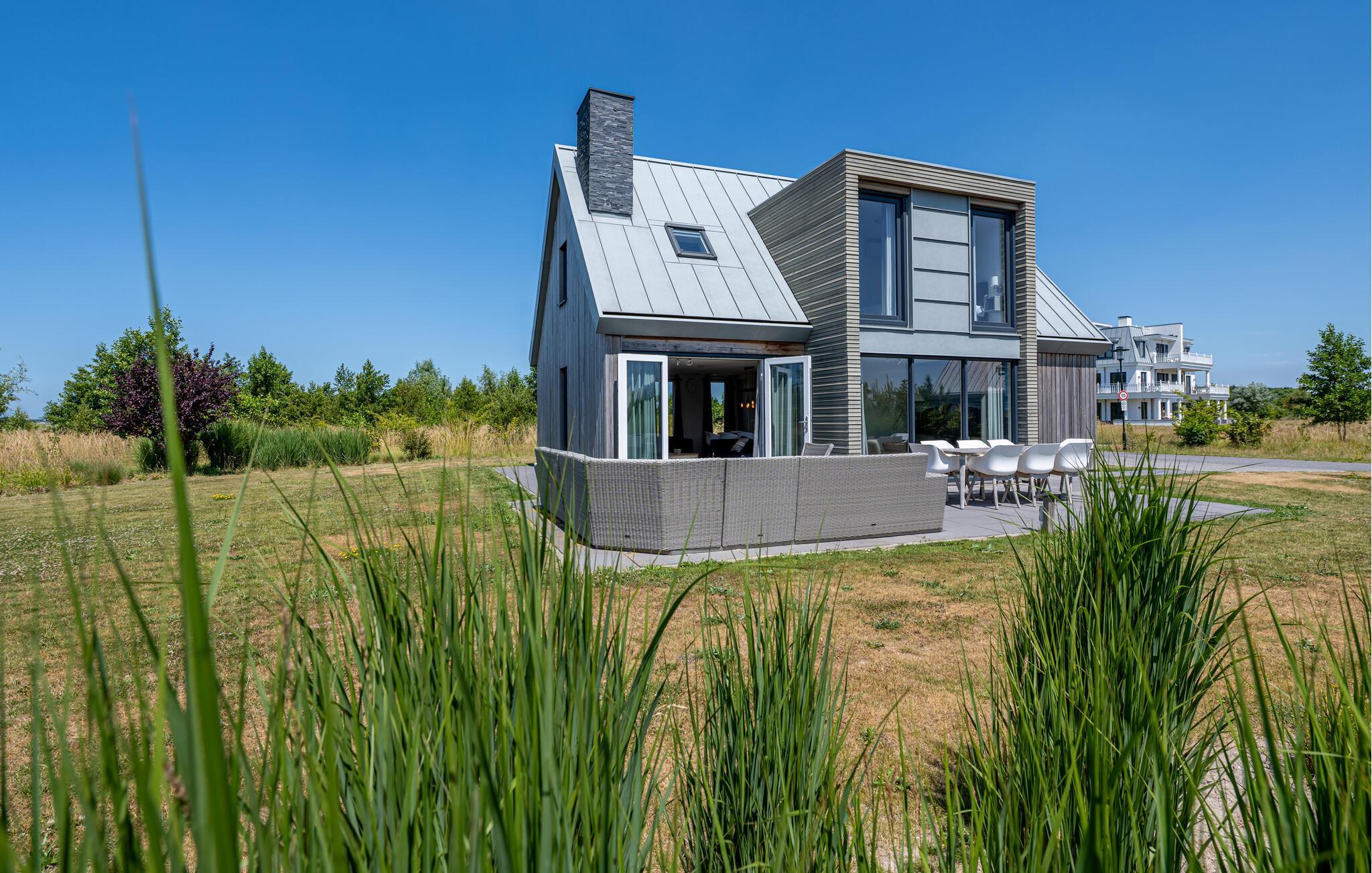 Denne moderne og luksuriøse villa, der ligger meget tæt på stranden, giver jer det perfekte sted at slappe af. De stilfulde møbler og den lyse, maritime atmosfære skaber en rolig og indbydende atmosfære. Her har I masser af plads til at nyde tiden med familie eller venner. Saml jer i den åbne stue, der problemfrit kombinerer køkken, spisestue og opholdsstue og lægger op til at lave mad, spise eller slappe af sammen. I varmt vejr sørger airconditionen i stueetagen og i soveværelserne ovenpå for nedkøling. Badeværelserne har regnbruser. Fra haven har I en storslået udsigt over det vidtstrakte polderlandskab.